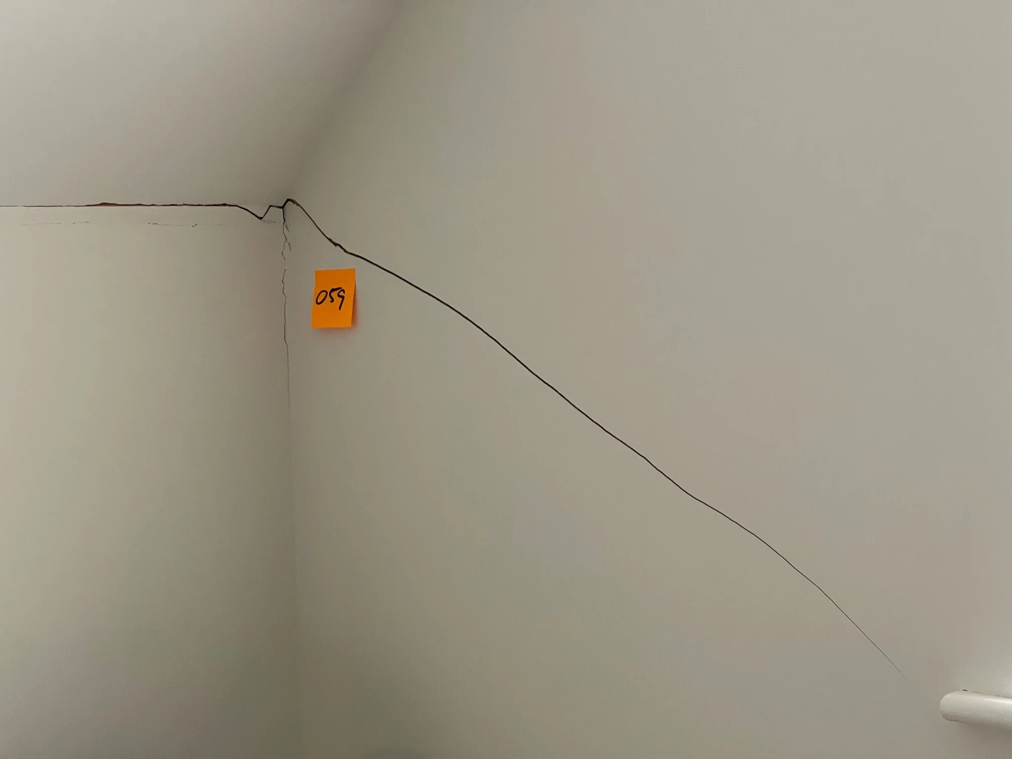 Crack on a beige wall with a sticky note labeled '059' above it.