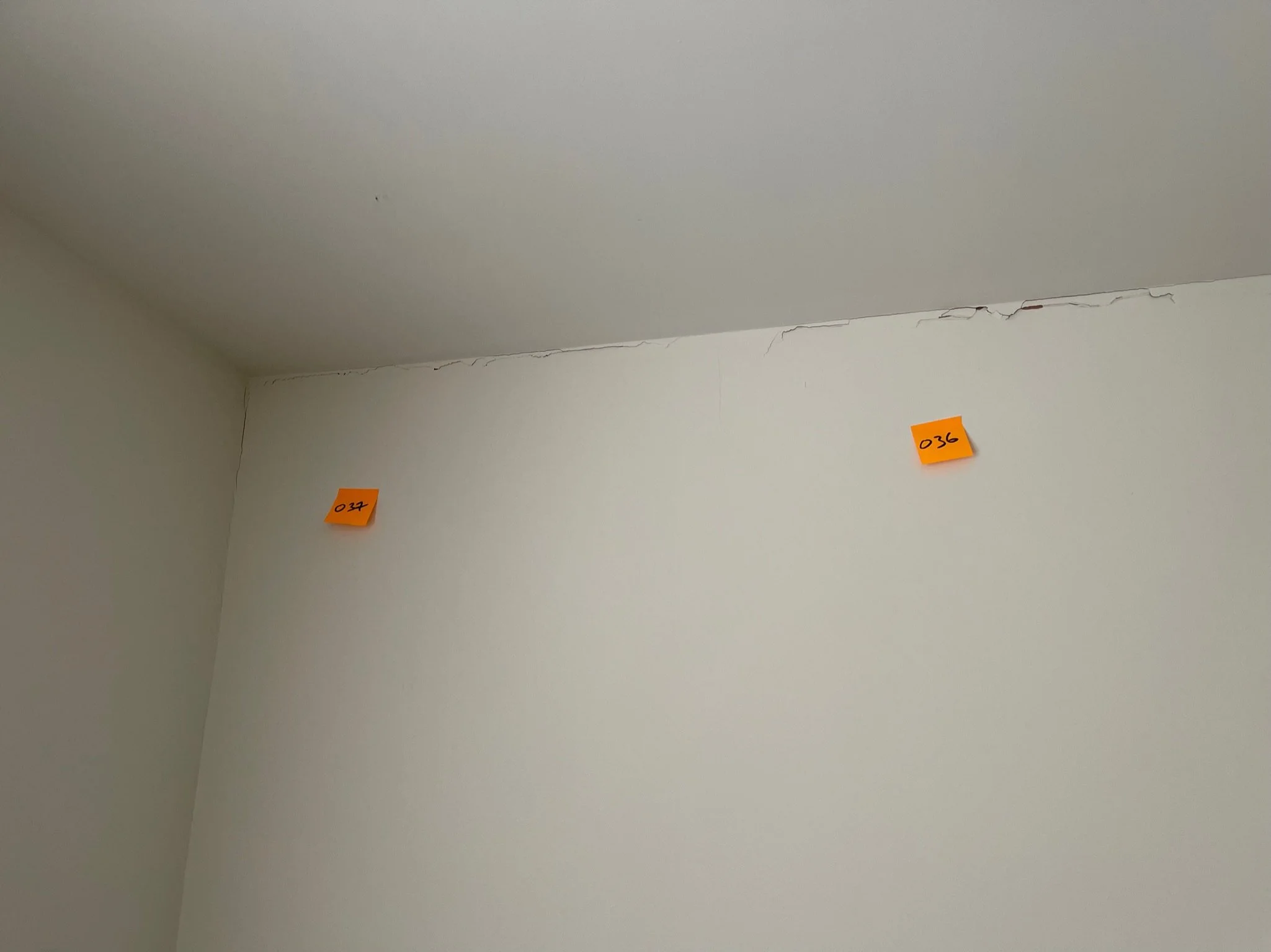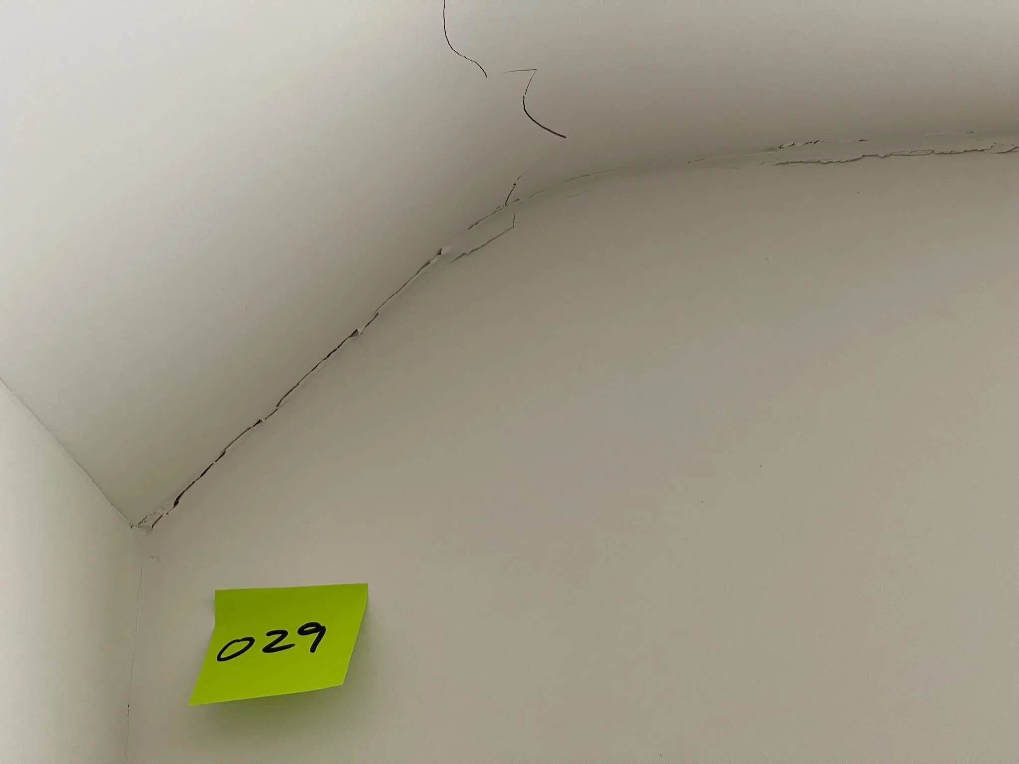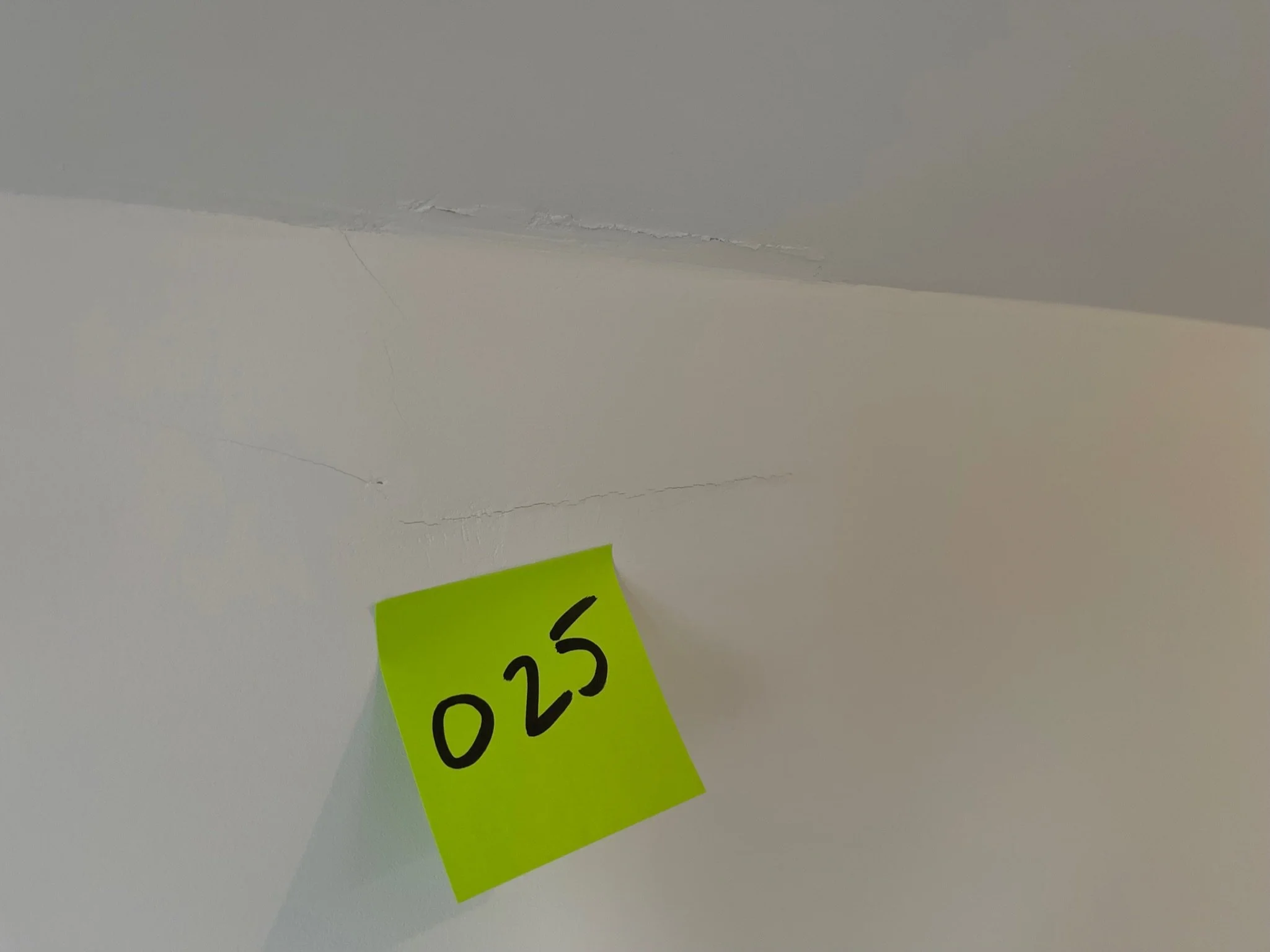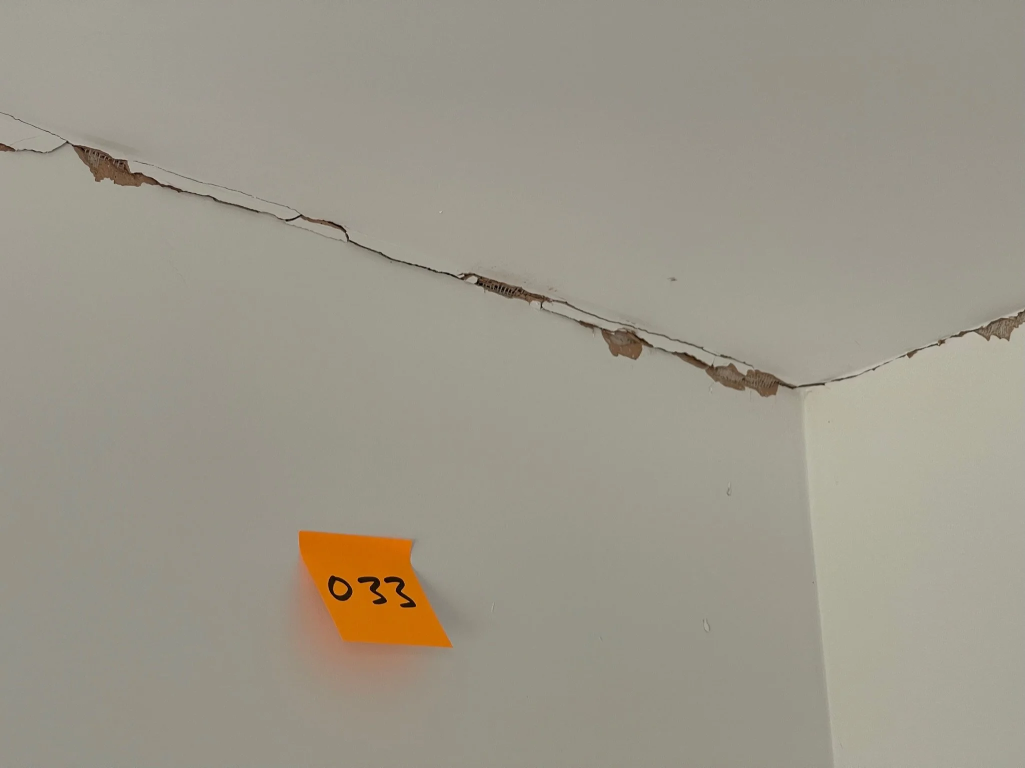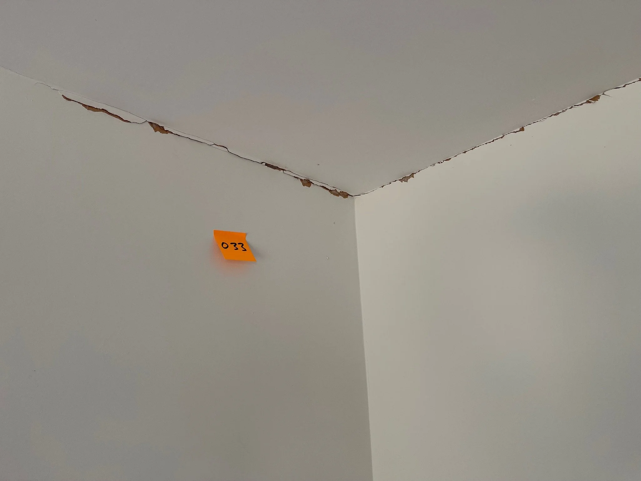 Corner of a room with cracks along the ceiling and wall, featuring an orange sticky note labeled "027".