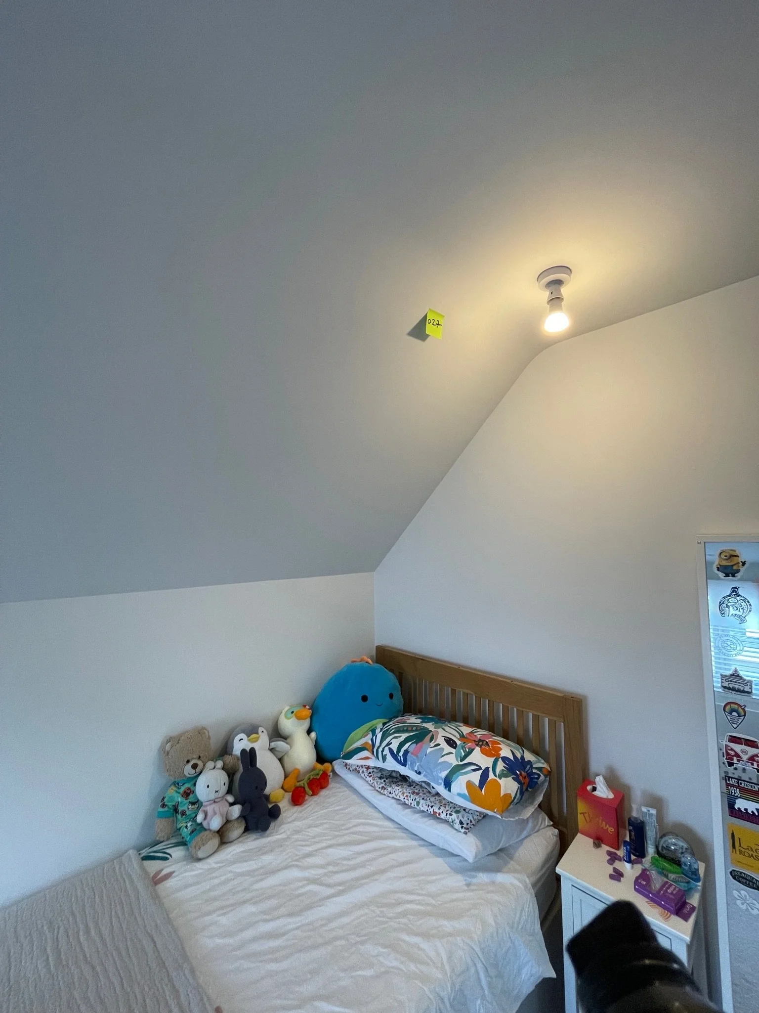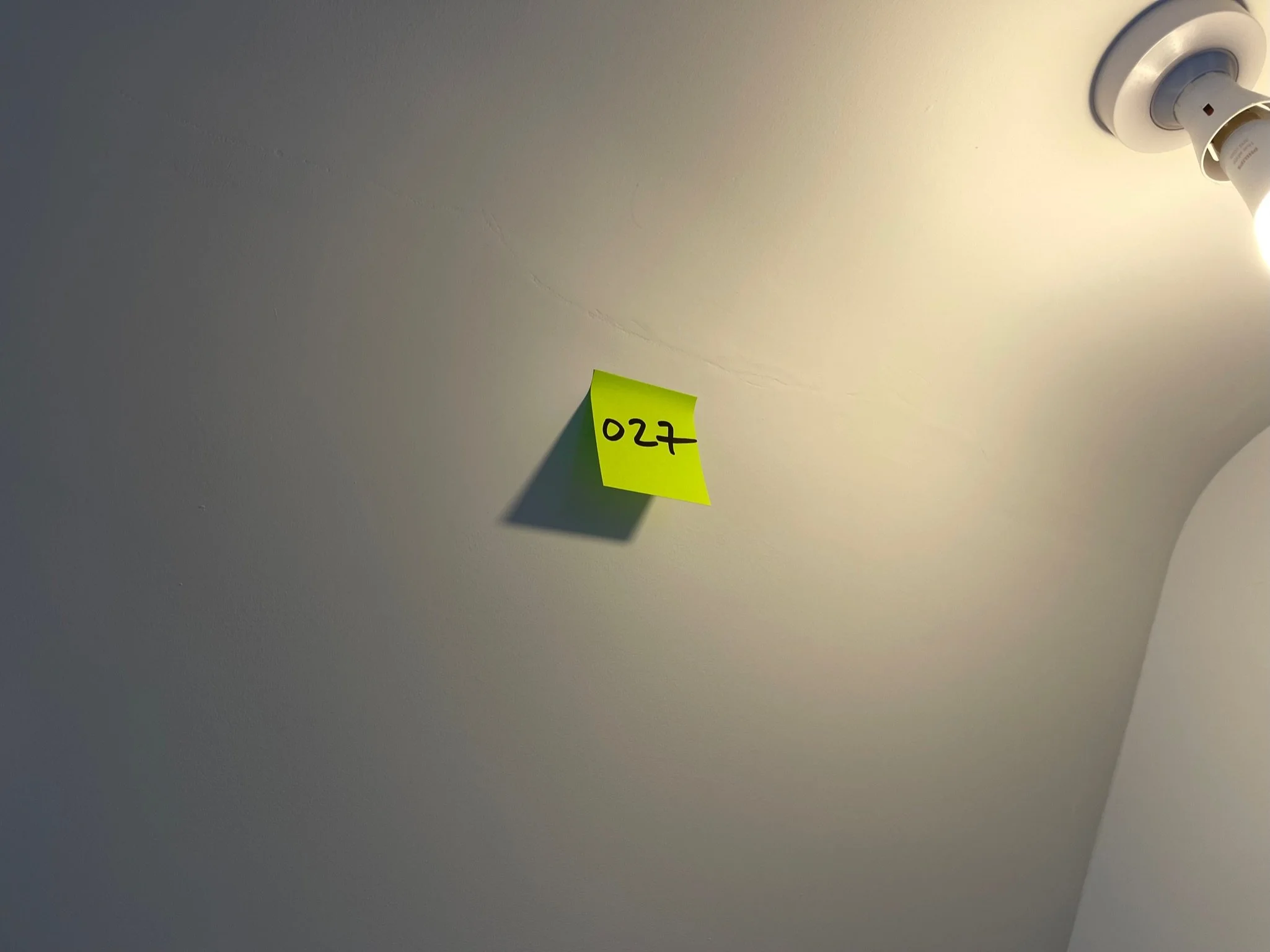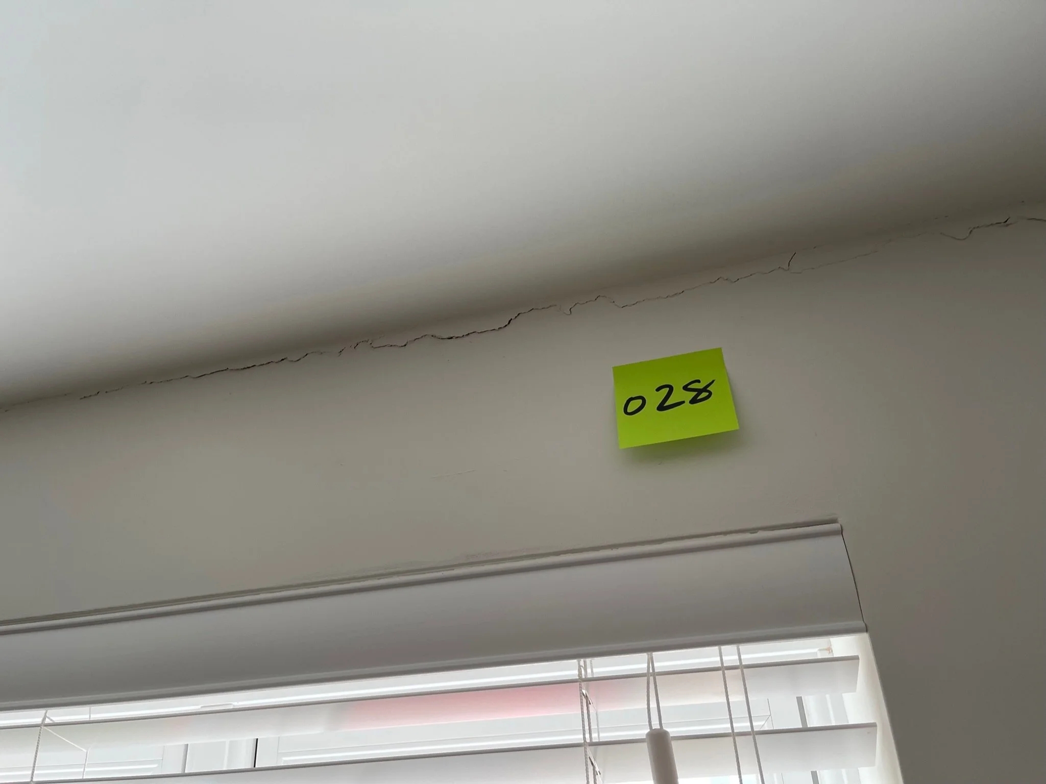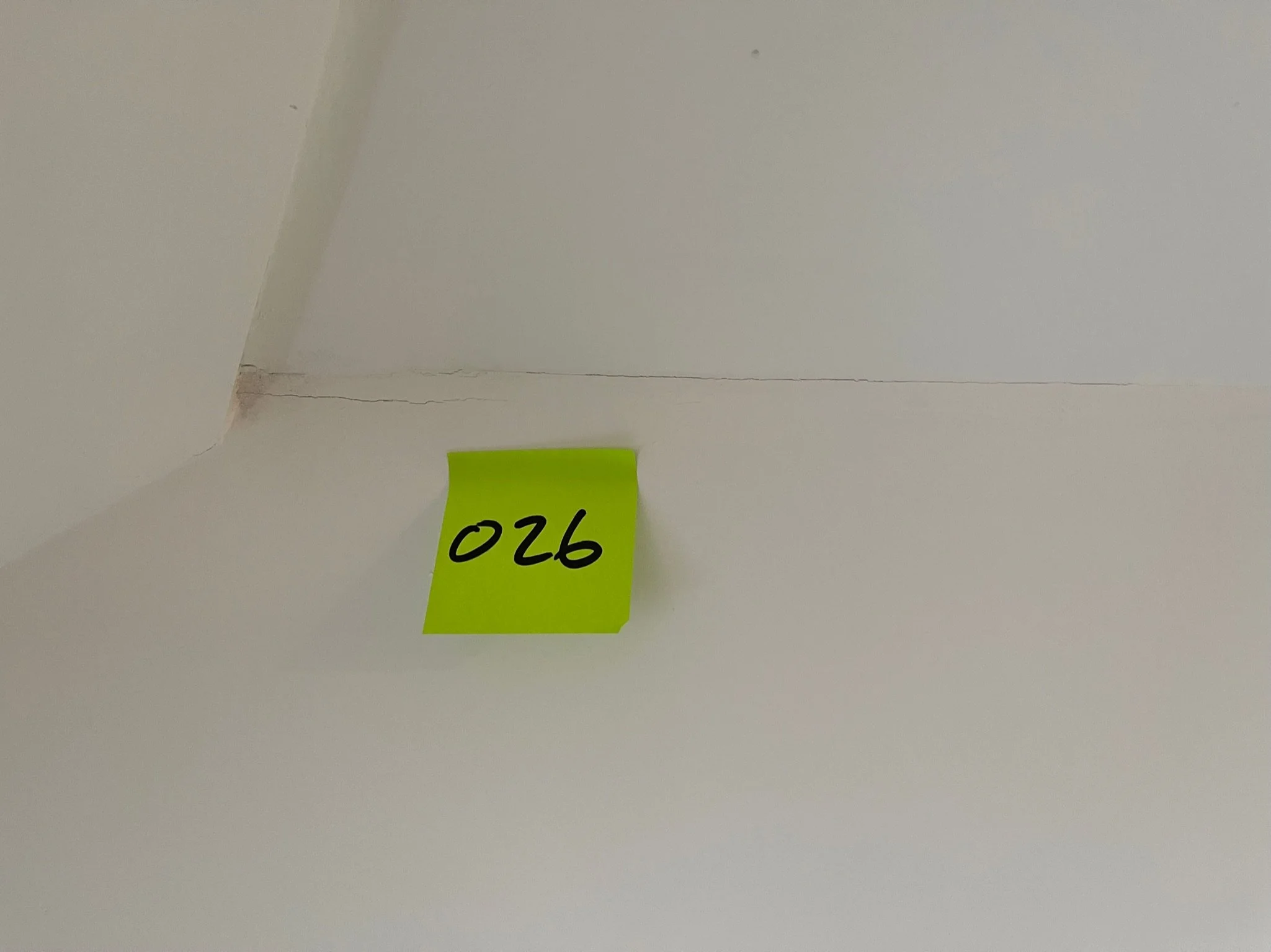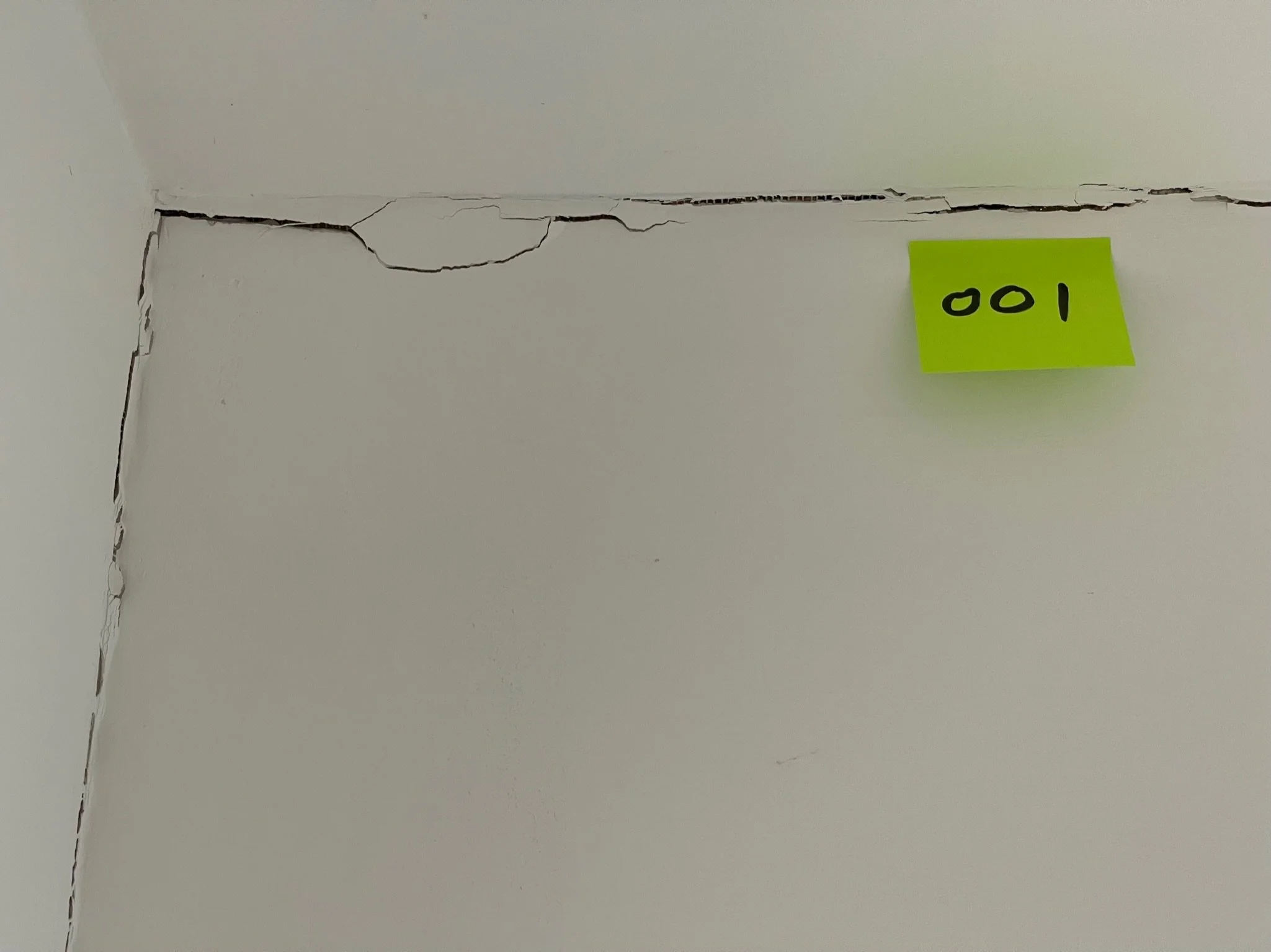Corner of a room with cracks along the ceiling and wall, featuring an orange sticky note labeled "027".