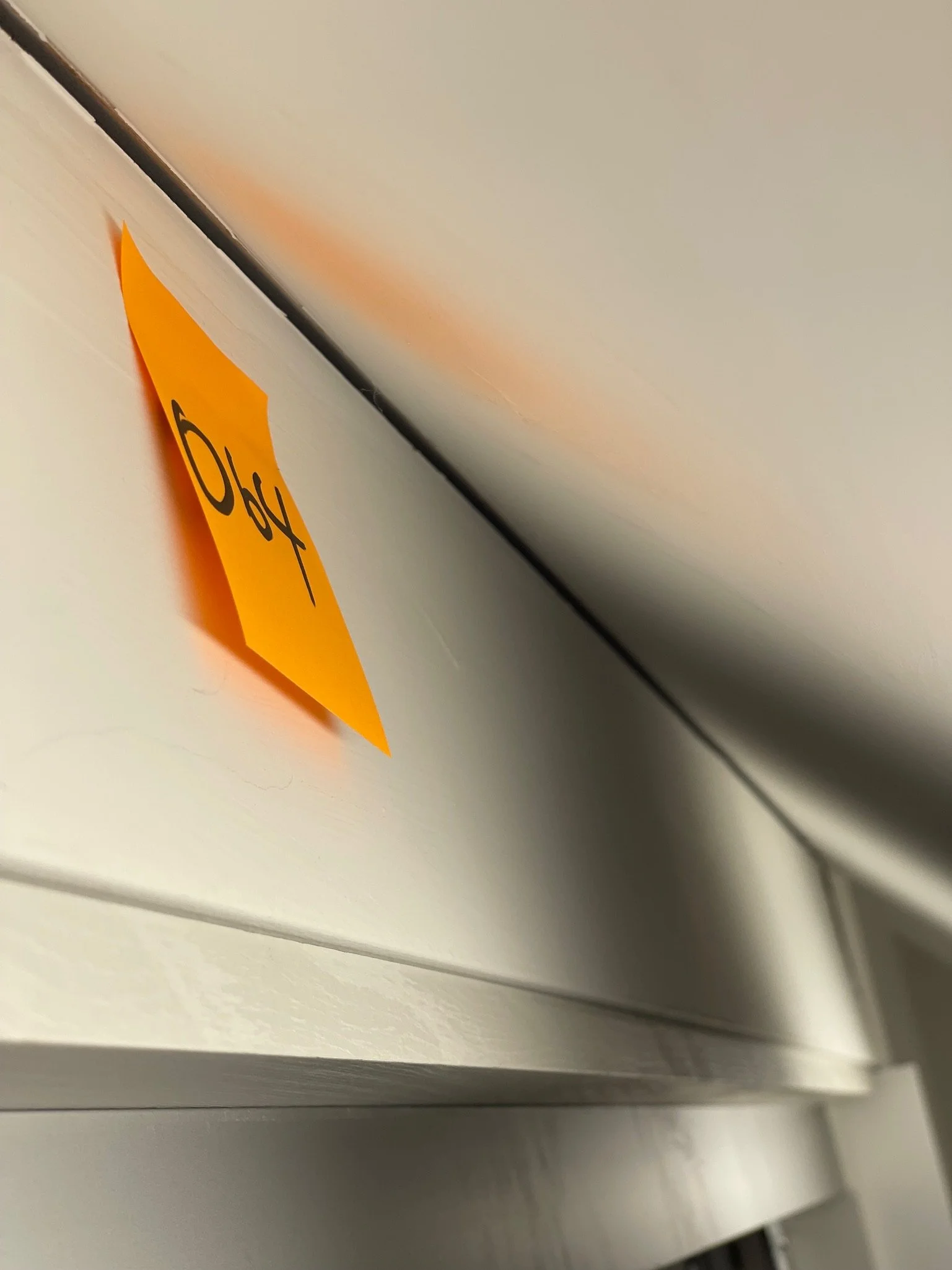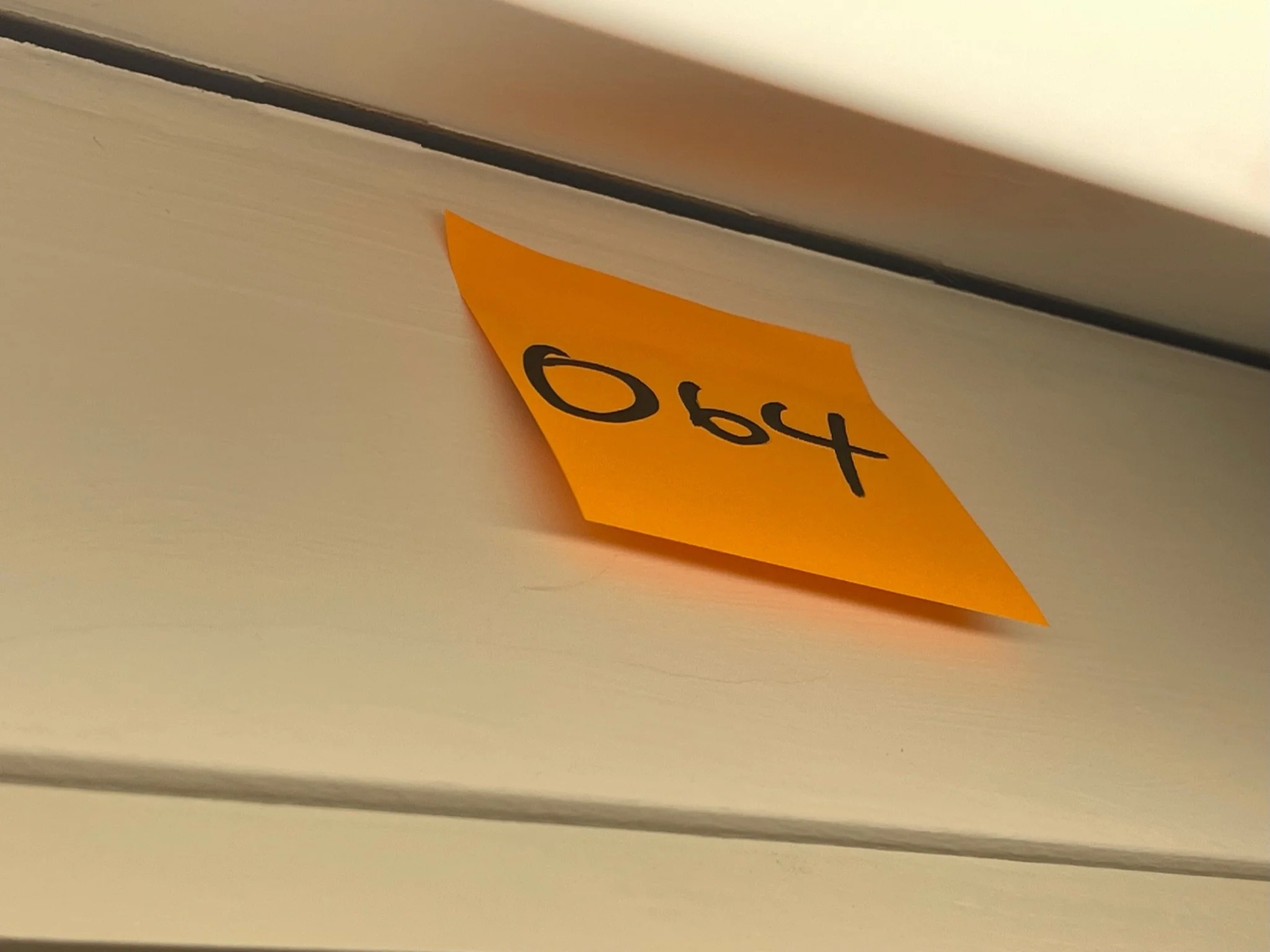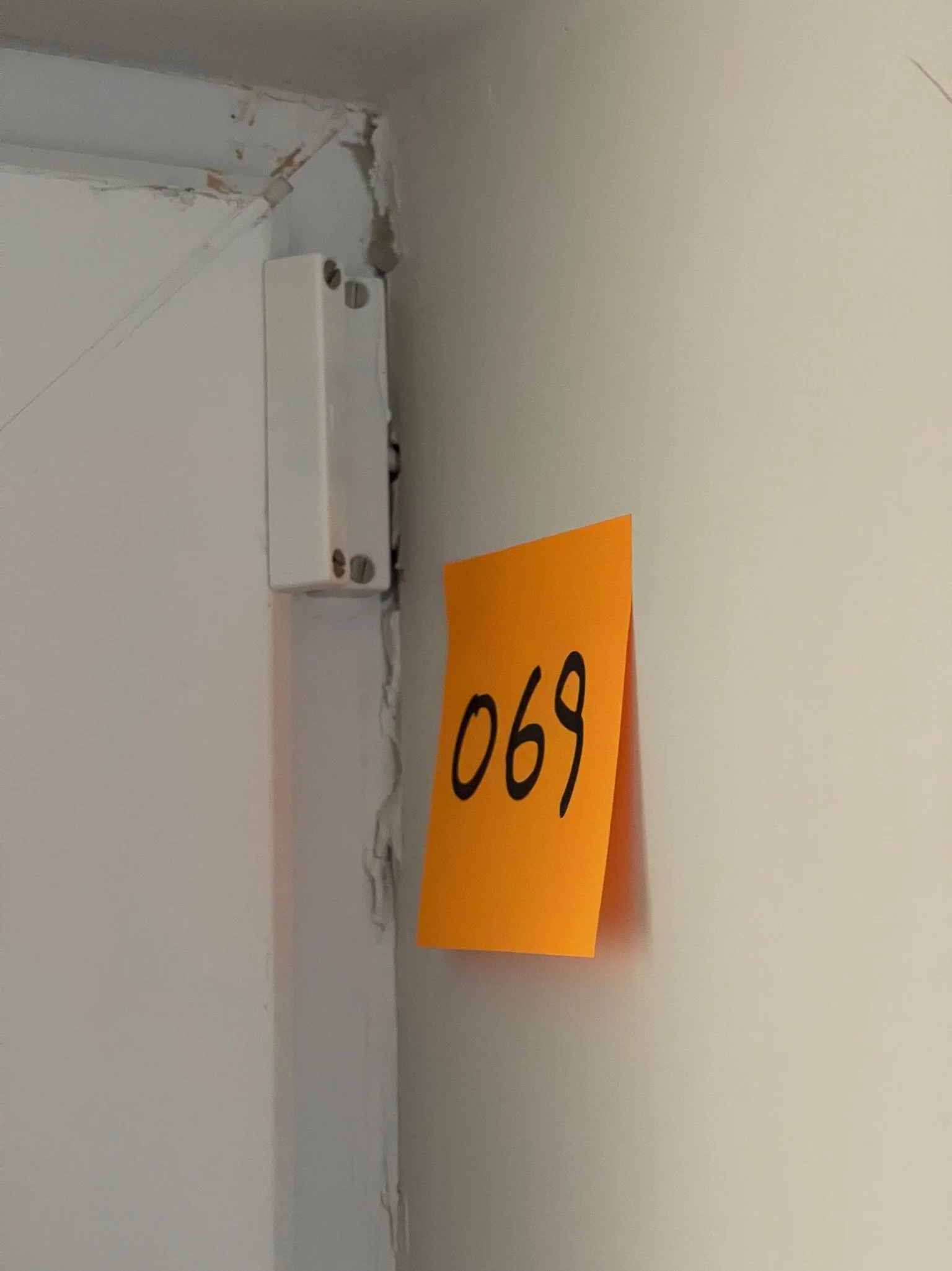 Orange sticky note with "069" on wall near door frame