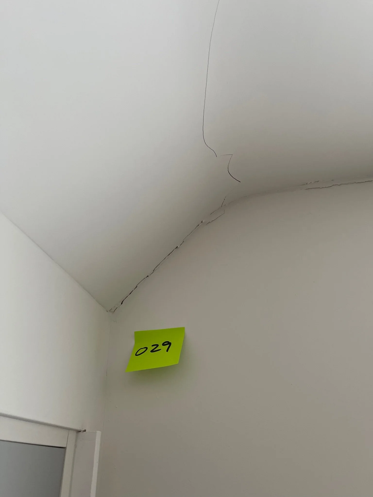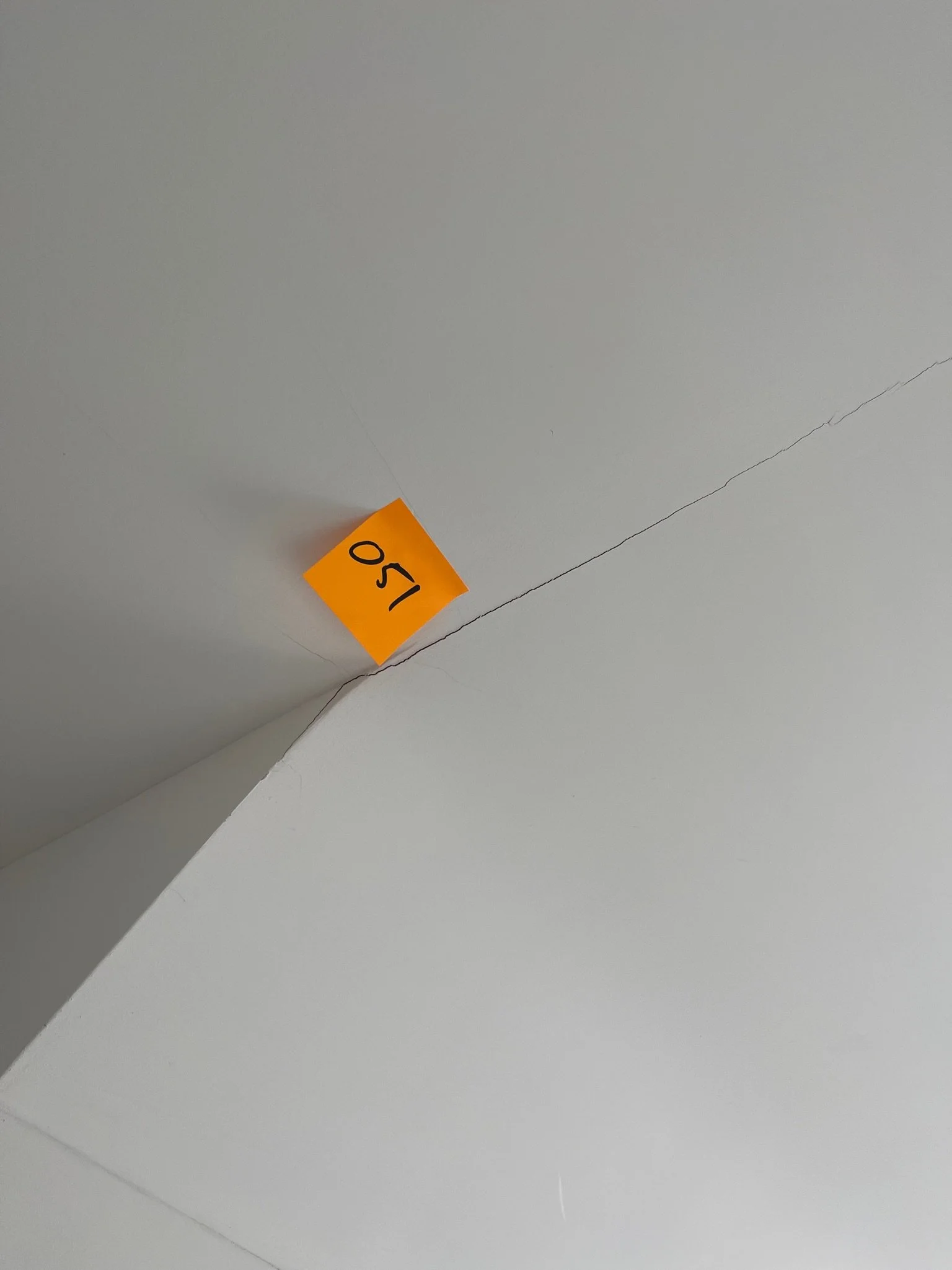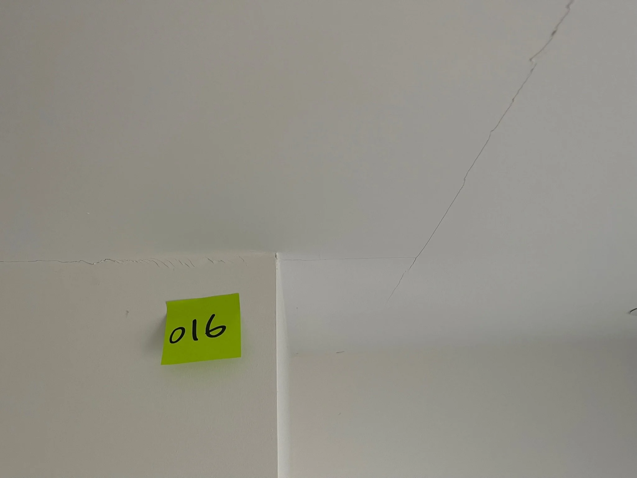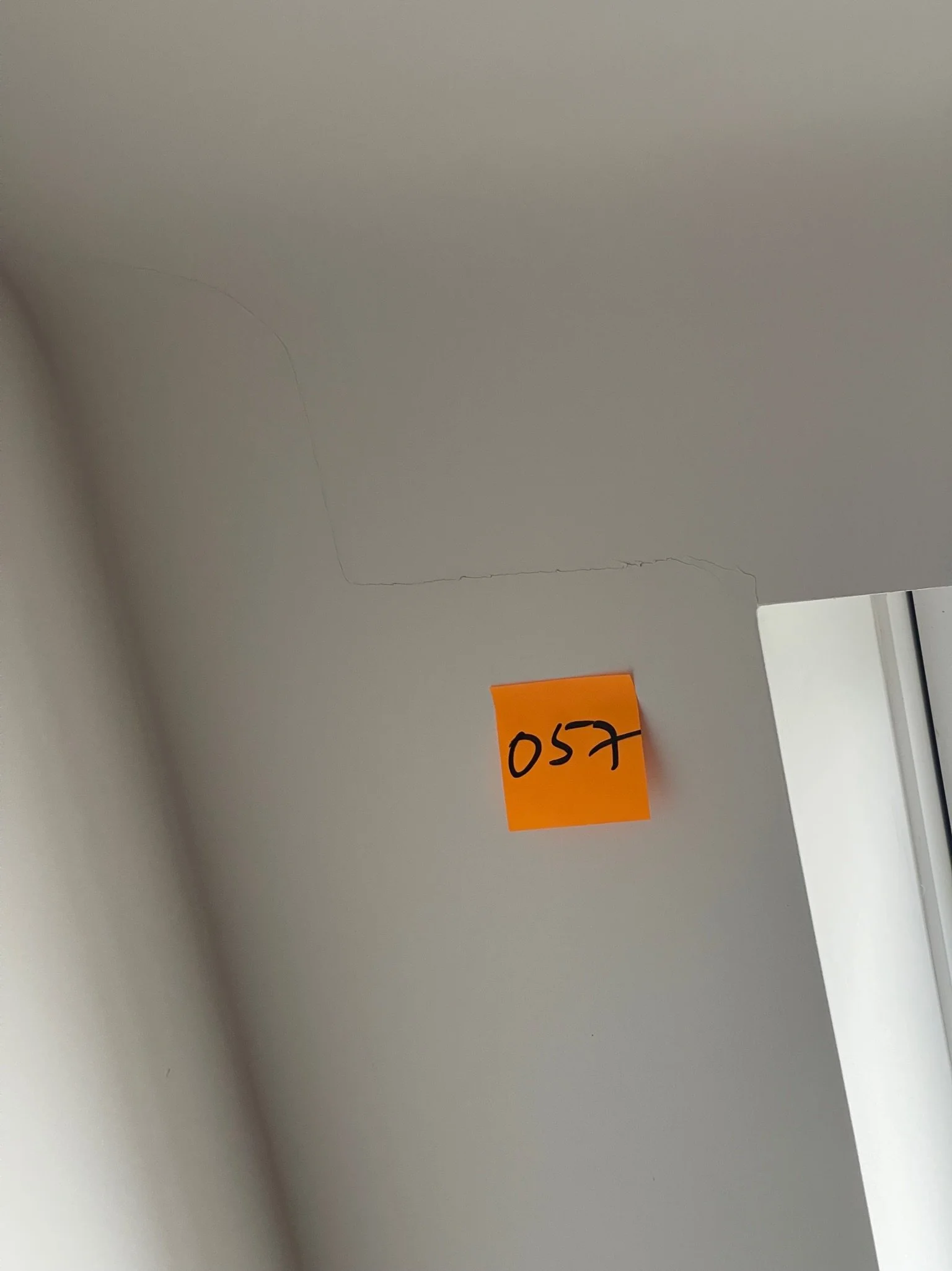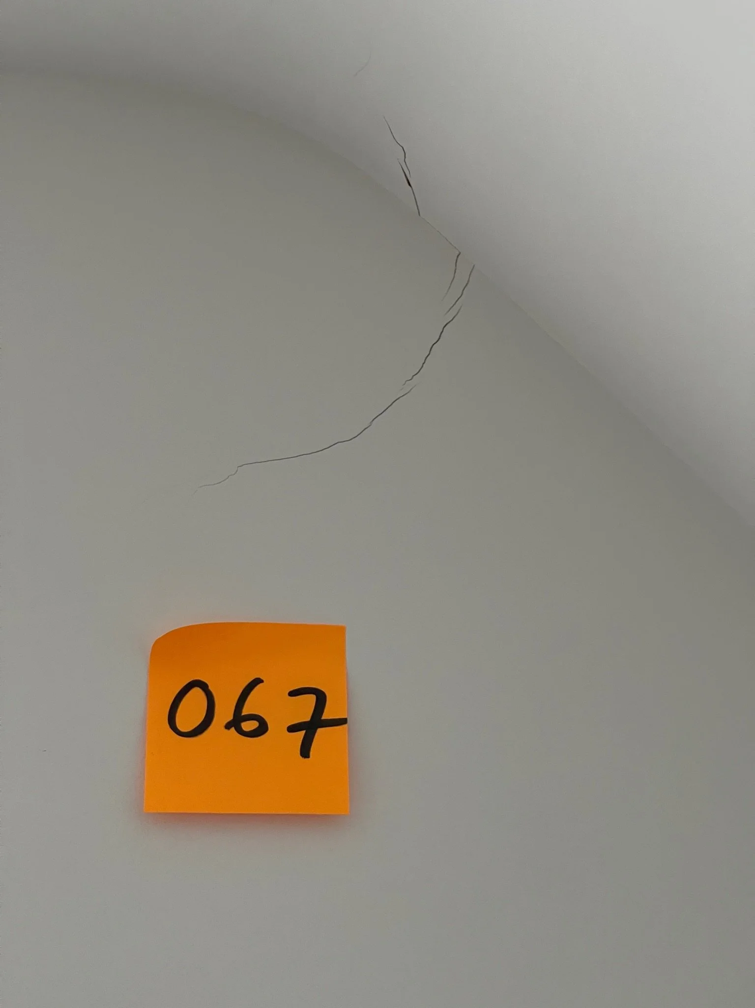 Ceiling corner with a visible crack and an orange sticky note labeled "067"