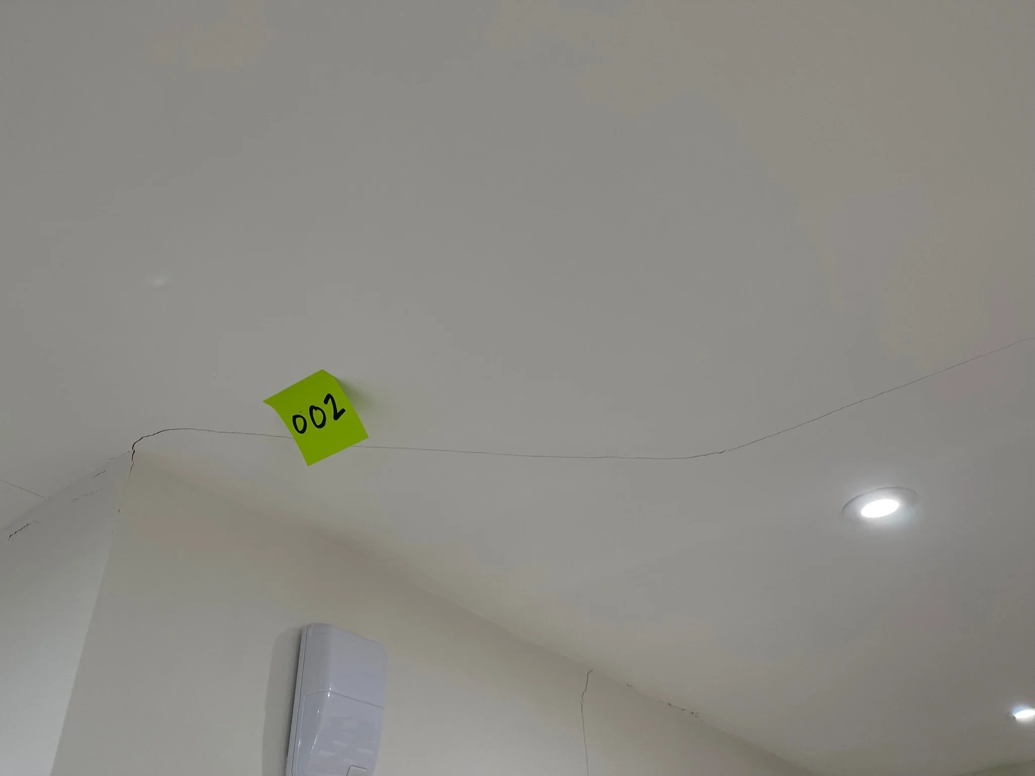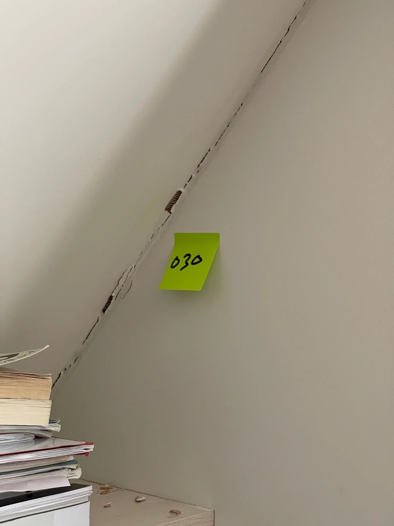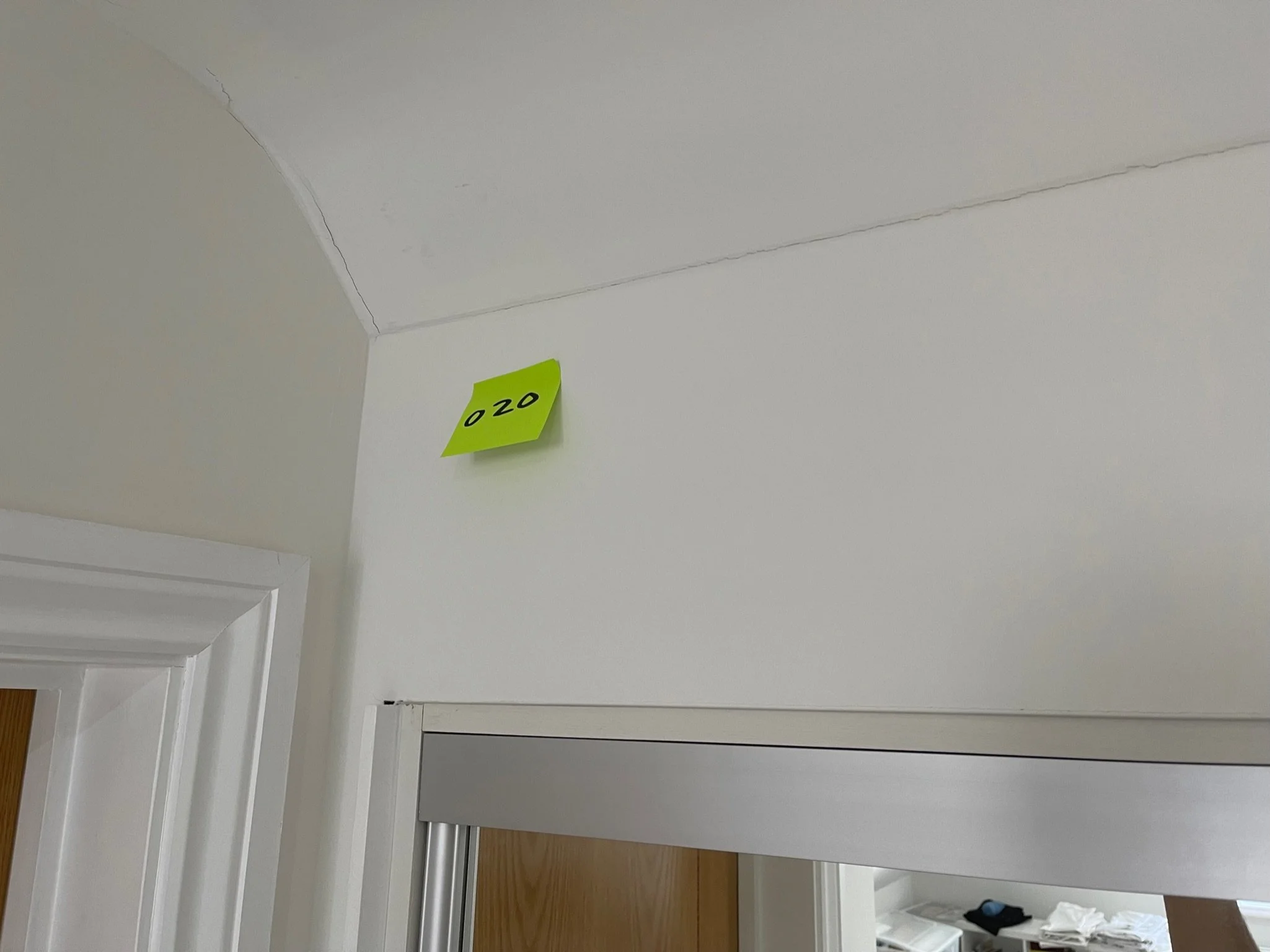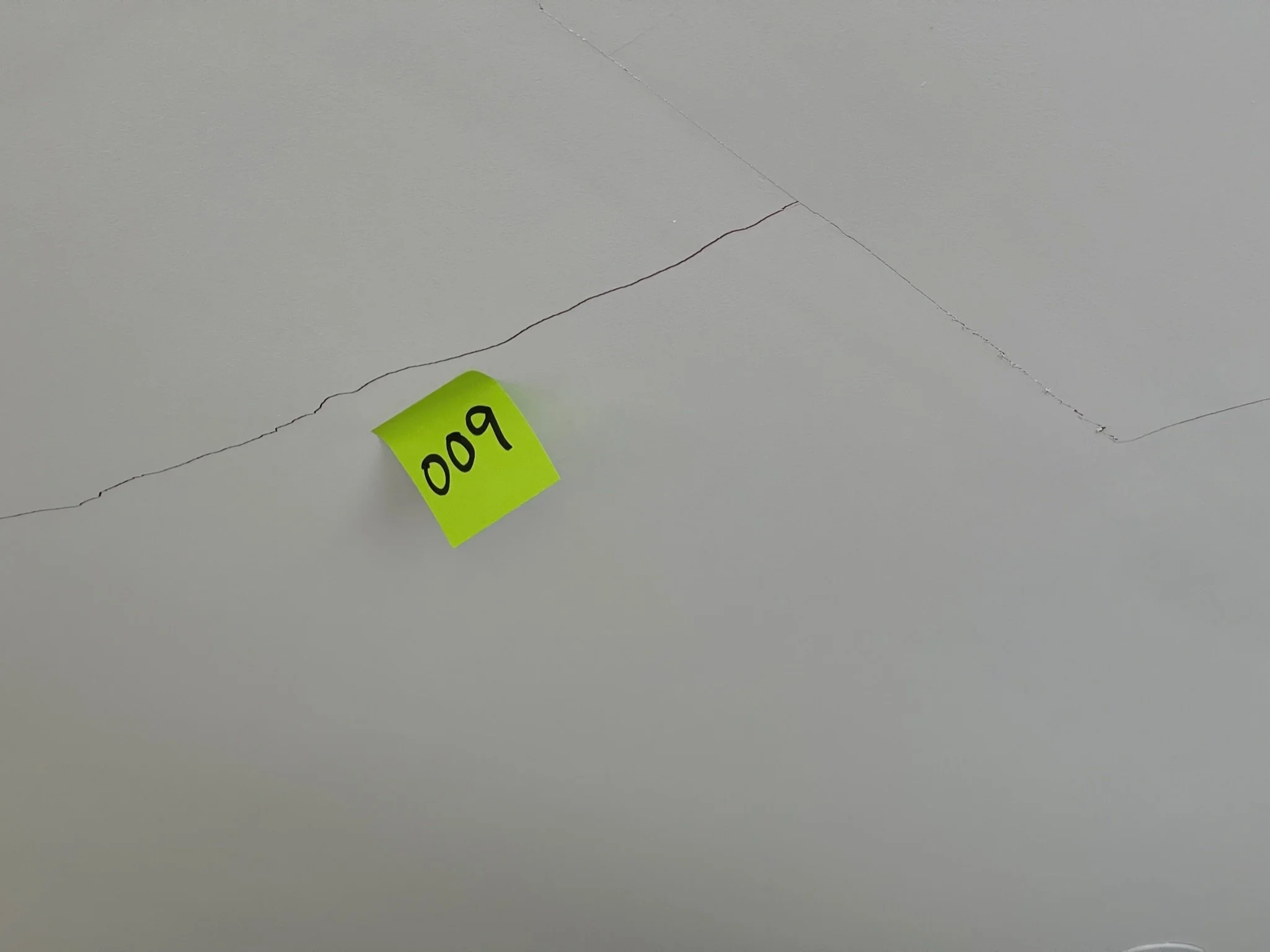 Ceiling corner with a visible crack and an orange sticky note labeled "067"