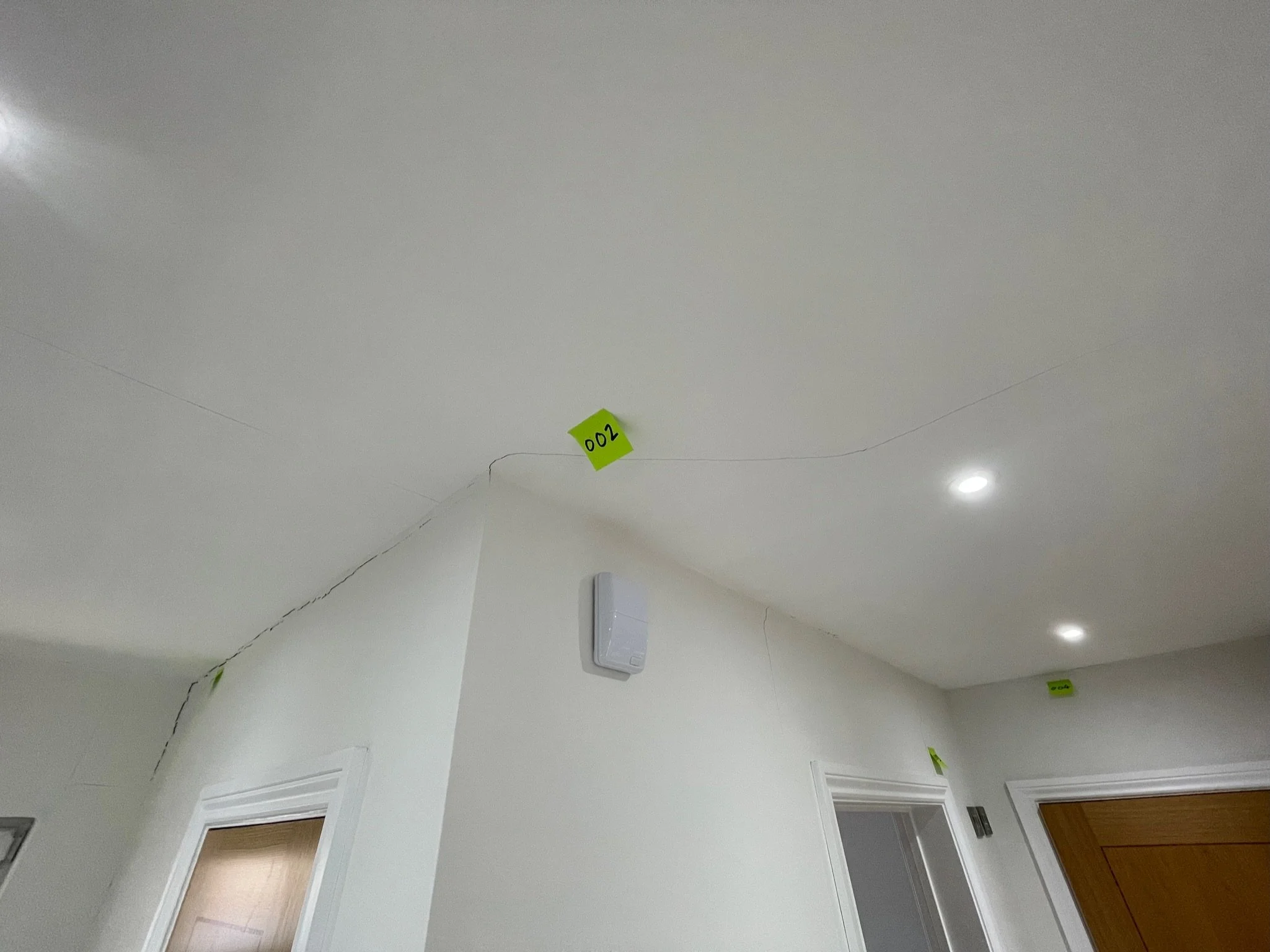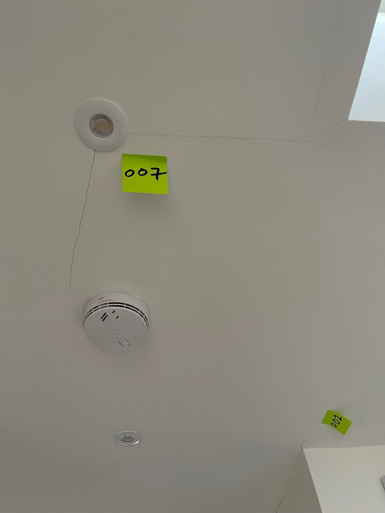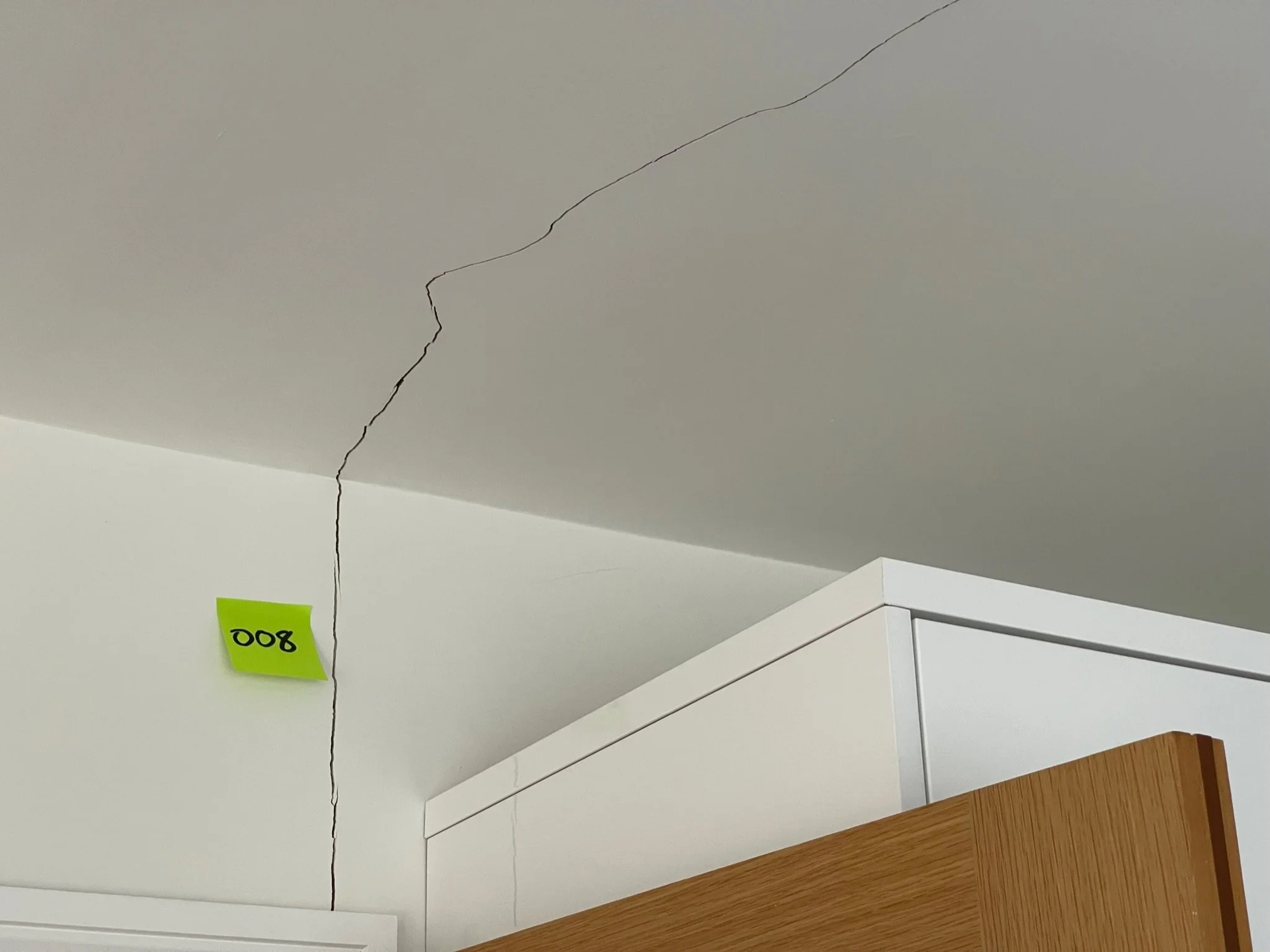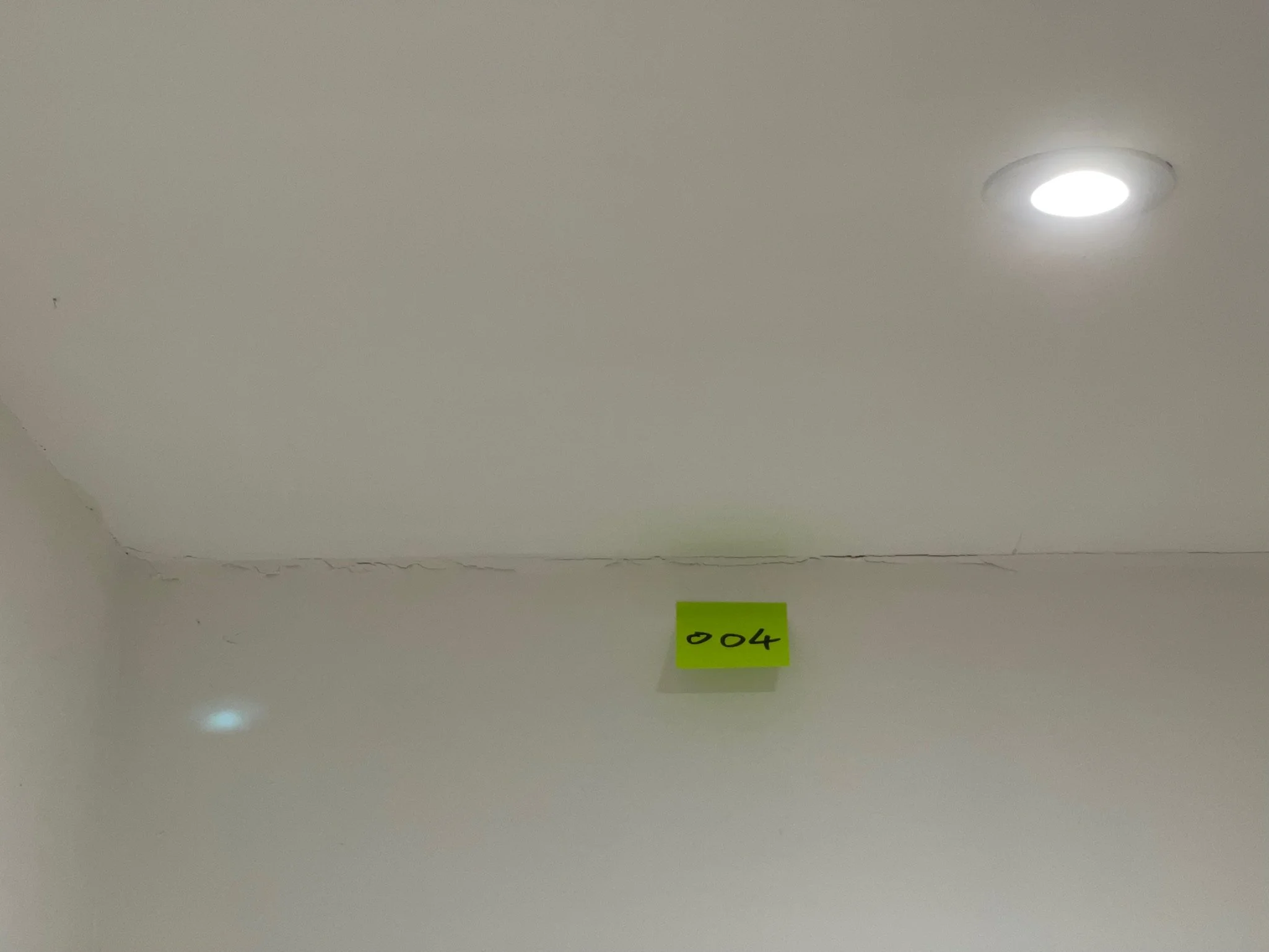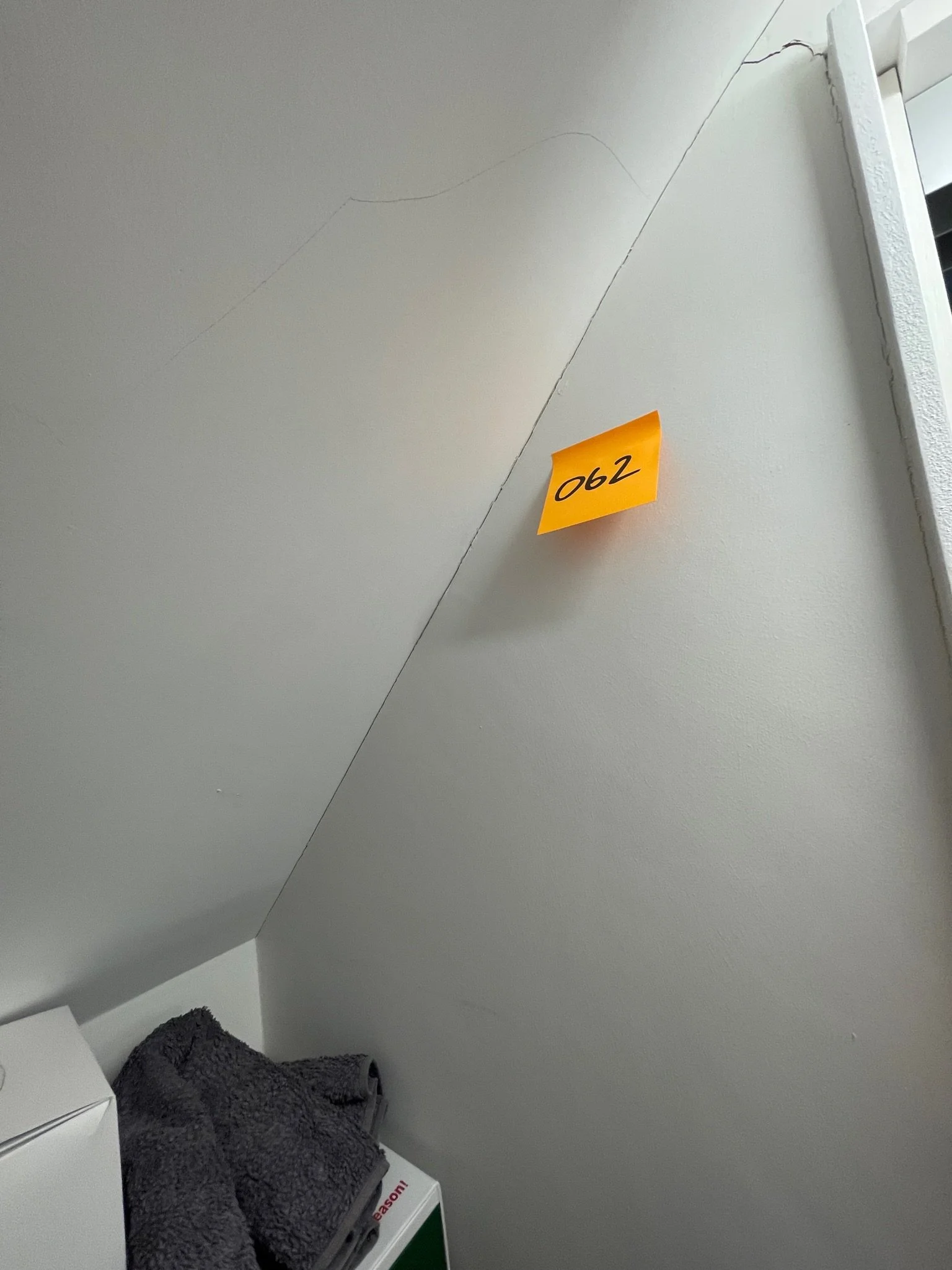 Ceiling corner with a visible crack and an orange sticky note labeled "067"