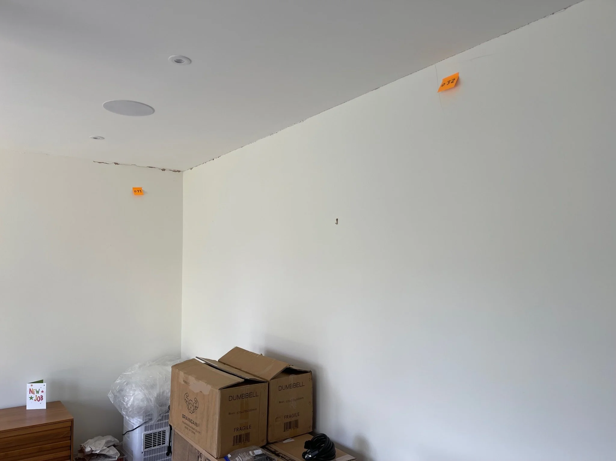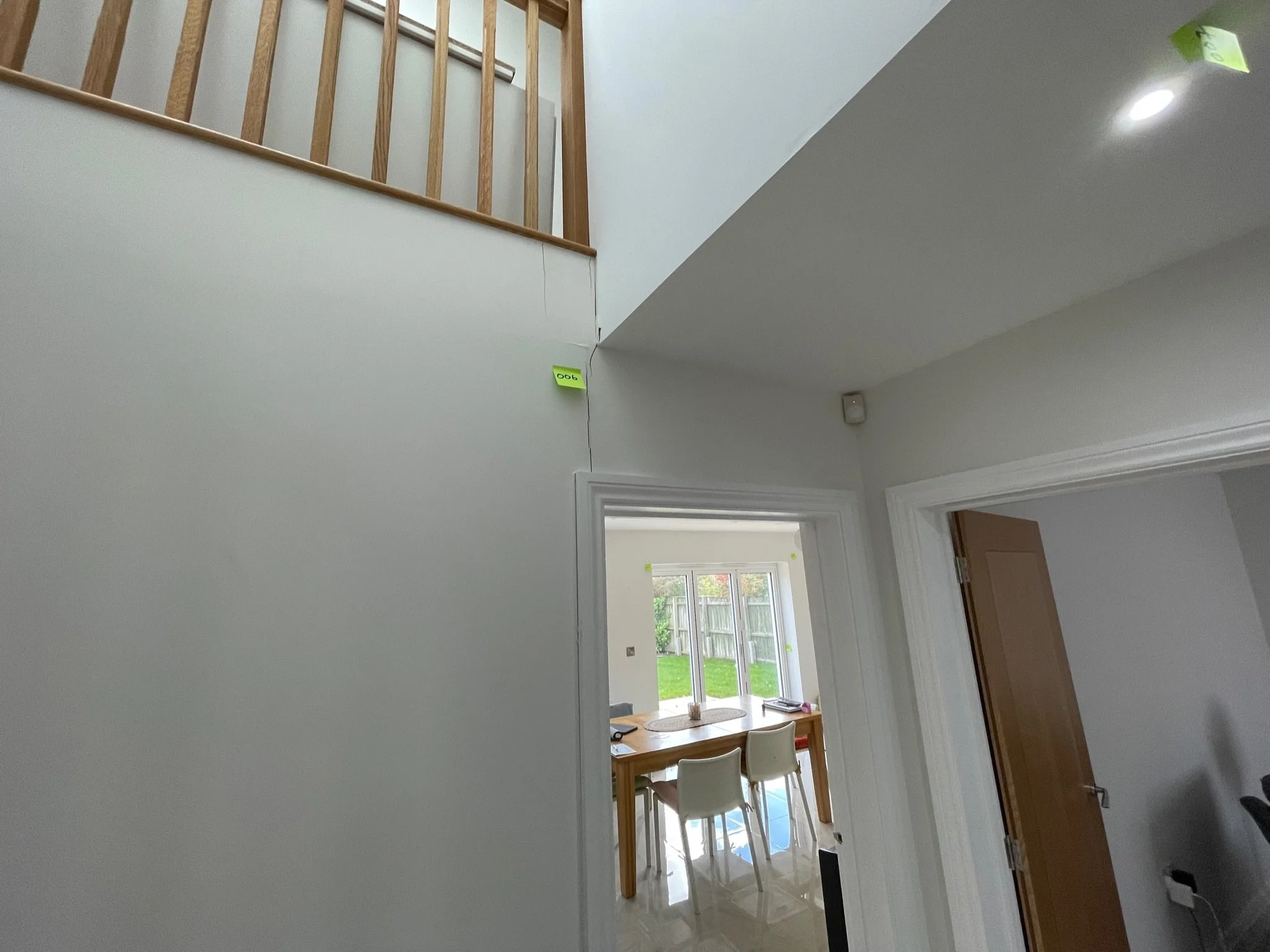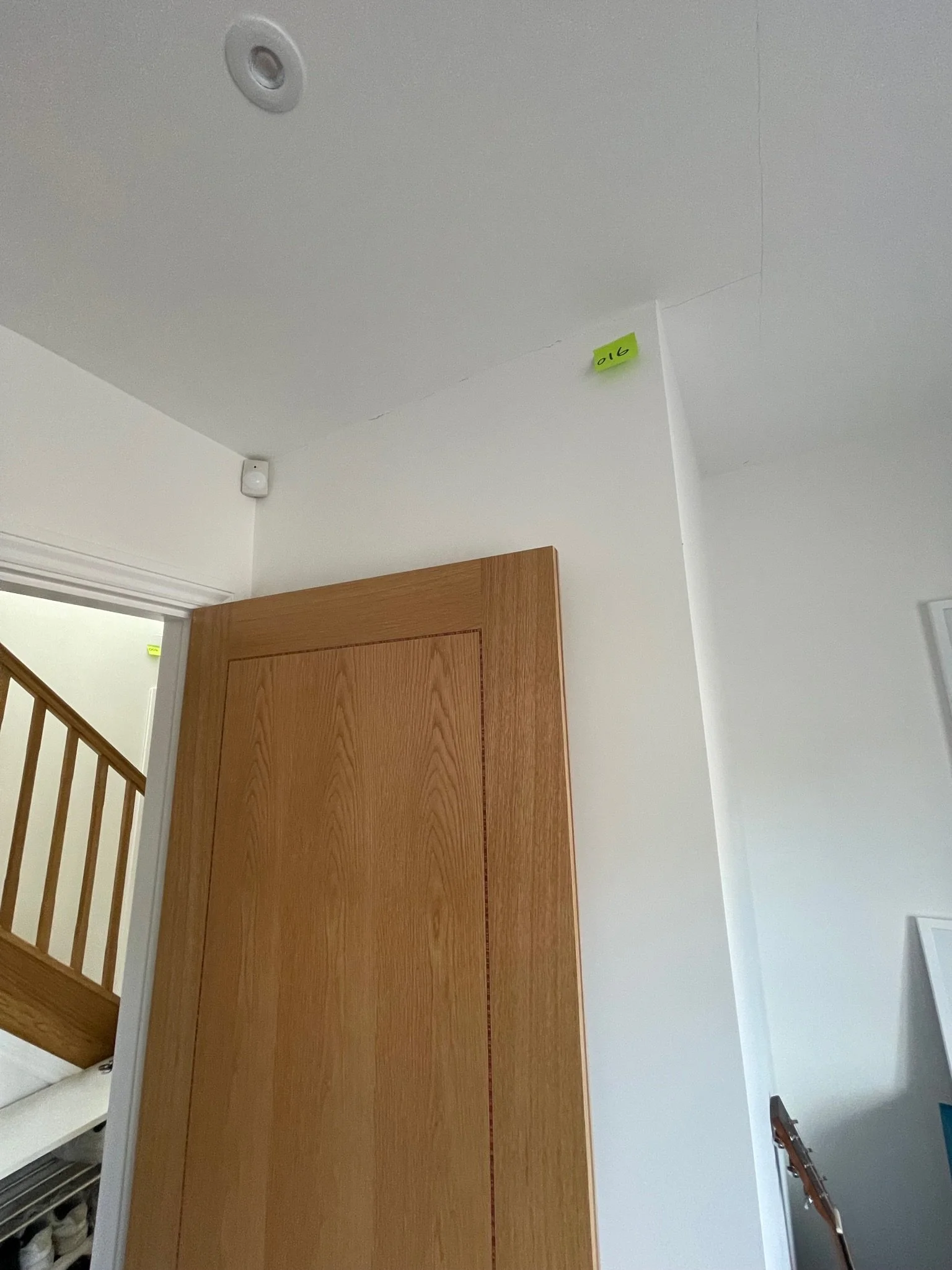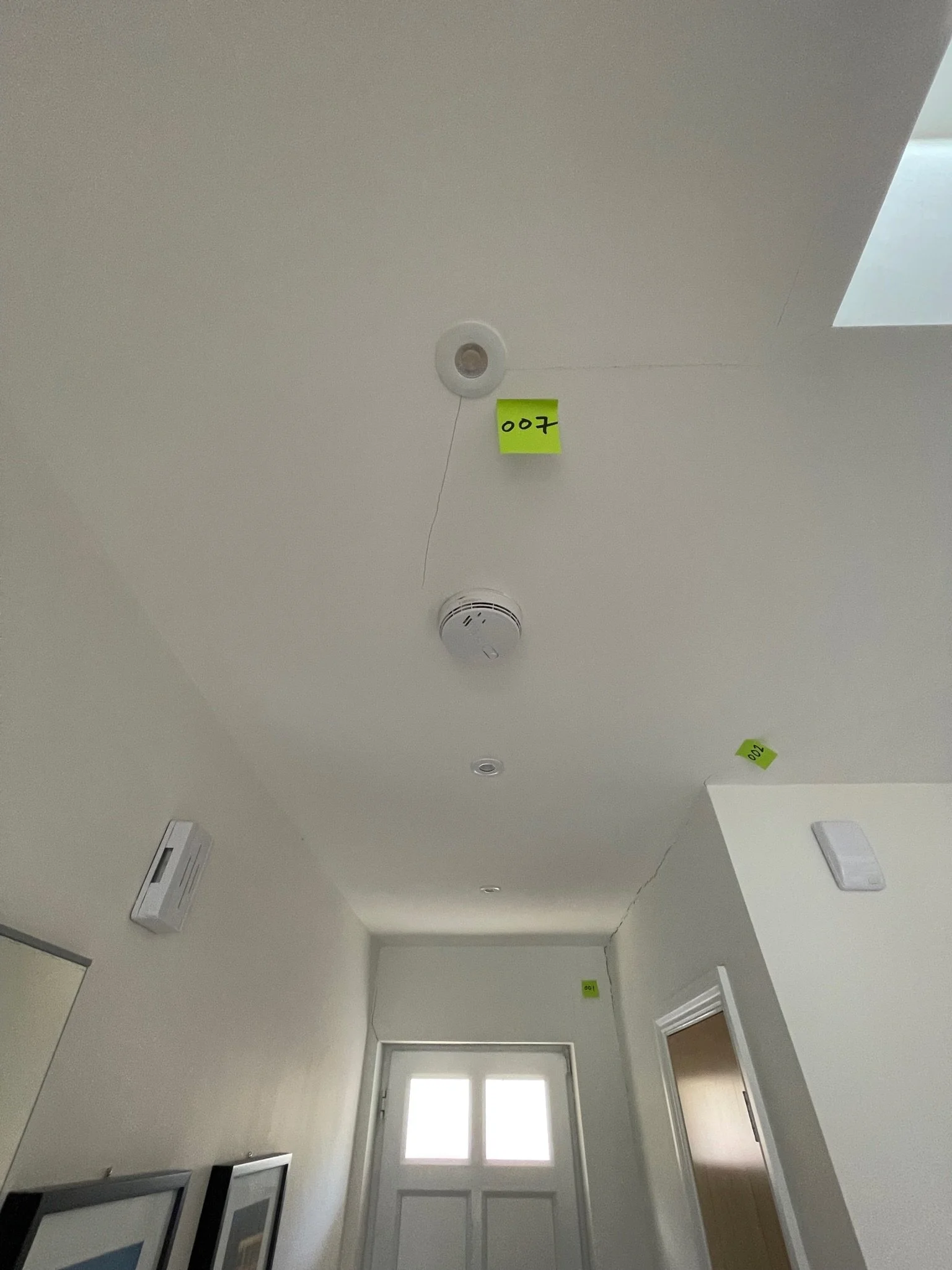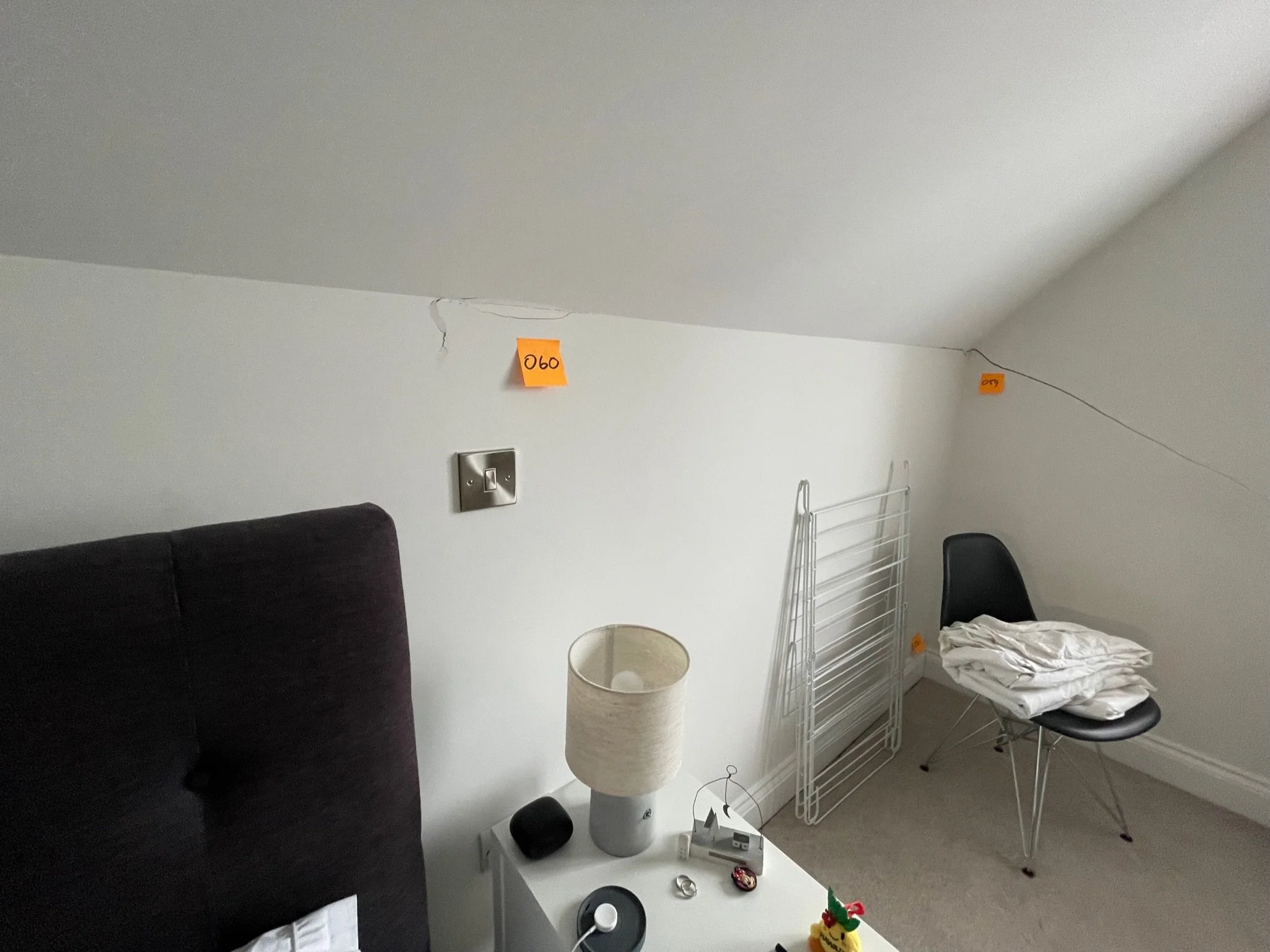 Ceiling corner with a visible crack and an orange sticky note labeled "067"
