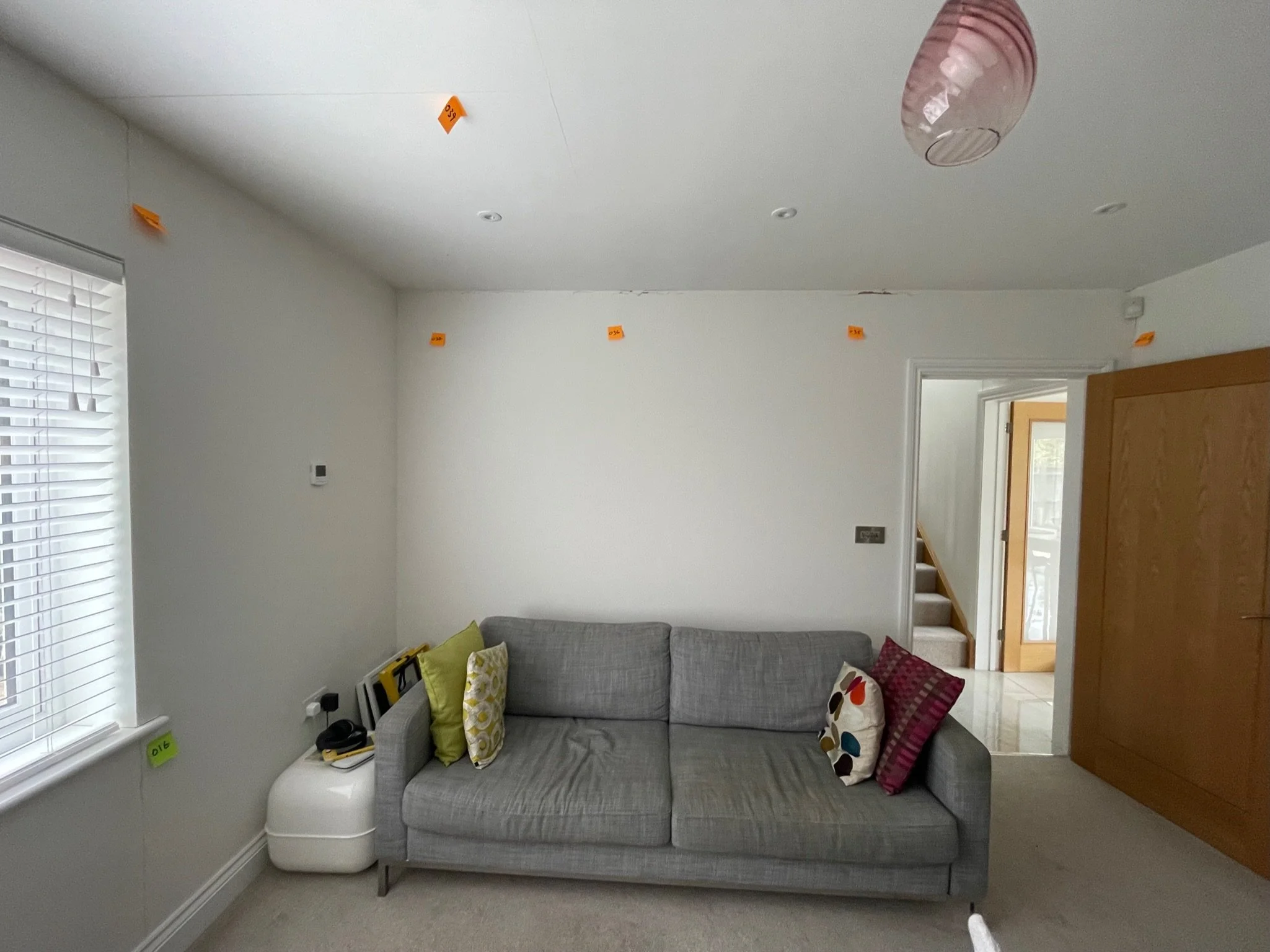 Living room with a grey sofa and colorful pillows, white walls with small orange markers, a window with blinds, and a pink ceiling light. A white side table with headphones and books is next to the sofa. A wooden door leads to a staircase.