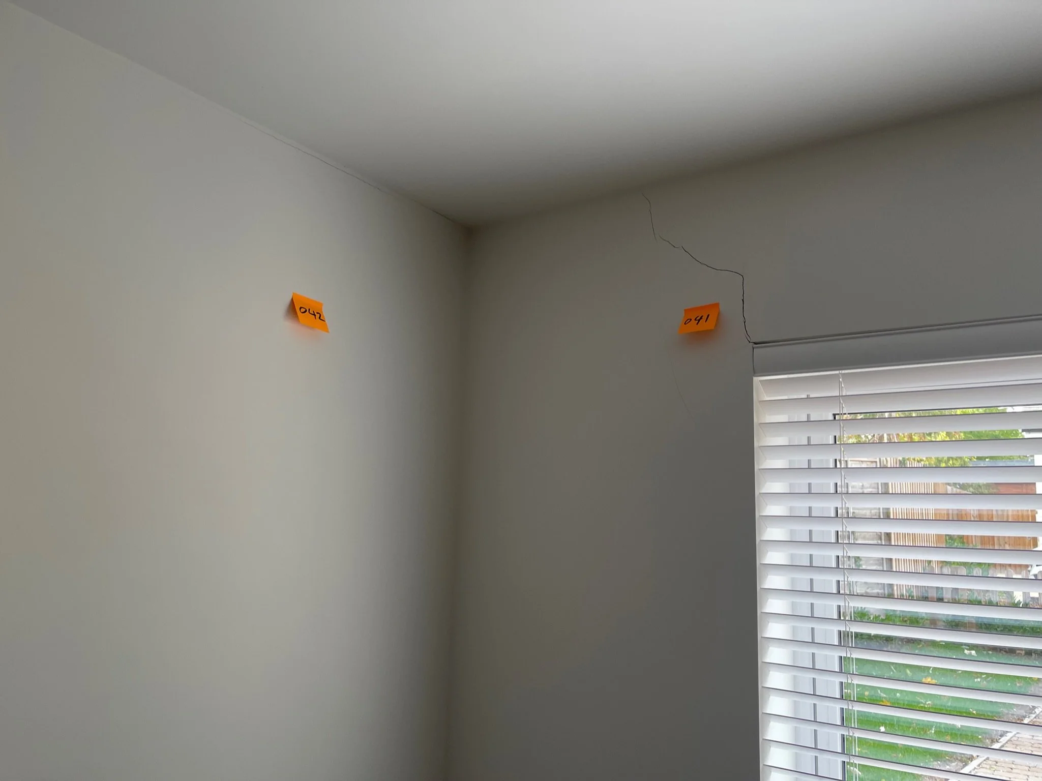 Interior corner of a room with a small crack on the wall above a window with blinds, marked by orange sticky notes labeled '041' and '042.'
