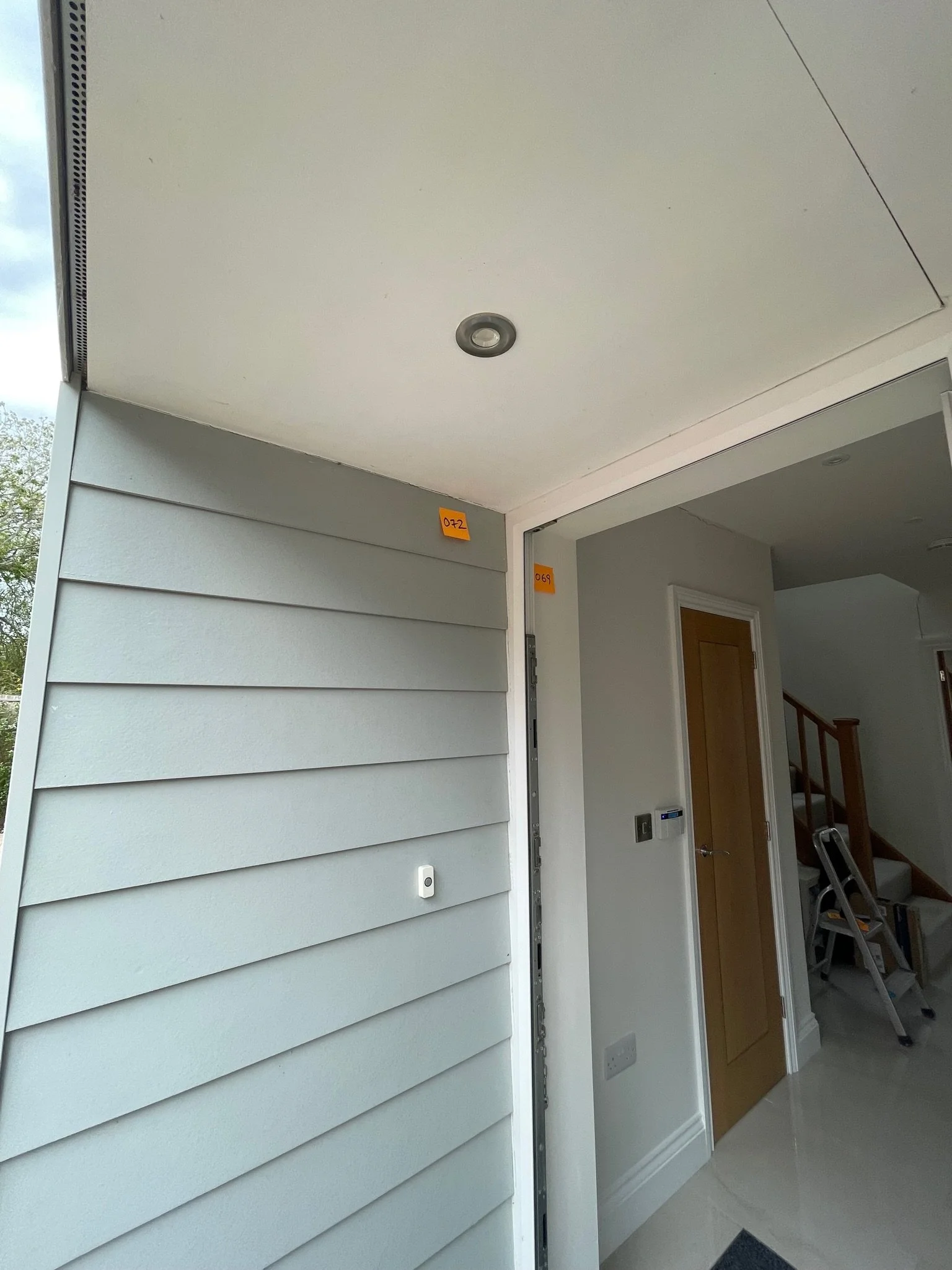 Entrance of a modern house with gray siding, ceiling light, and a partially open wooden door. Inside, there's a staircase with a ladder nearby. Sticky notes with numbers "022" and "001" are visible on the walls.