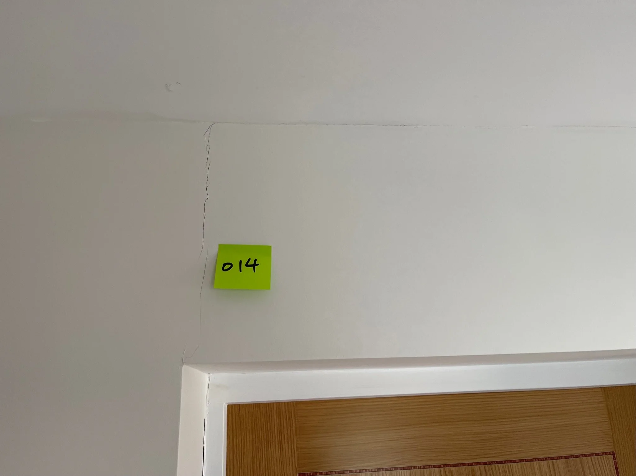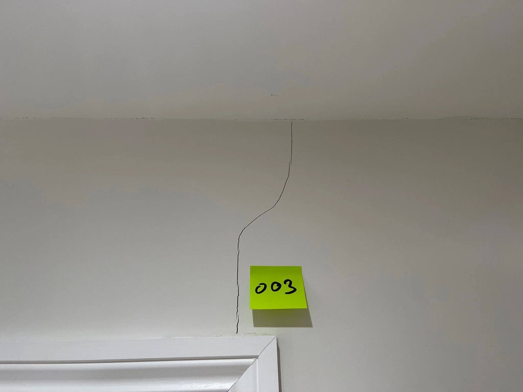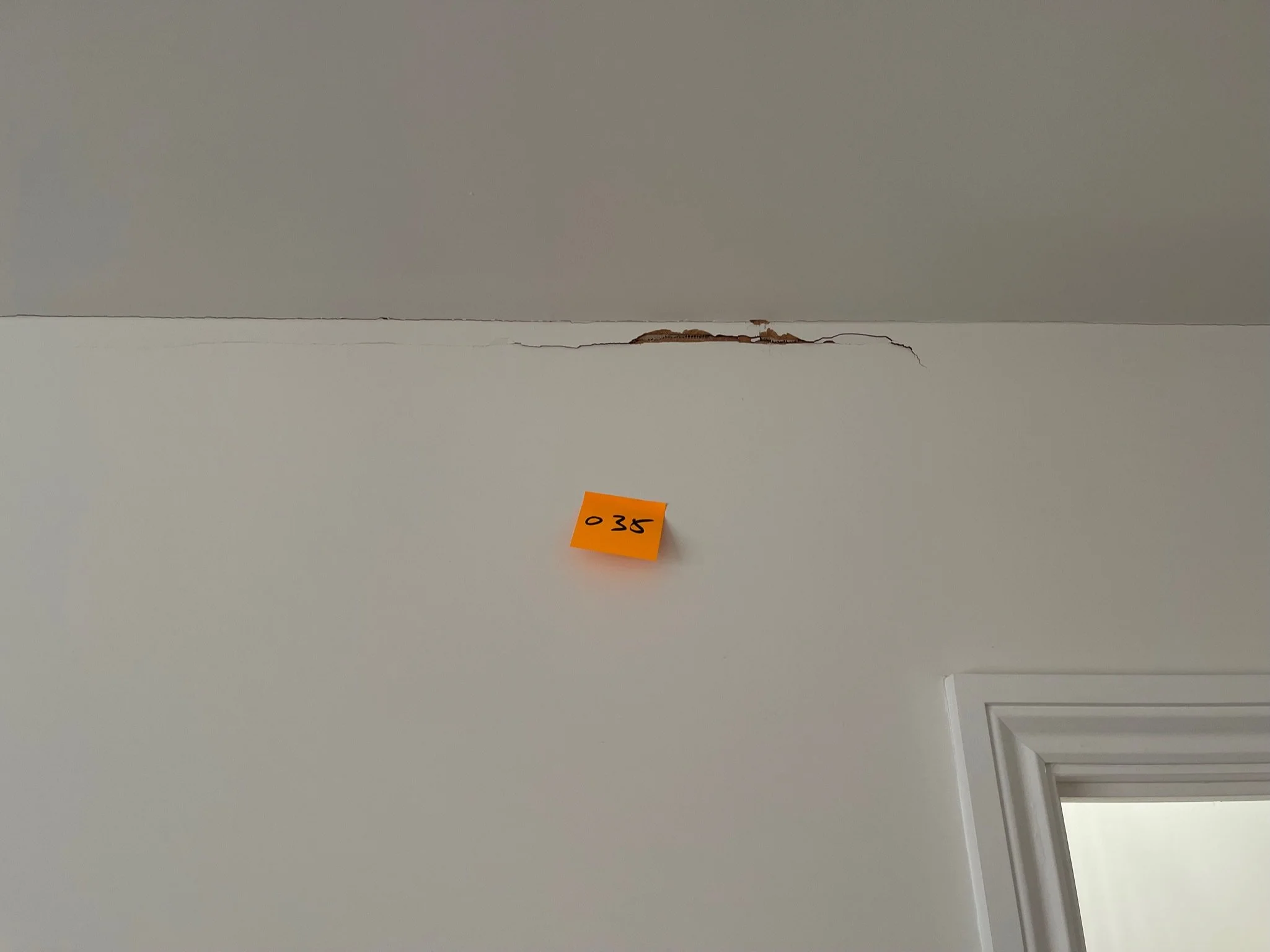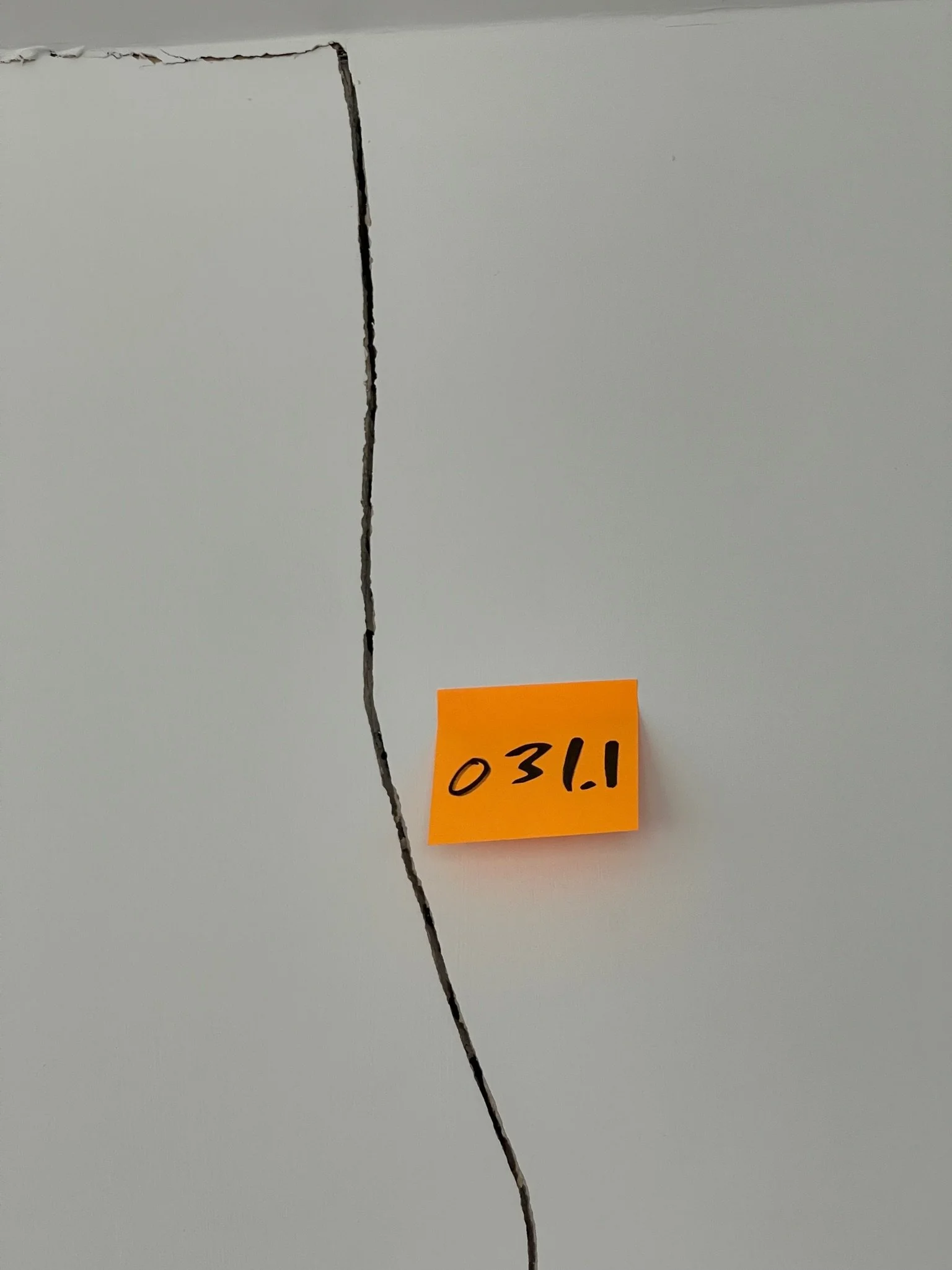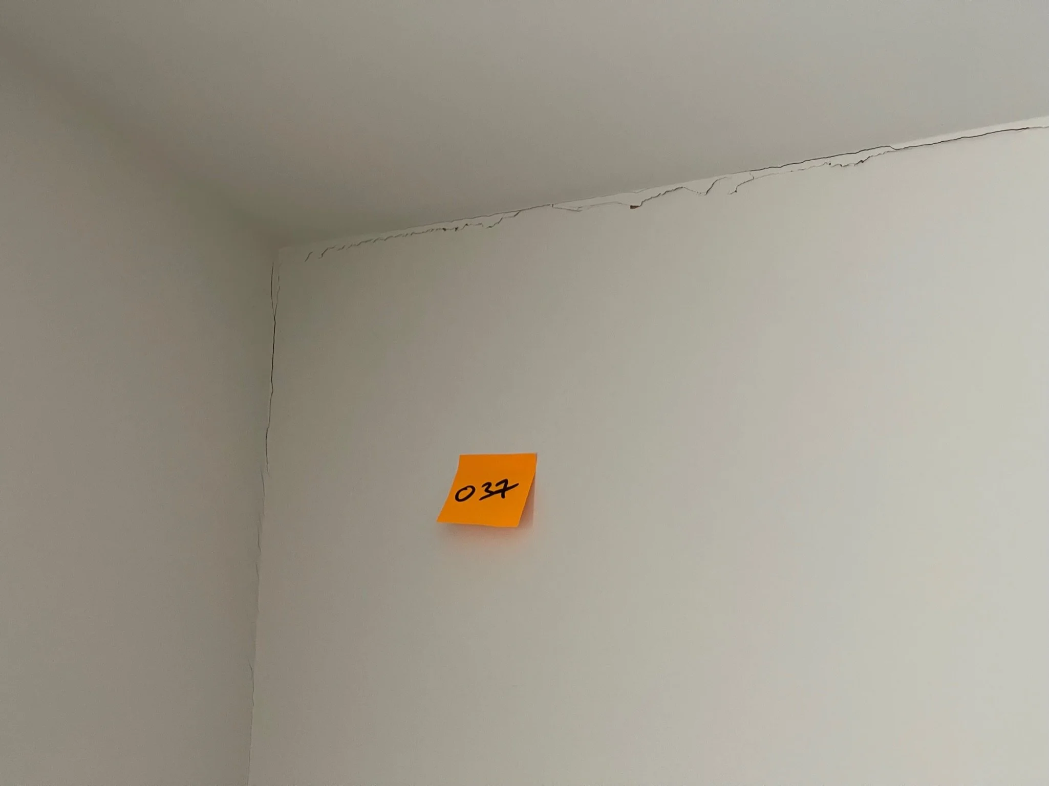 Crack on a white wall with a yellow sticky note labeled '037' near a doorframe.