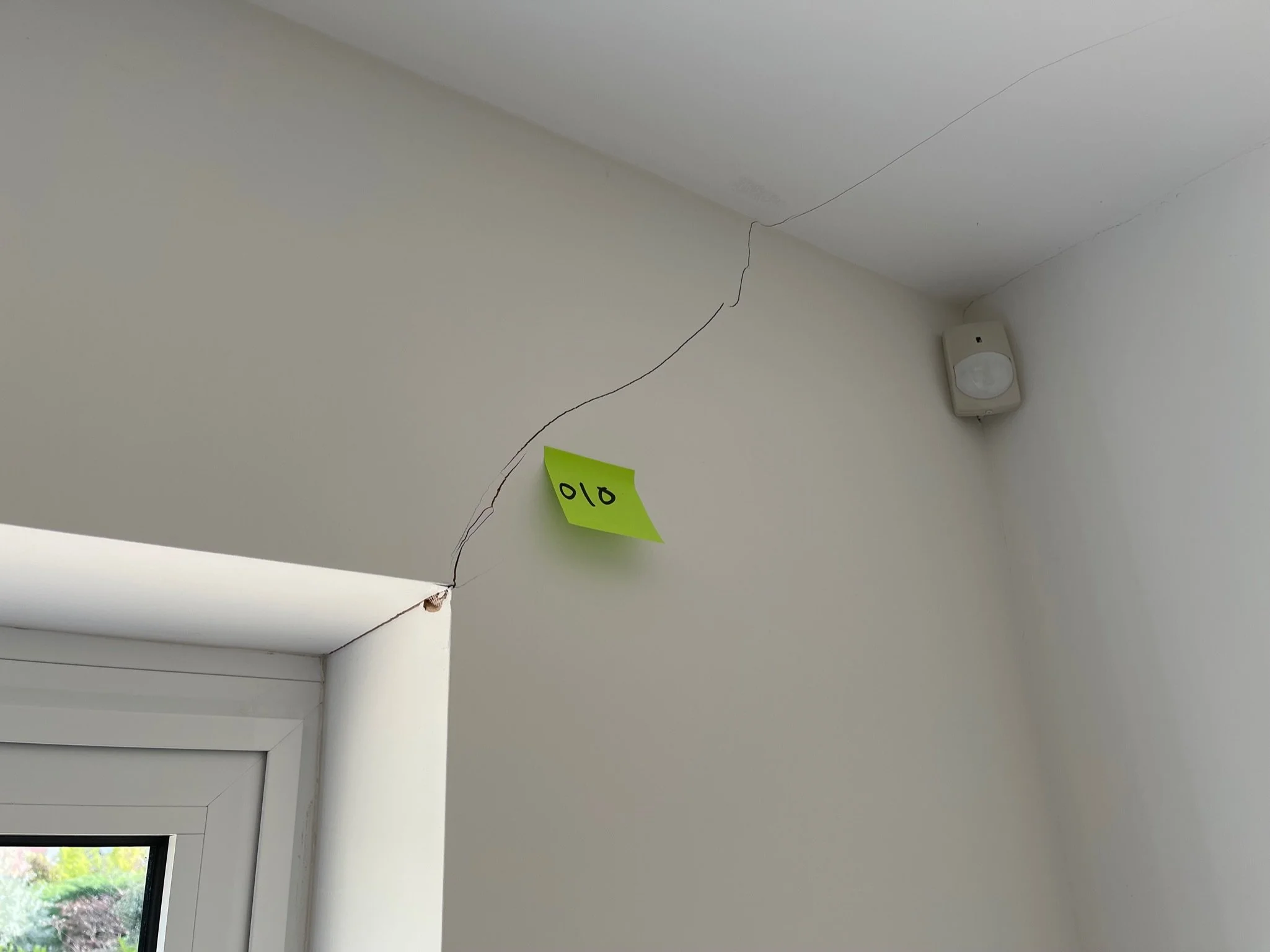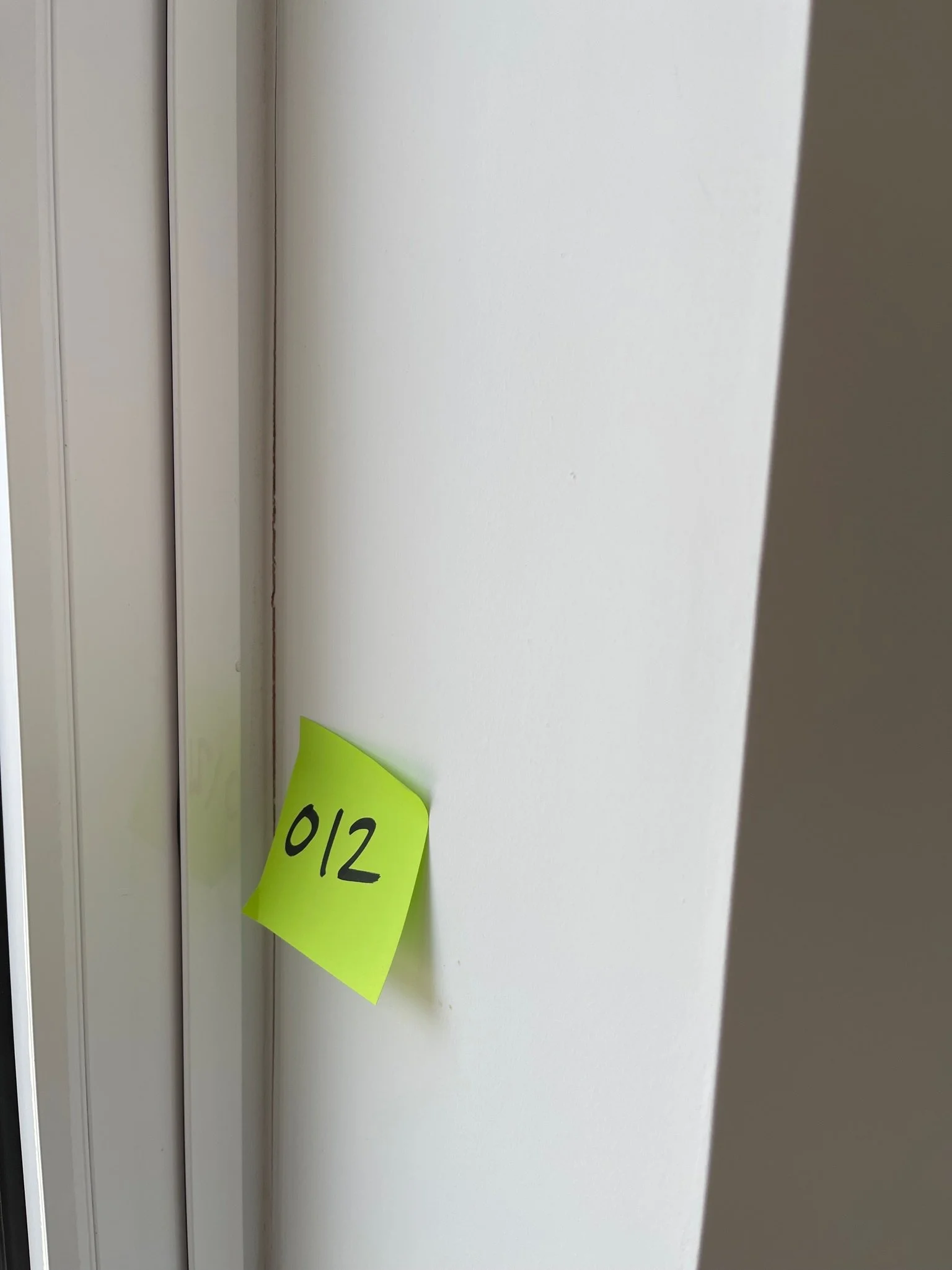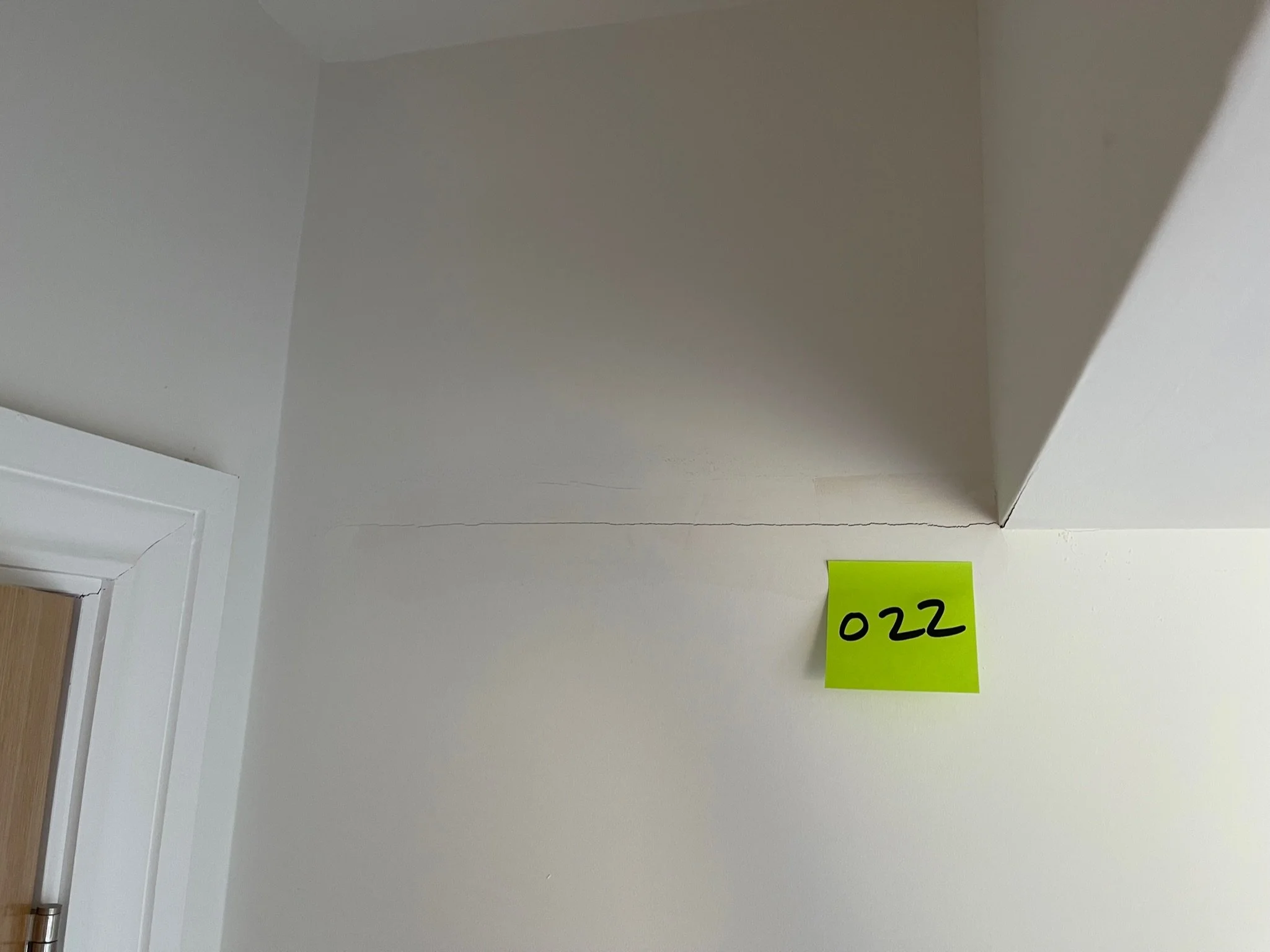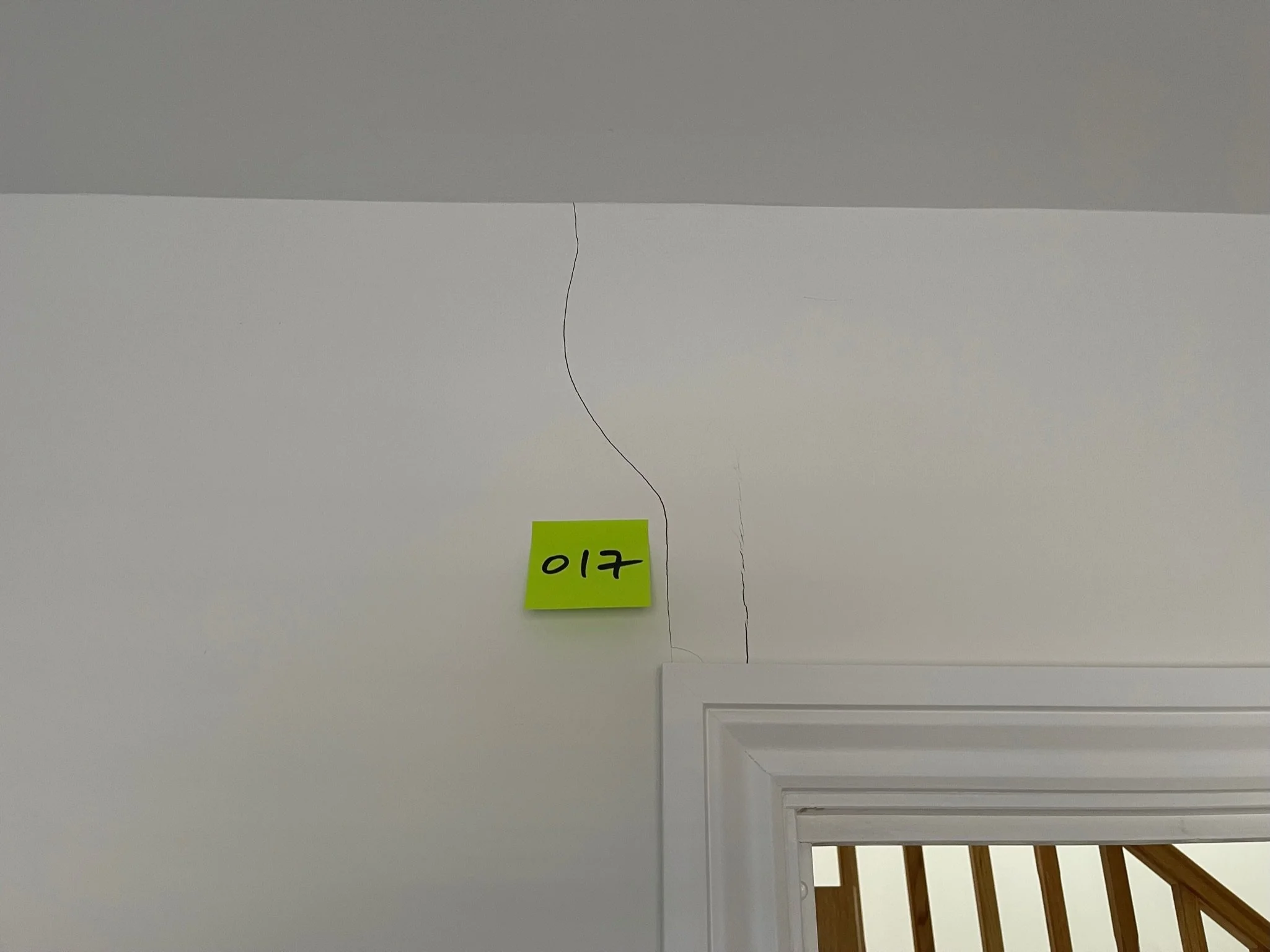 Crack on a white wall with a yellow sticky note labeled '037' near a doorframe.