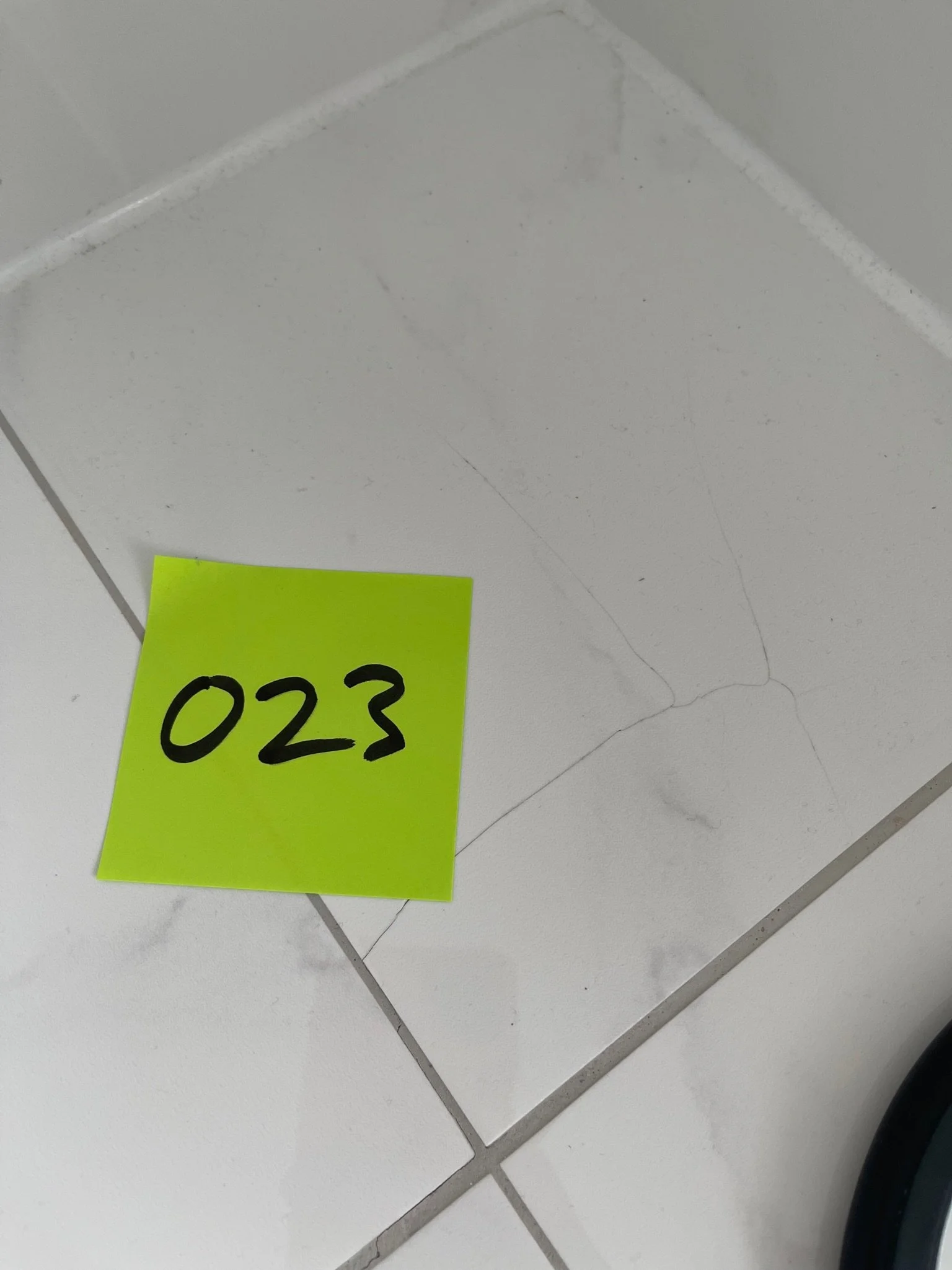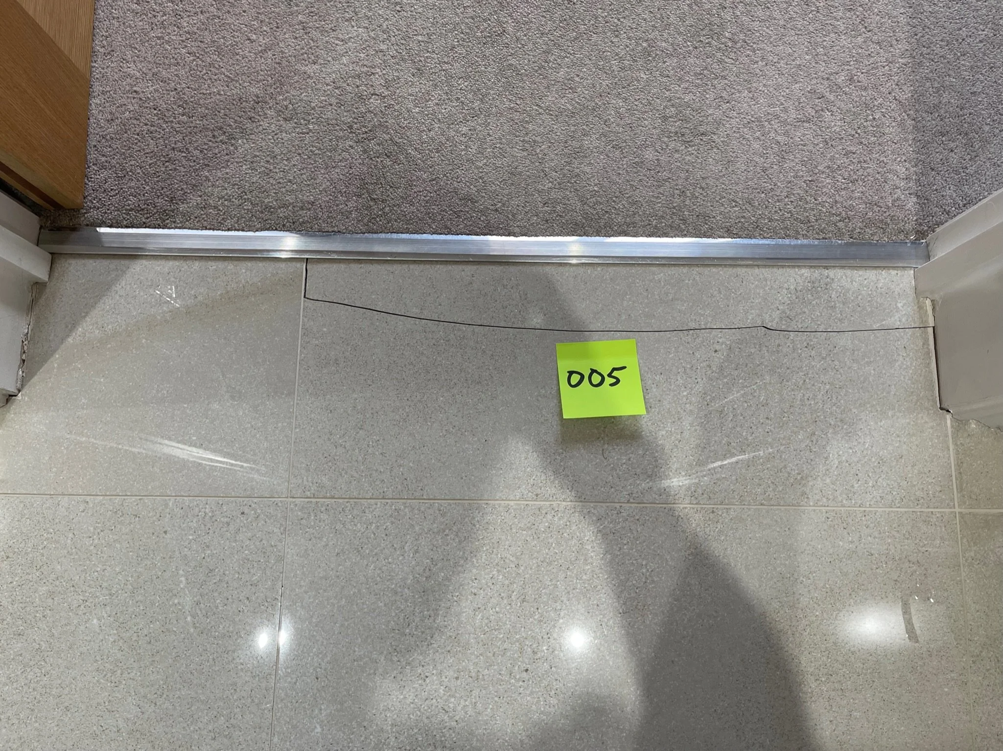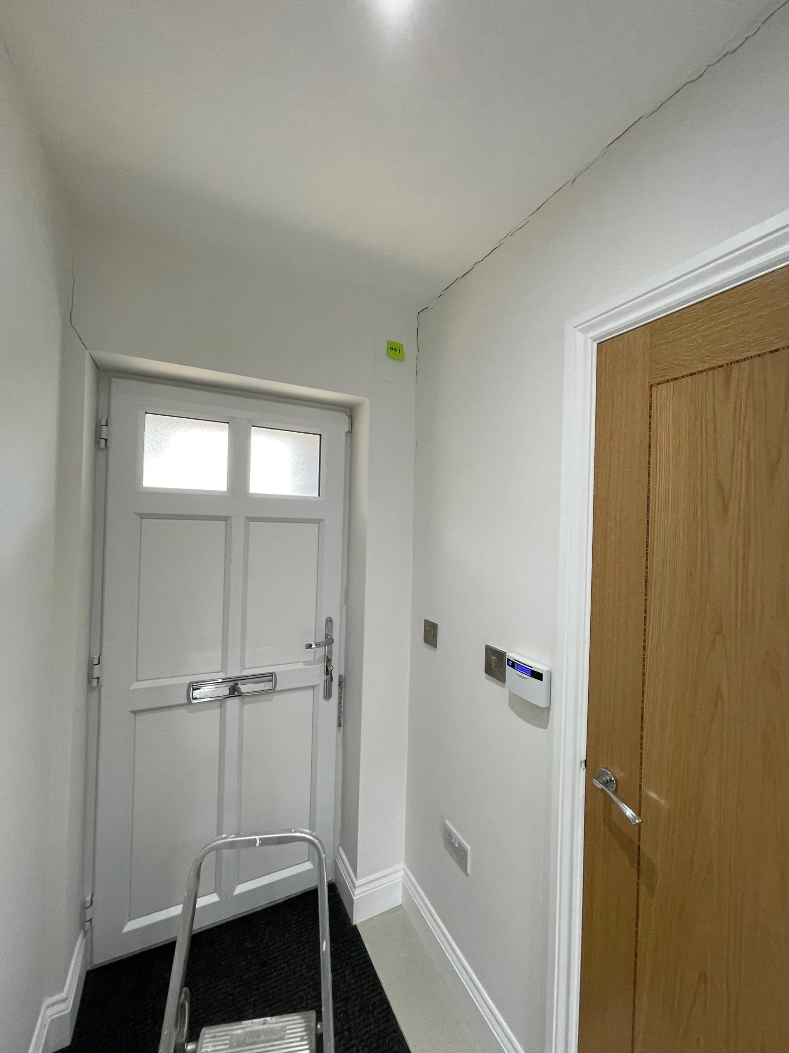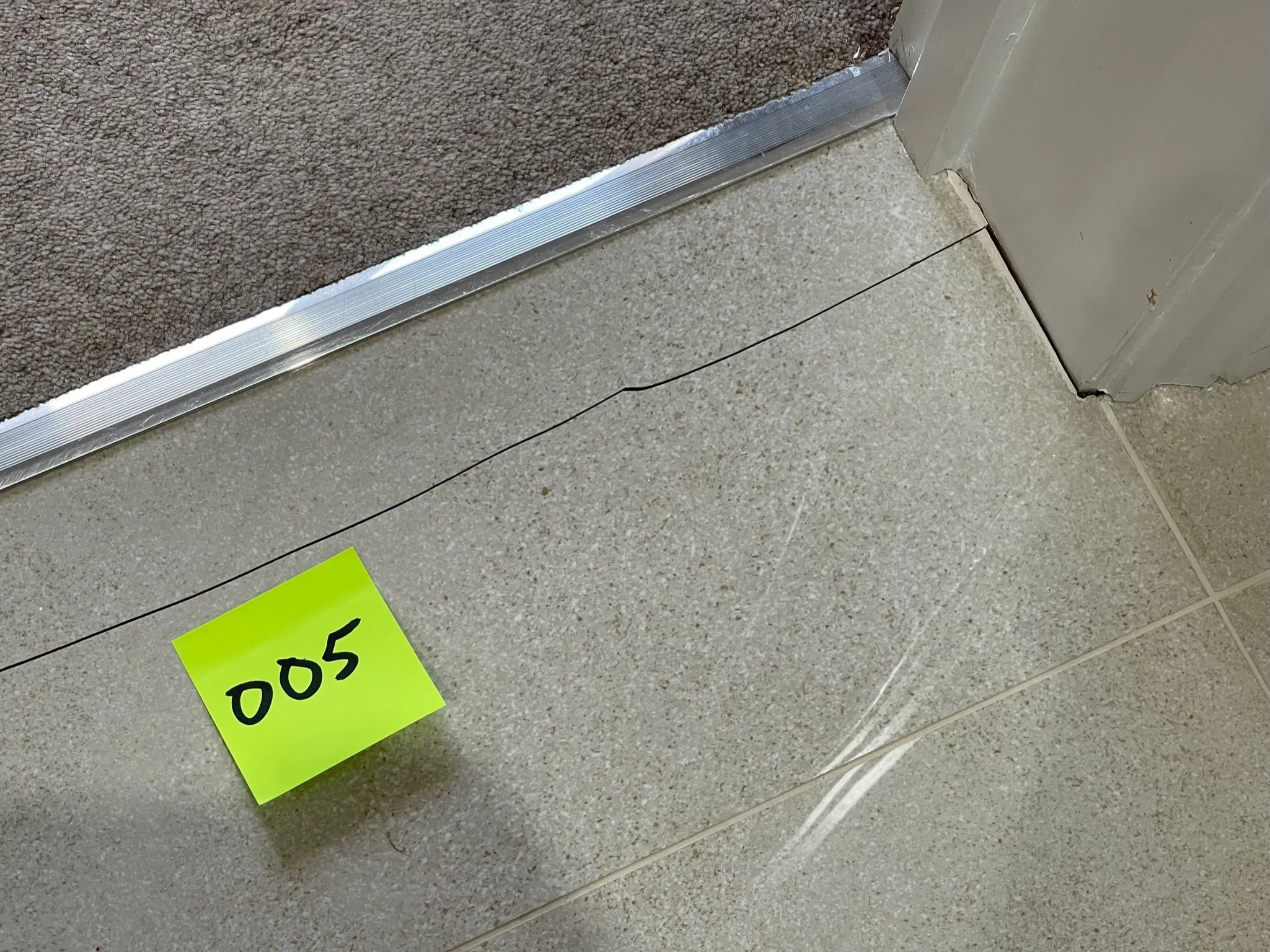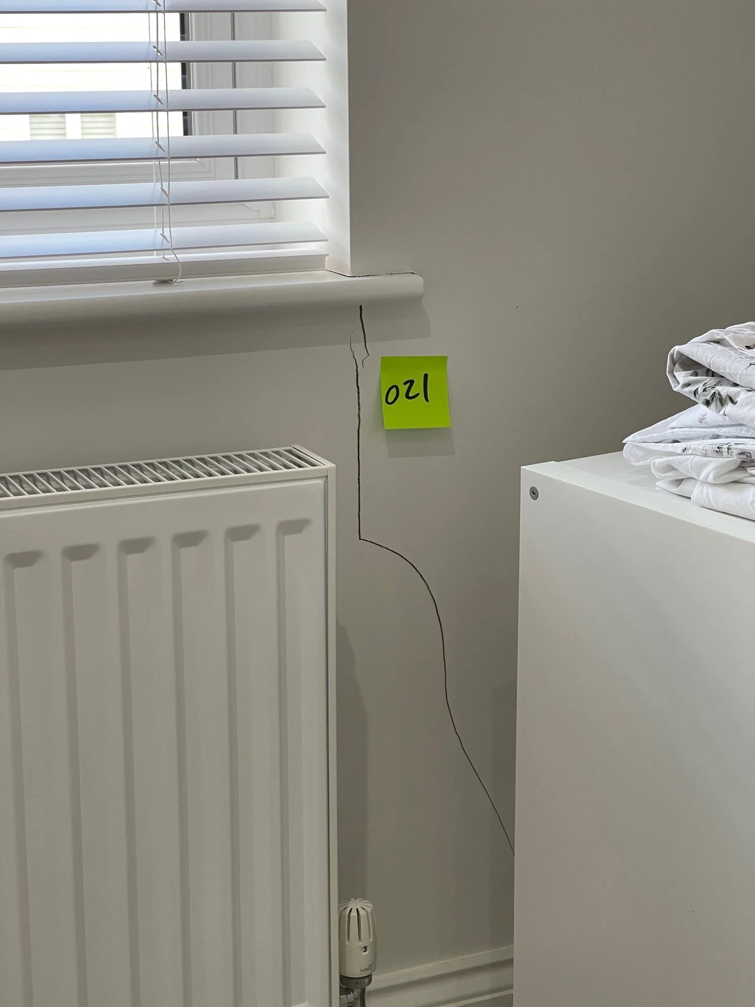 Crack on a white wall with a yellow sticky note labeled '037' near a doorframe.