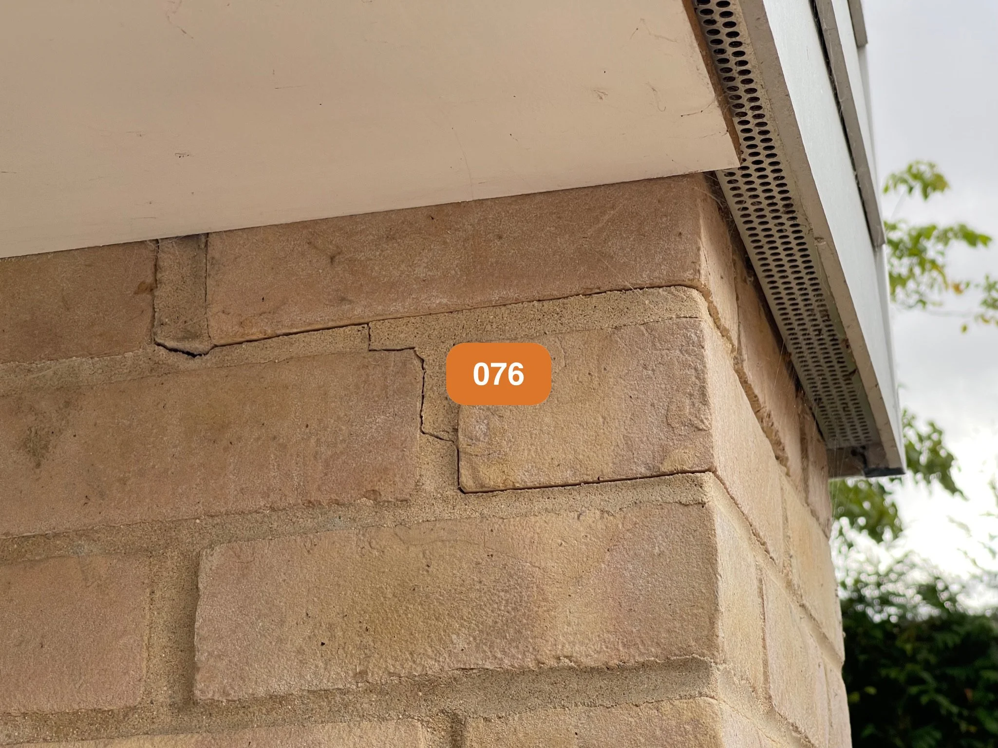 Brick column with cracks beneath a roof edge and perforated vent, labeled 076.