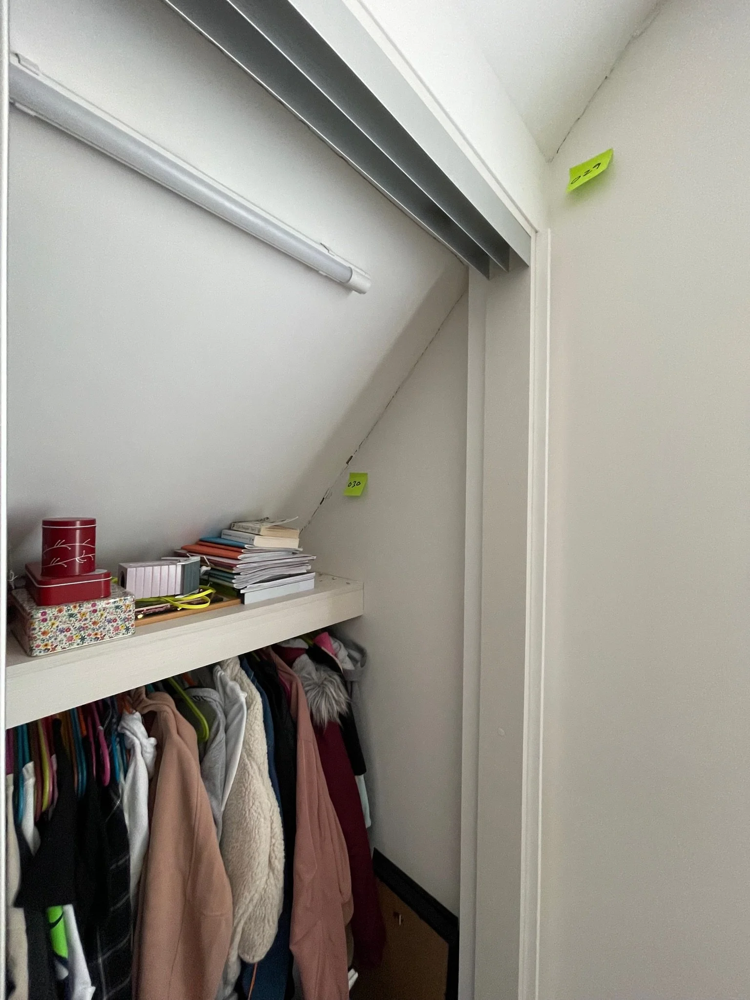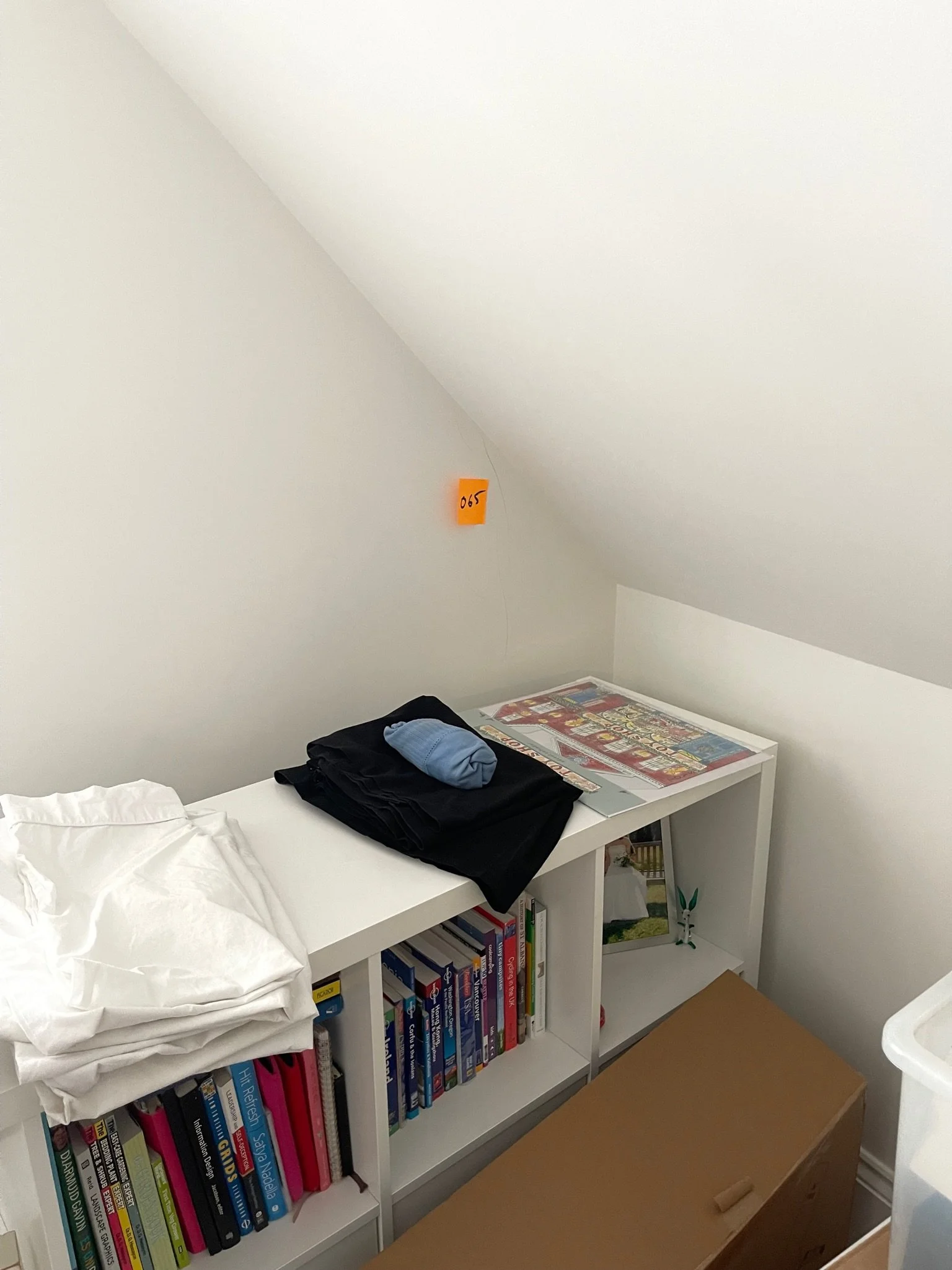 White bookshelf with books, folded clothes, and a jigsaw puzzle; a piece of cardboard, and a plastic storage bin nearby; angled ceiling with a sticky note saying "065."