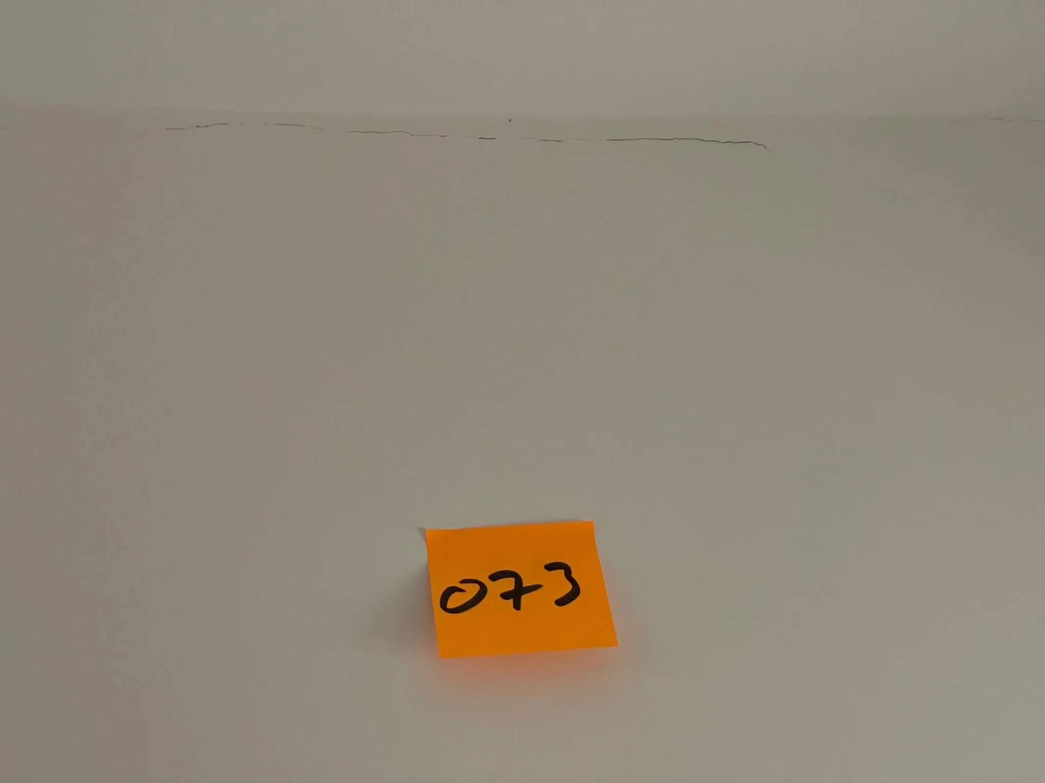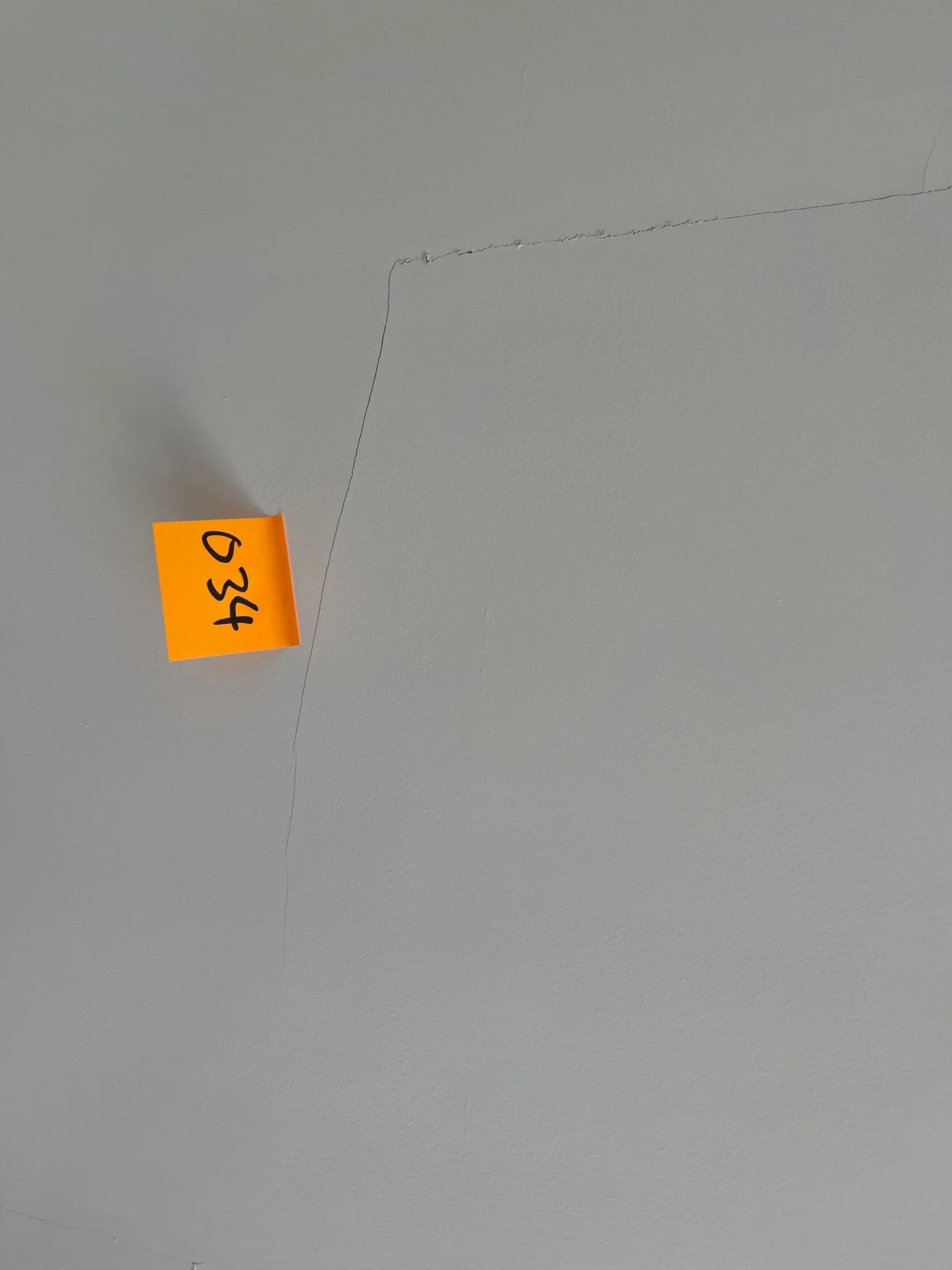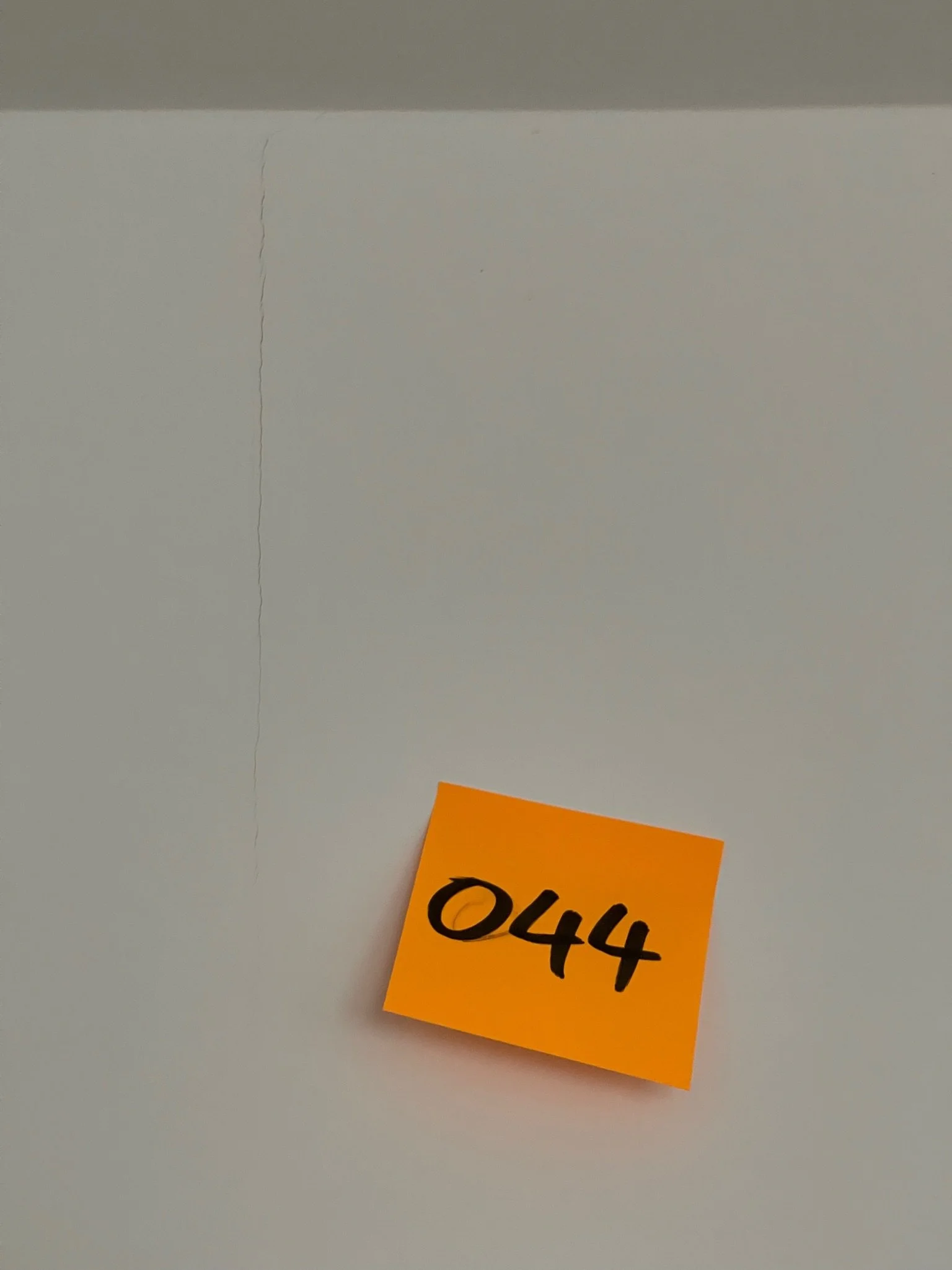 Orange sticky note with "044" on white wall next to a small crack