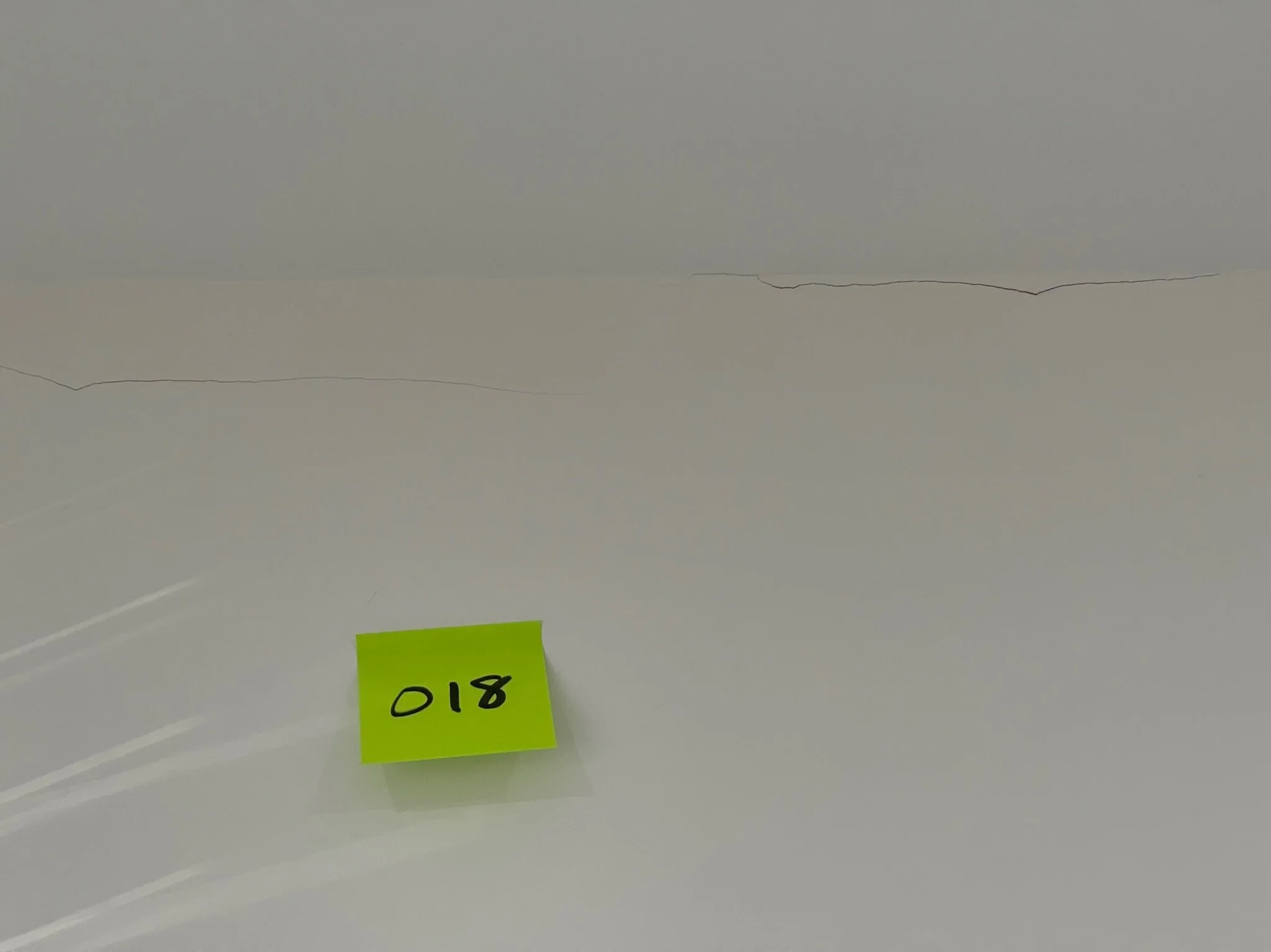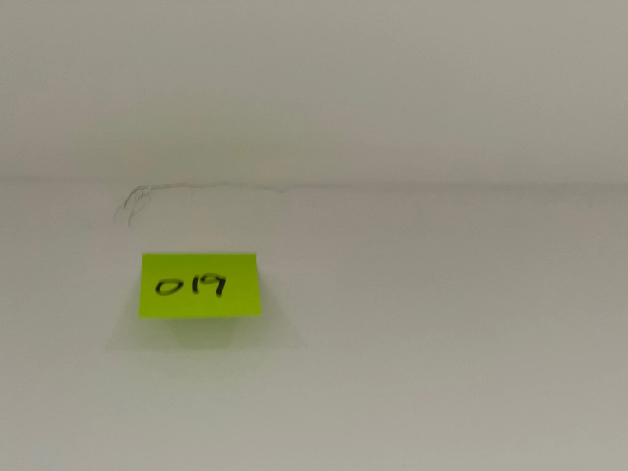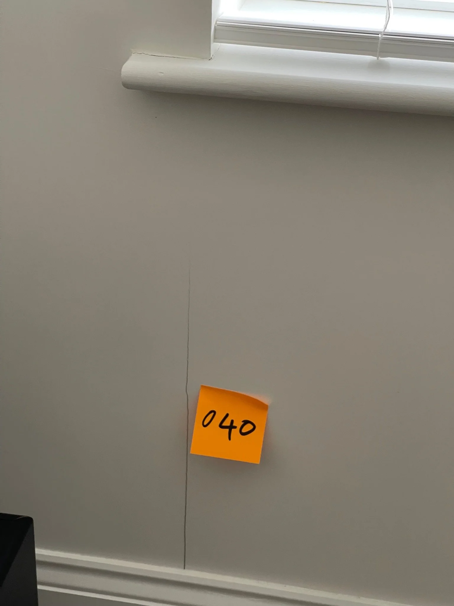 Orange sticky note with "044" on white wall next to a small crack