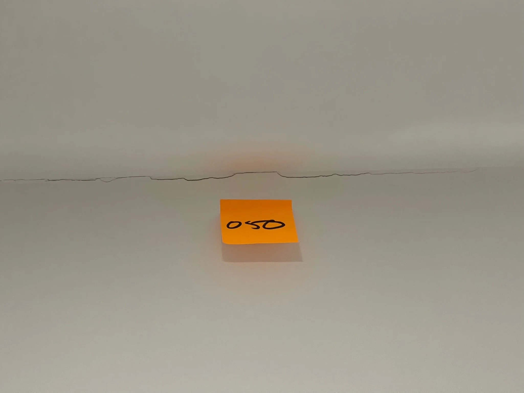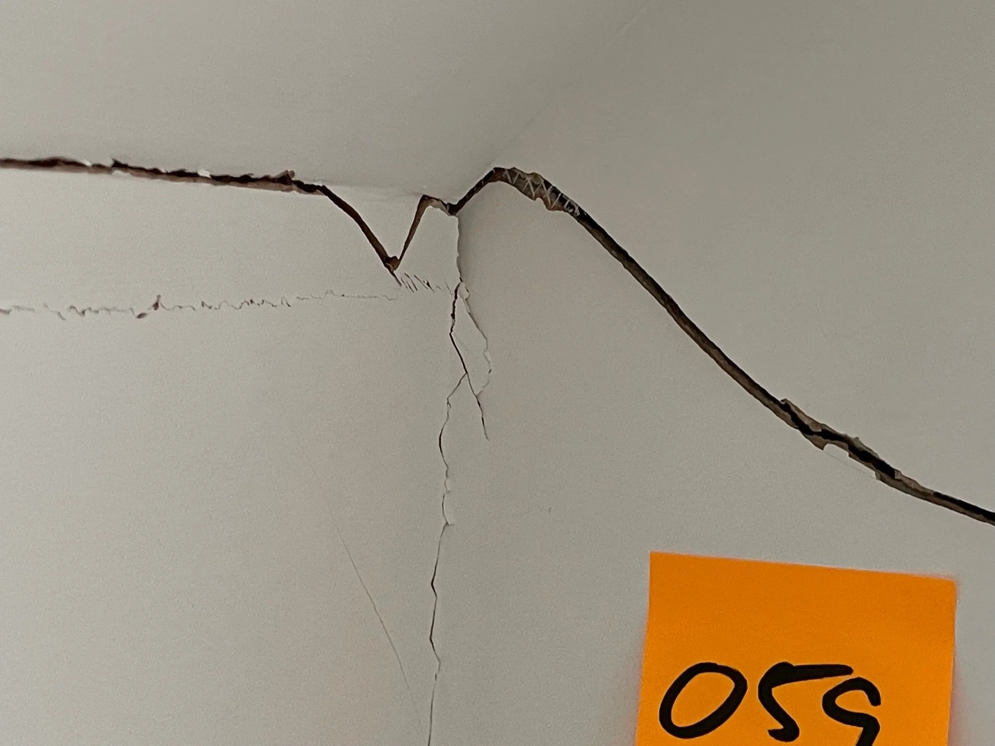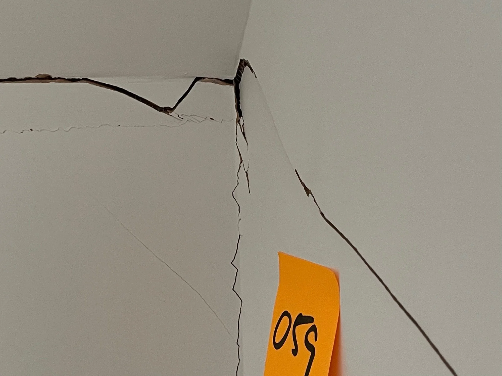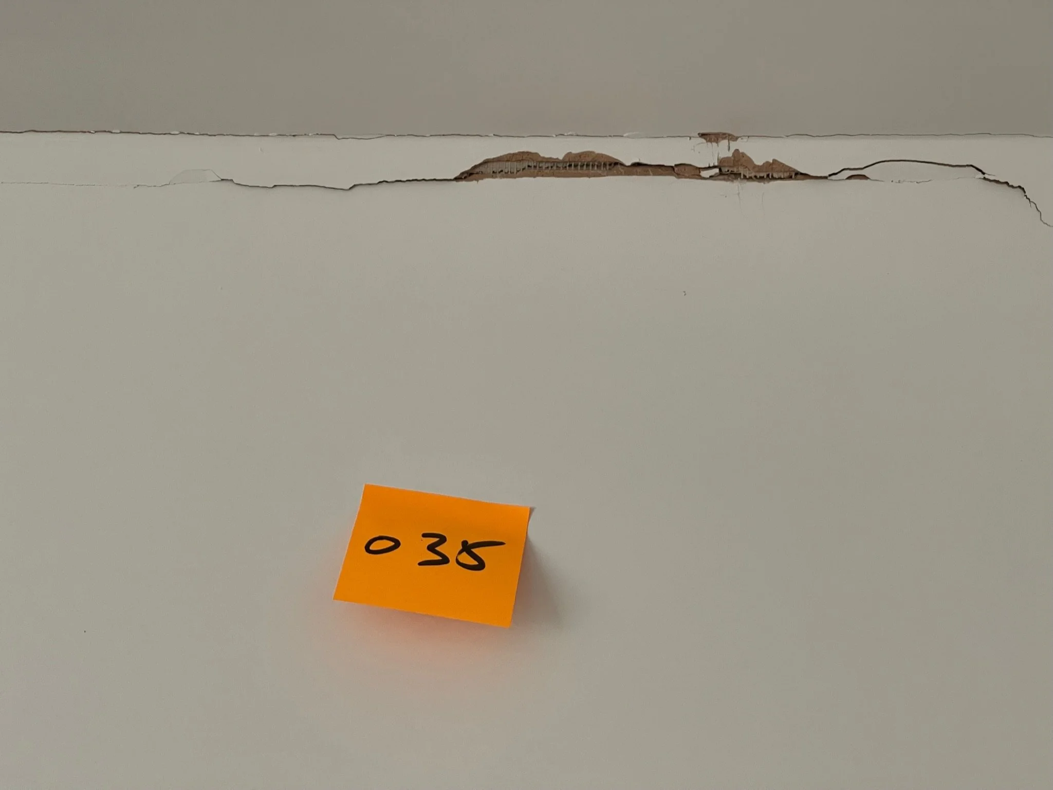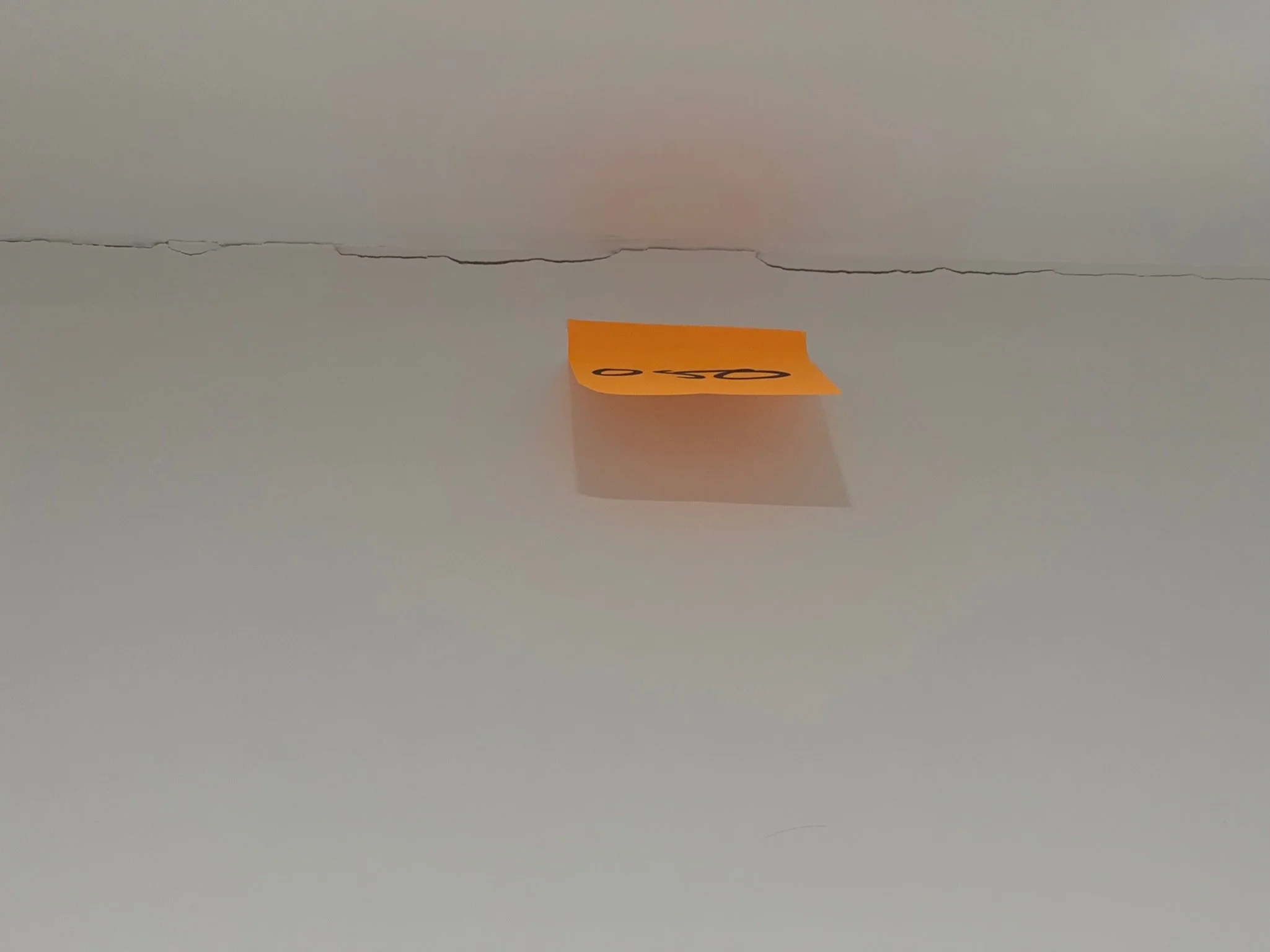 Crack in ceiling with a small orange sticky note labeled "050".