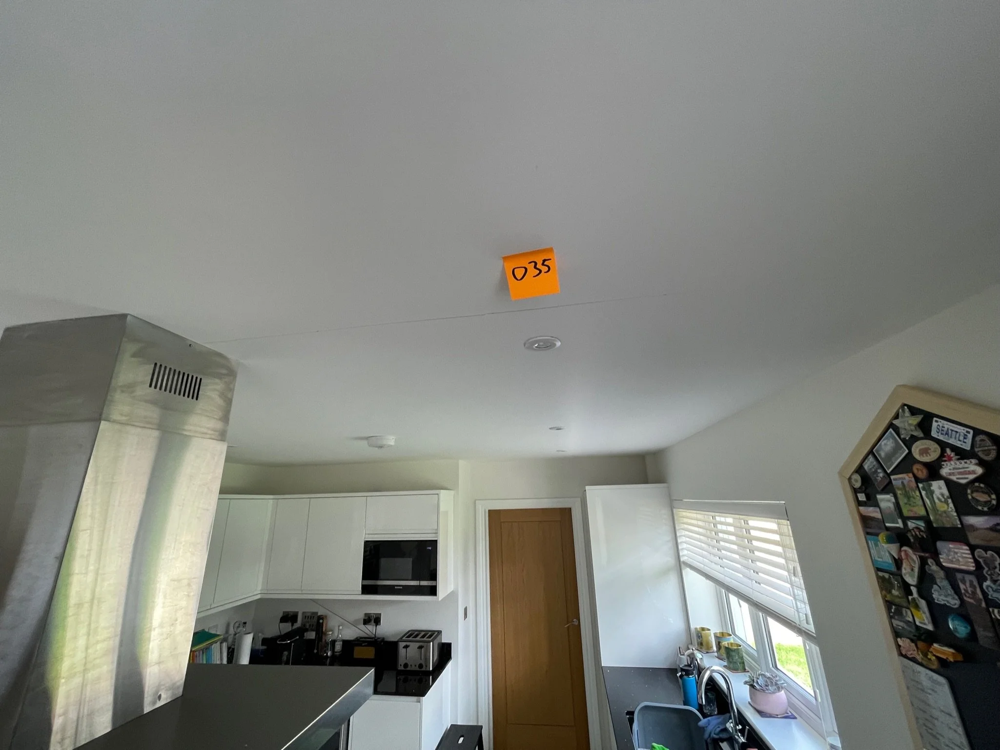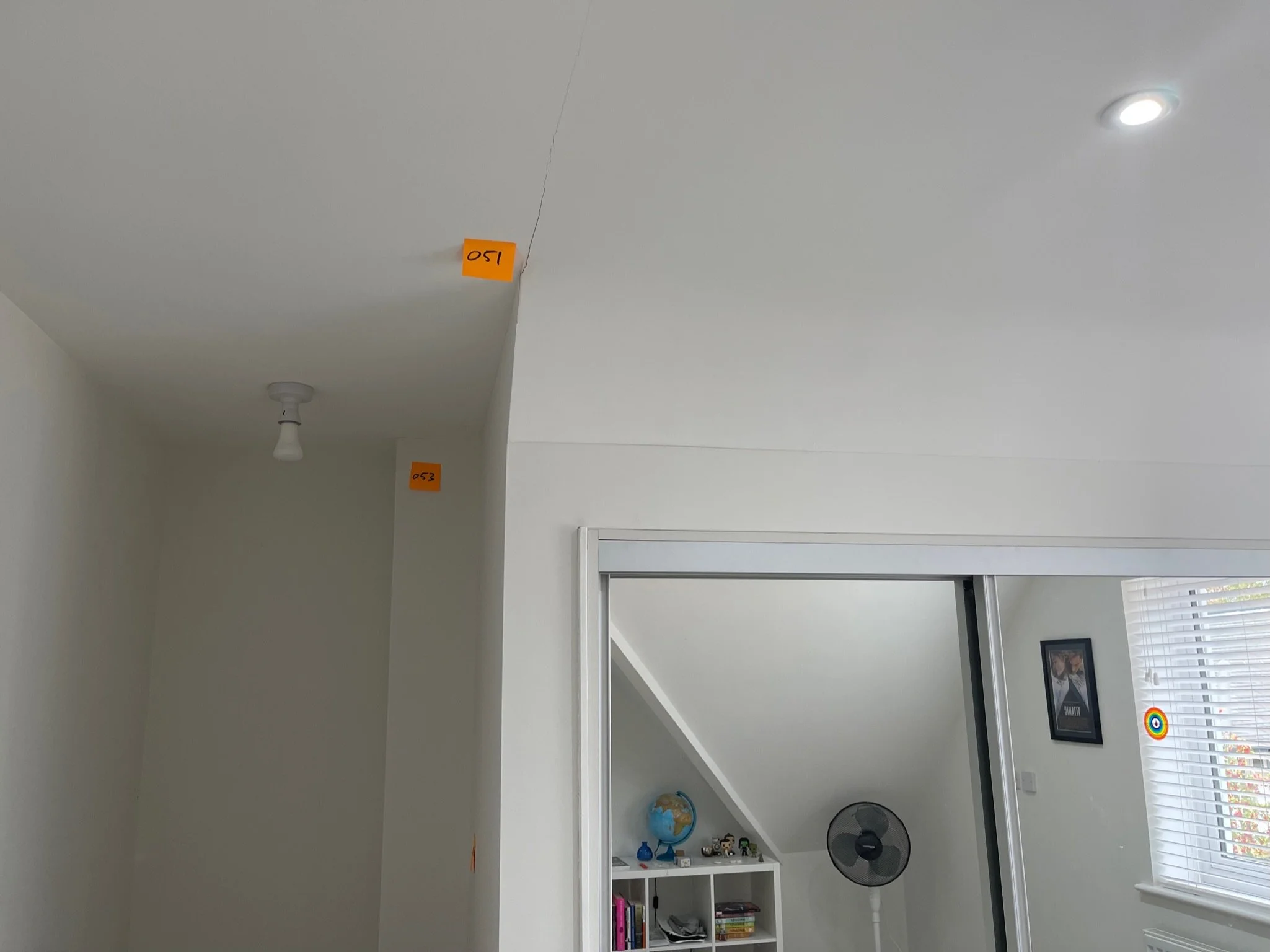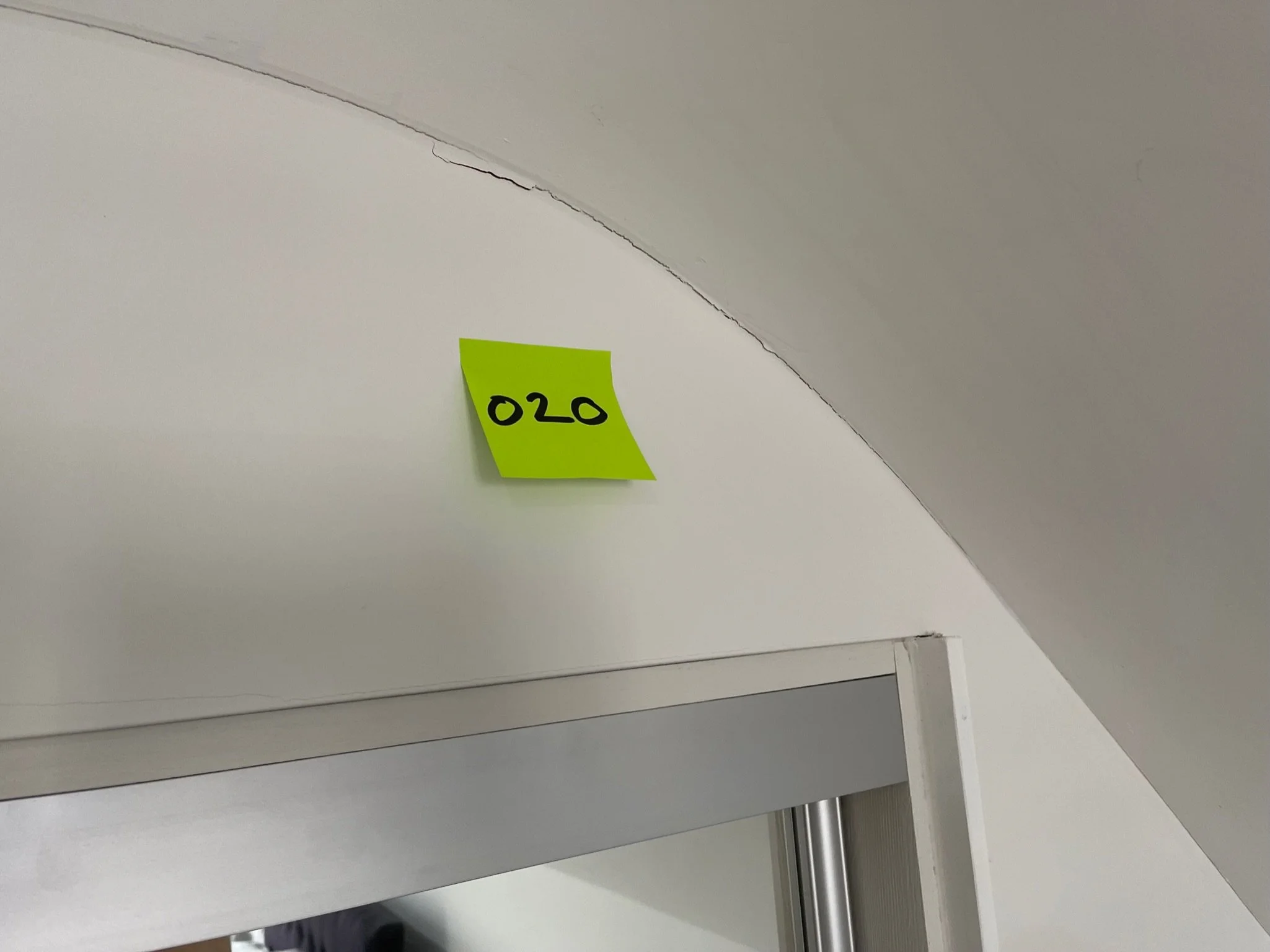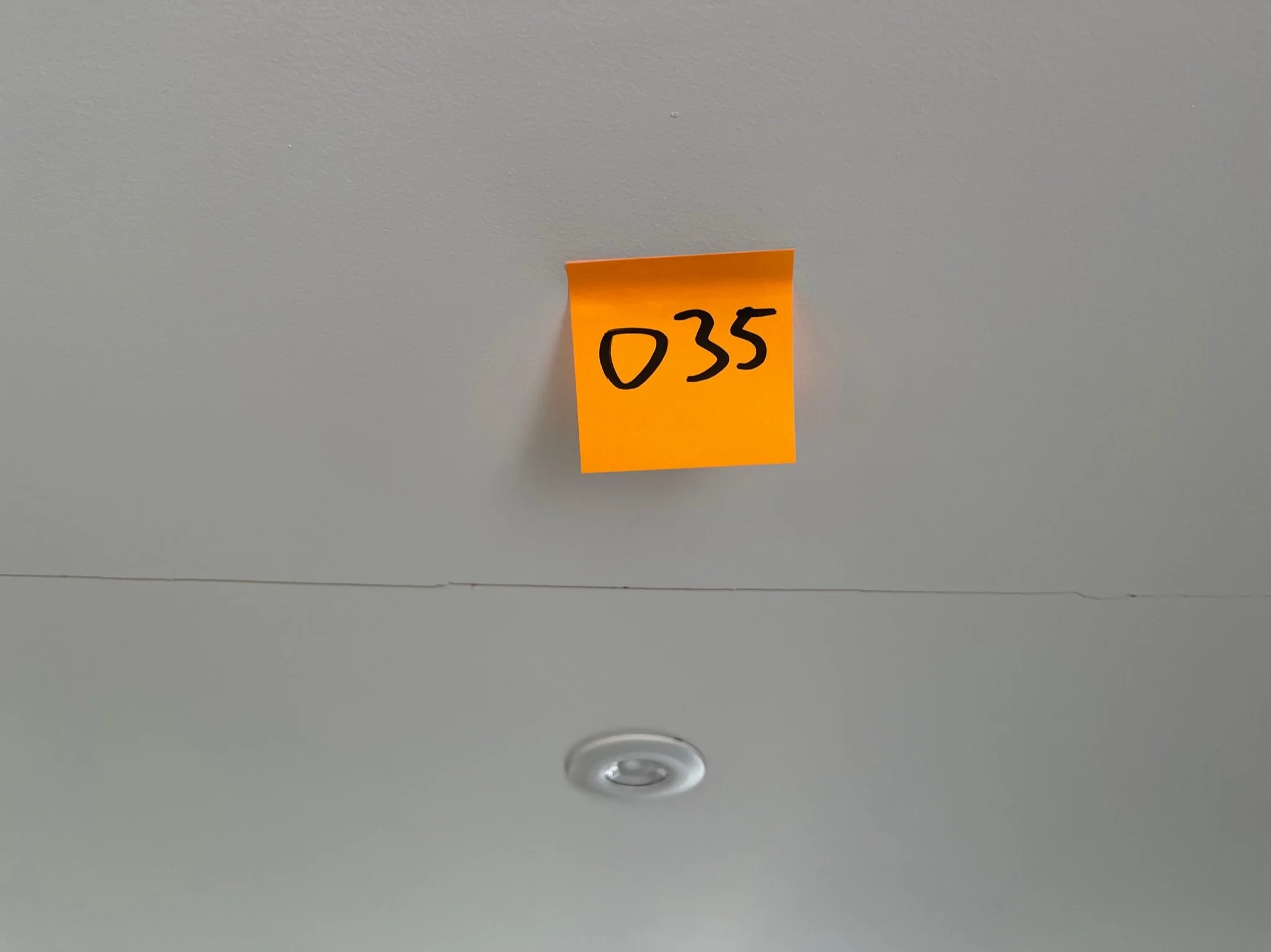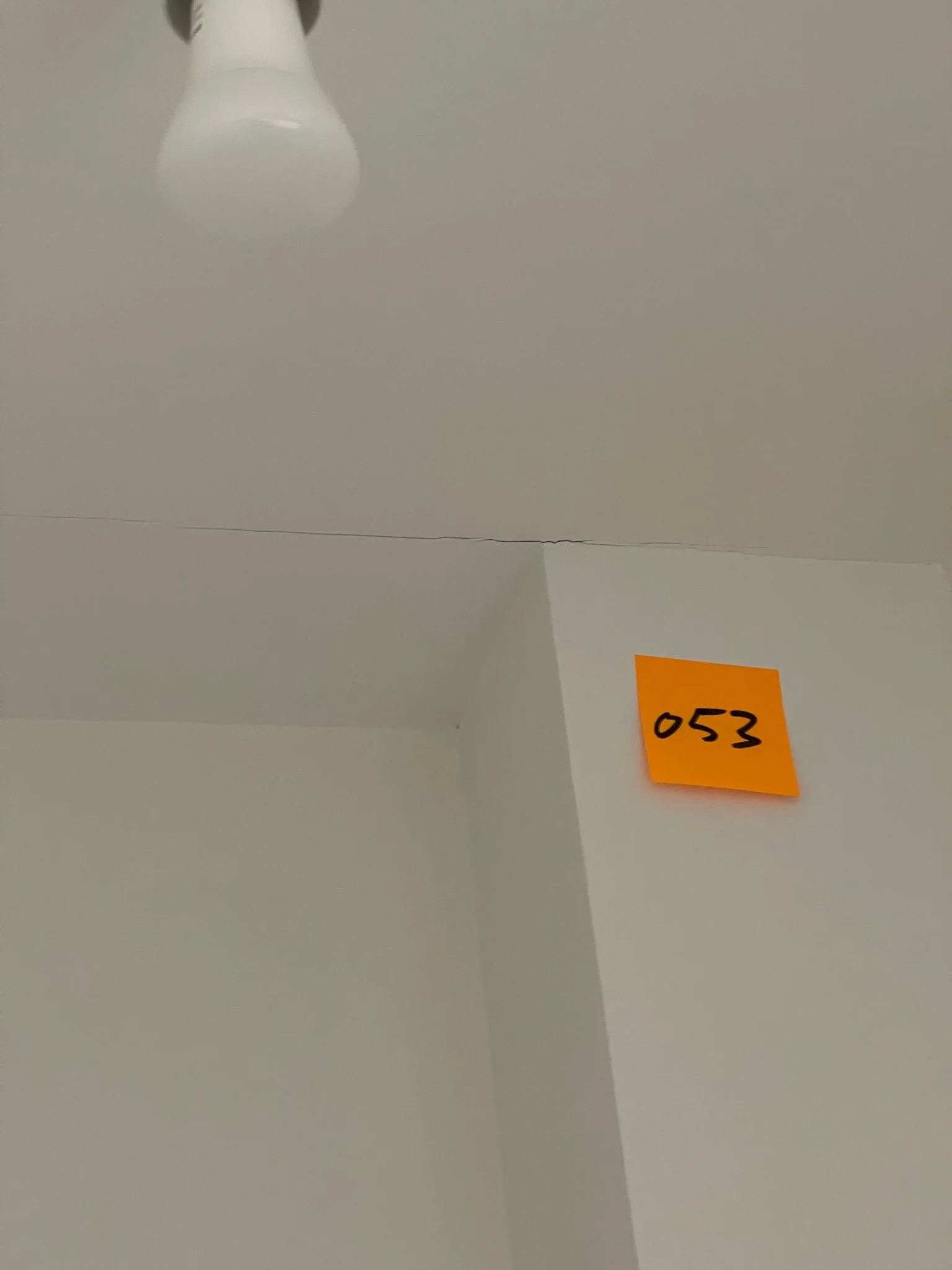 Crack in ceiling with a small orange sticky note labeled "050".