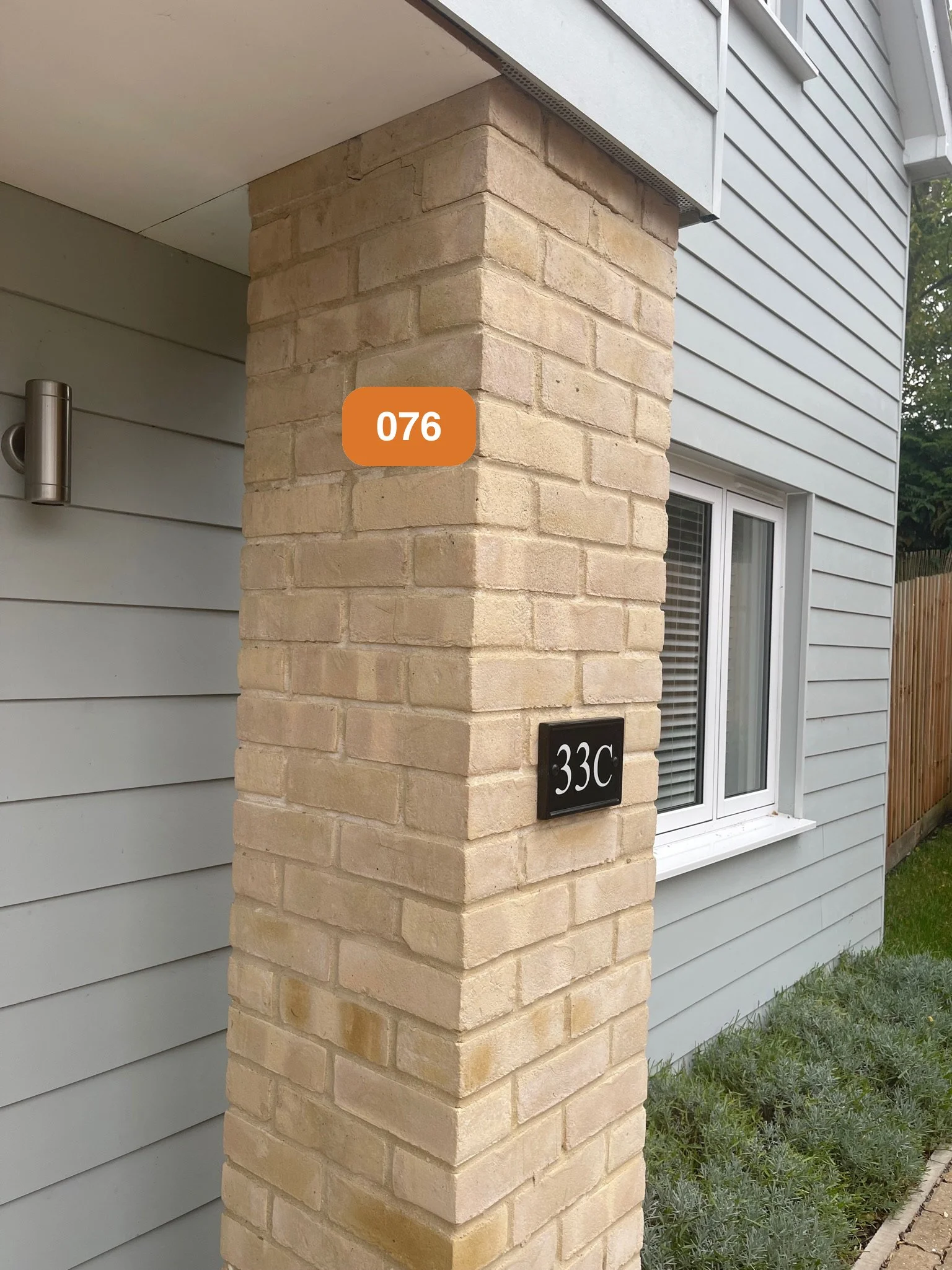 Exterior view of a house with gray siding, featuring a brick column displaying the house number 33C on a black plaque. A modern metal wall light is visible, and a small garden with greenery is partially seen.