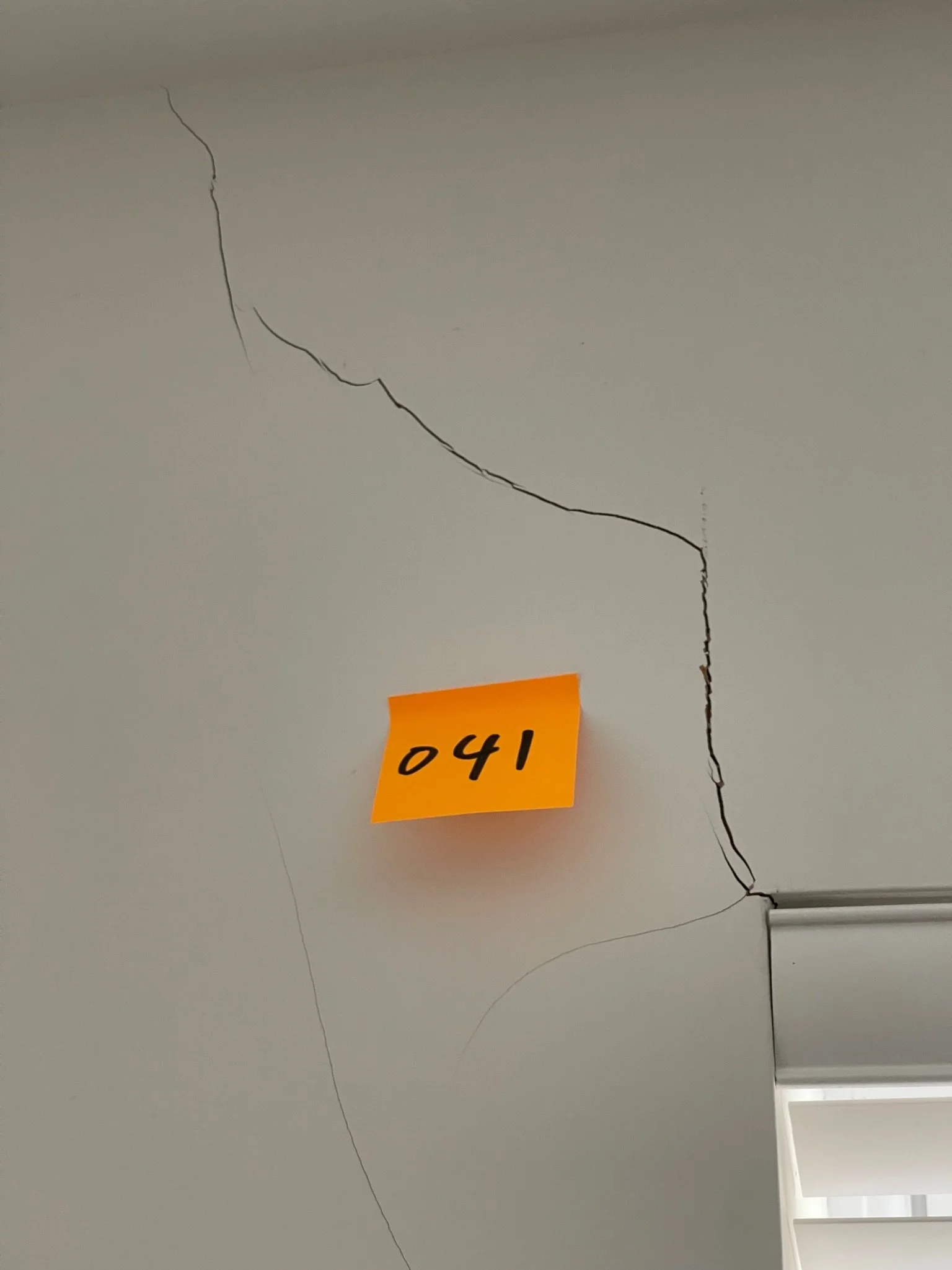 Cracked wall with a yellow sticky note labeled 041 next to window blinds.