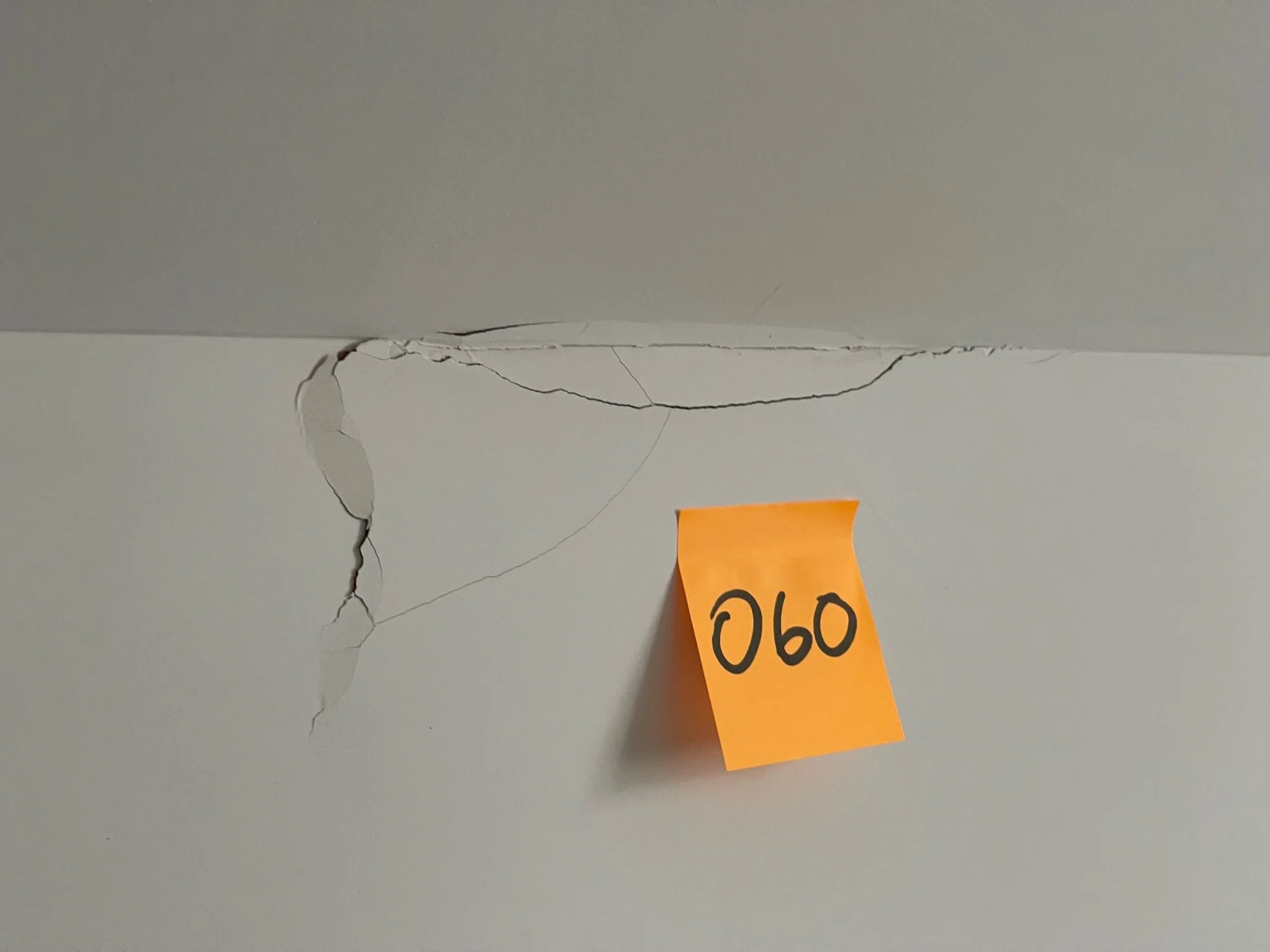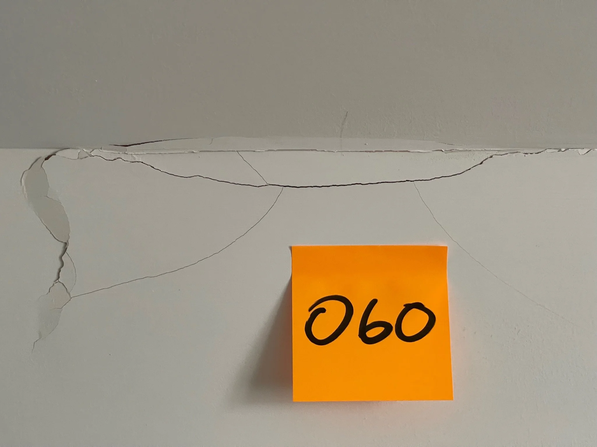 Crack on a wall with a yellow sticky note labeled '060'