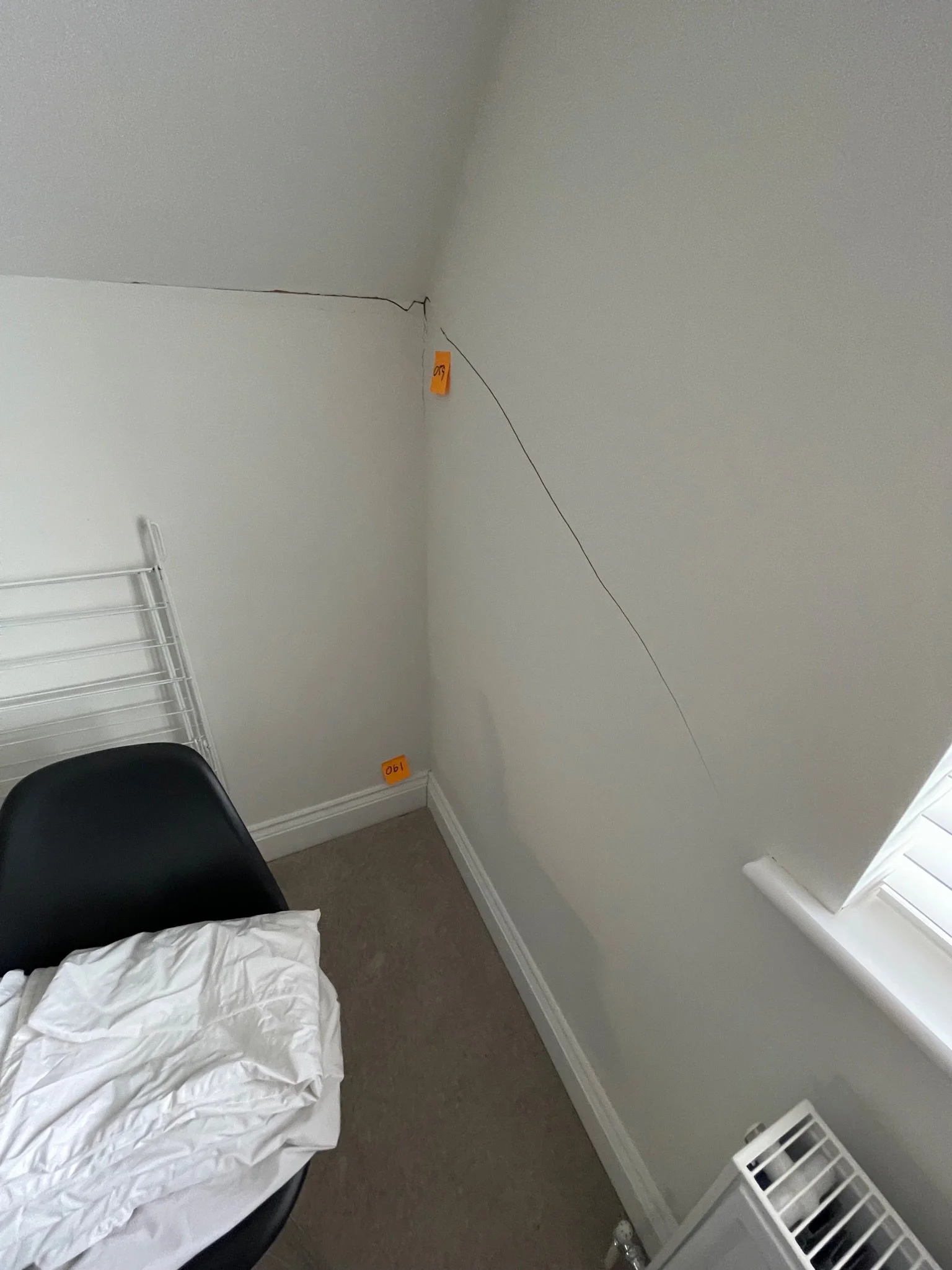Corner of a room with a crack in the wall and a numbered orange sticky note "061" on the wall above a carpeted floor.