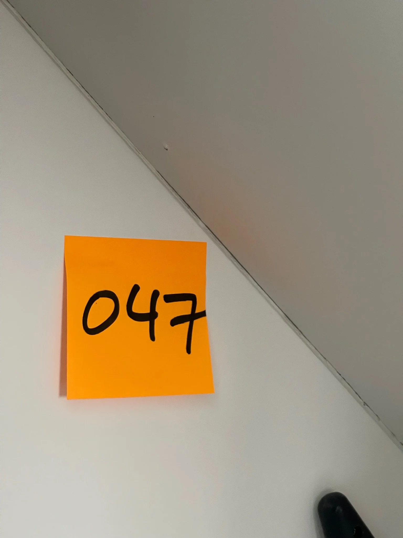 Orange sticky note on wall with number 047 written in black marker