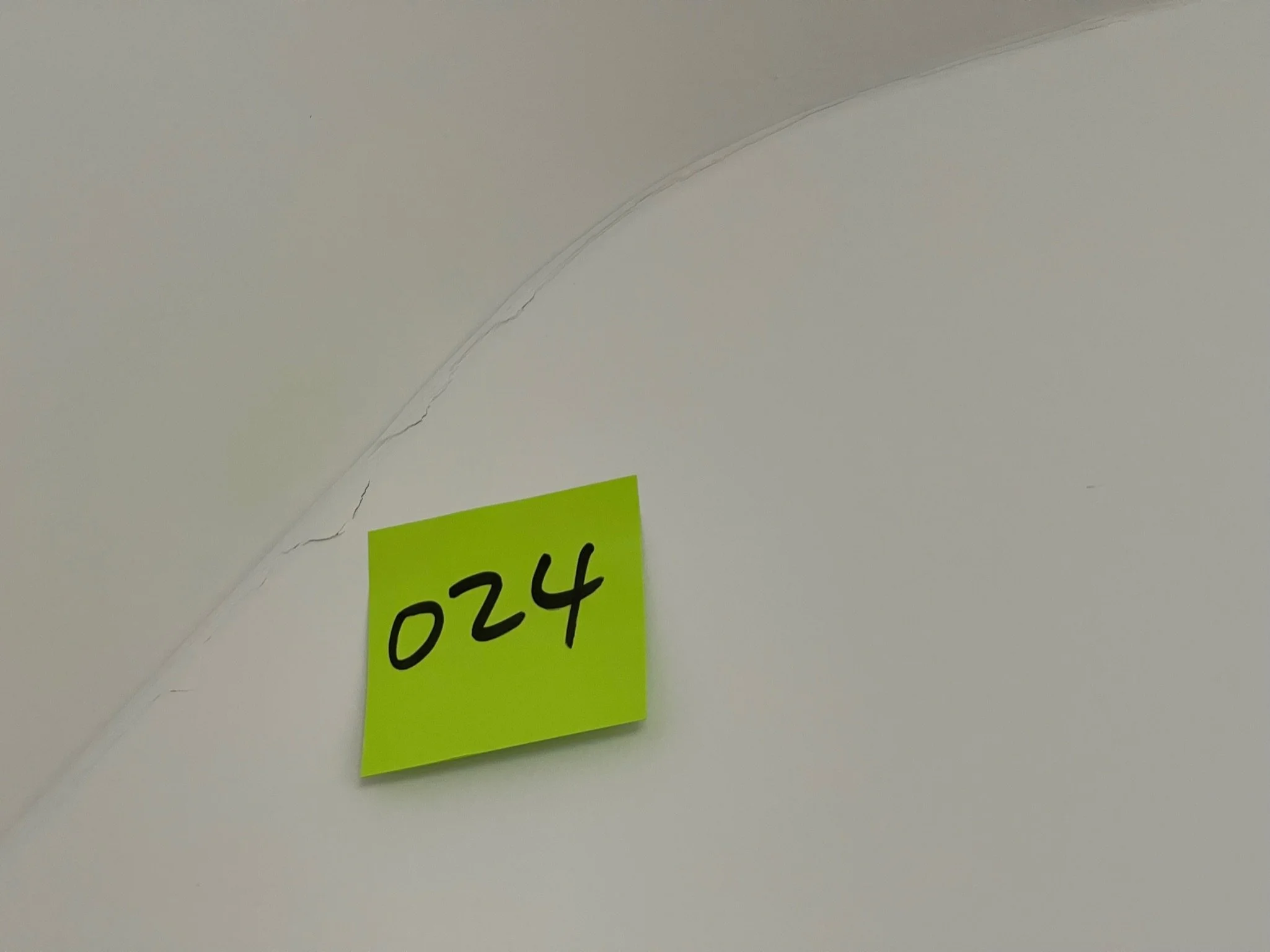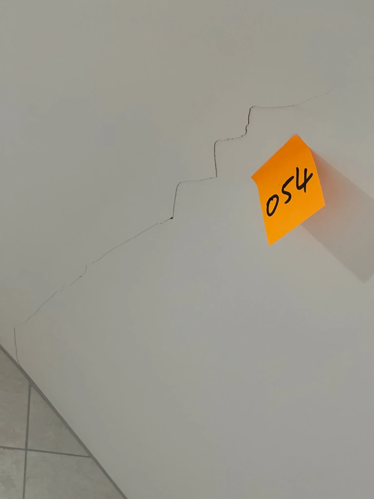 Crack in a white wall with a yellow sticky note labeled "054"