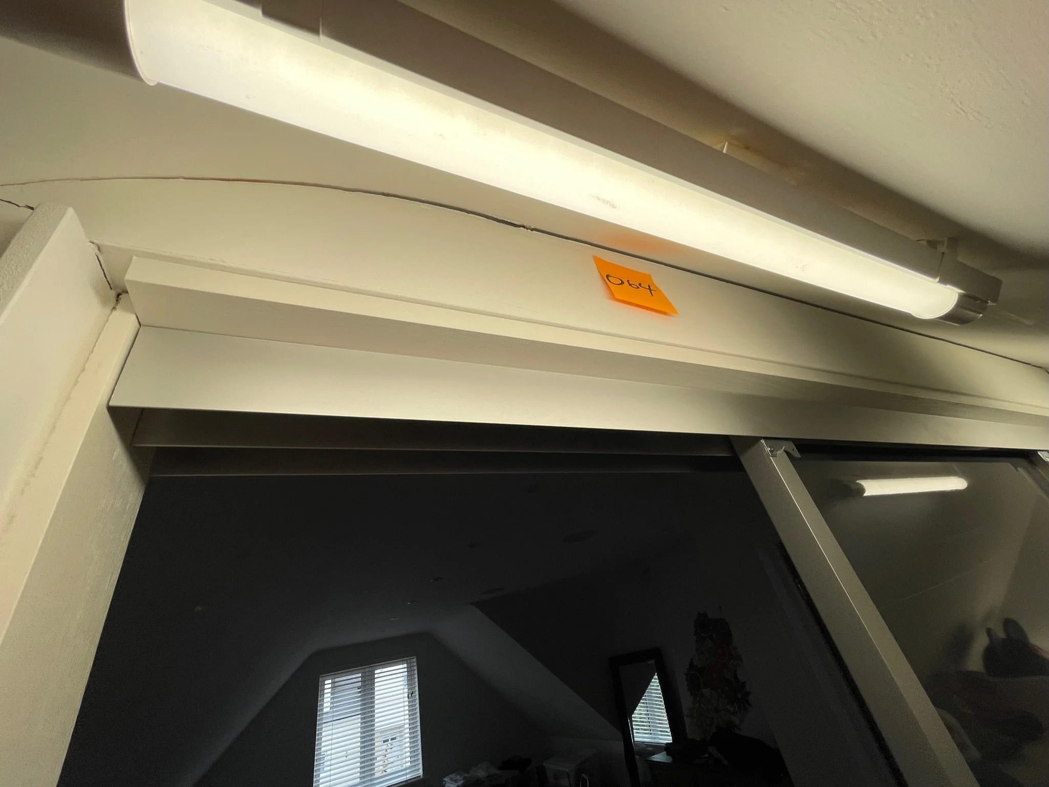 Fluorescent light fixture above sliding glass door with orange note labeled 064 on frame