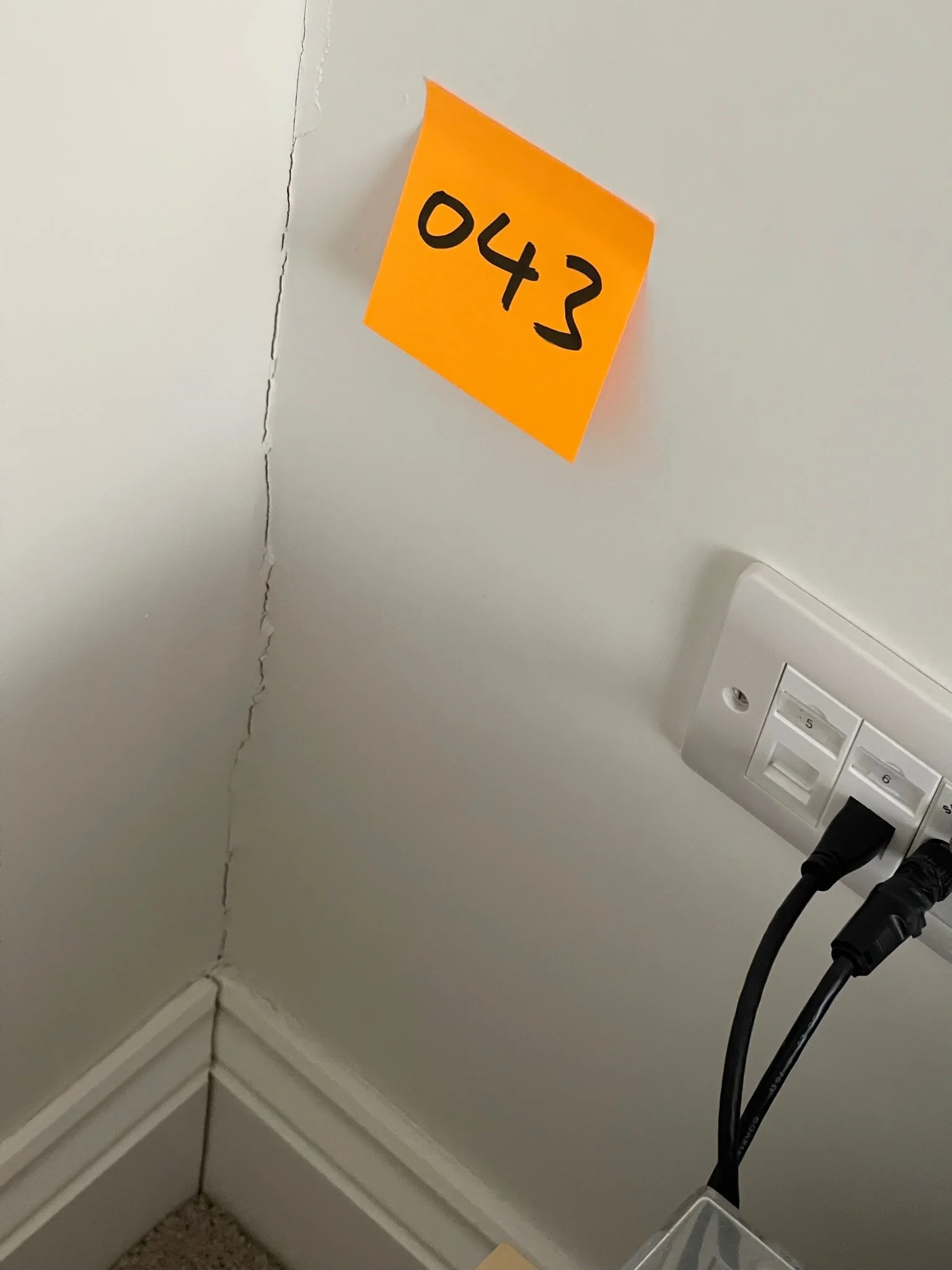 A wall corner with a crack, an orange sticky note with '043,' and a nearby wall socket with plugged cables.