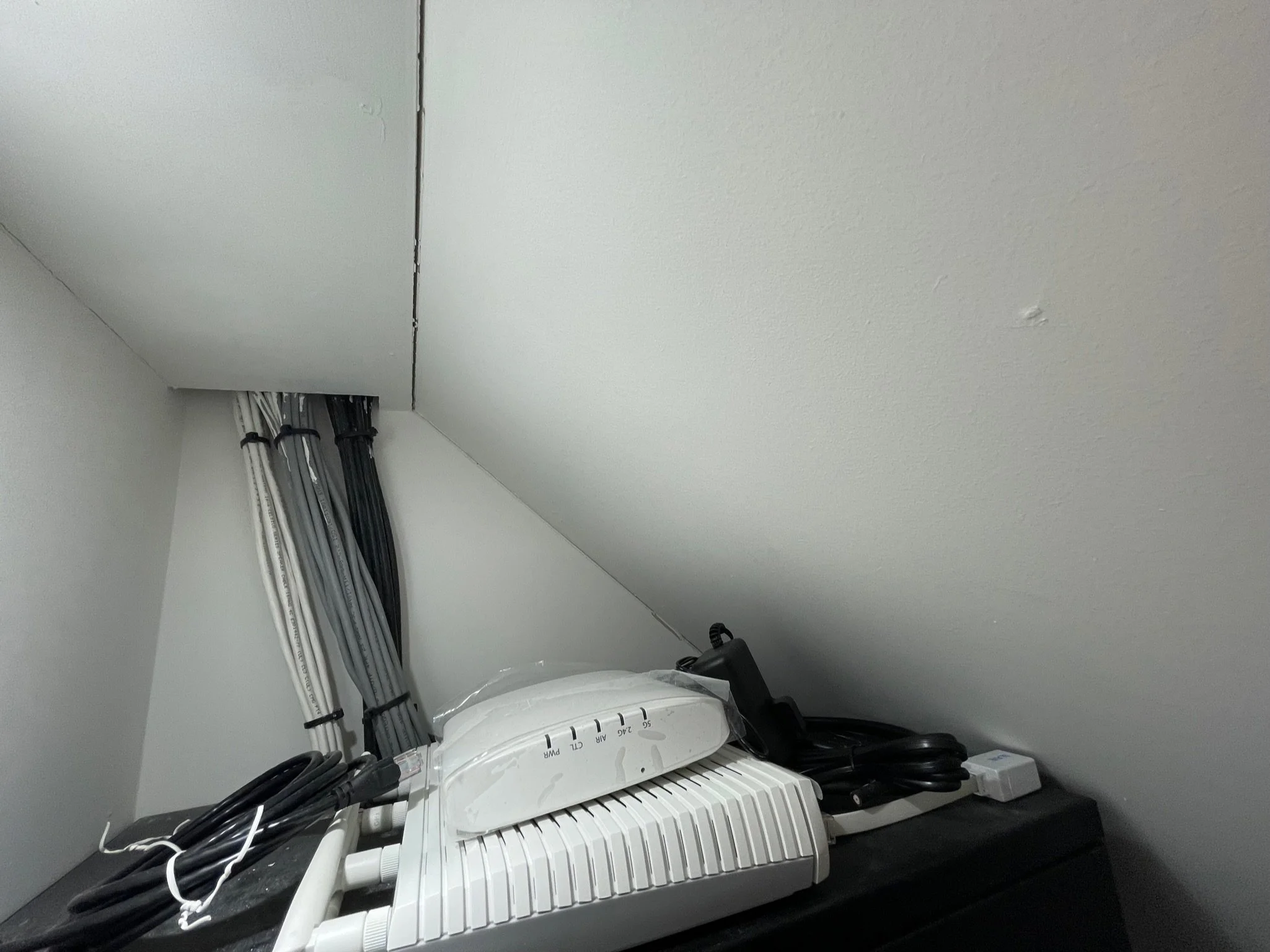 Network cables and a router in a corner space, with a white and gray wall background.