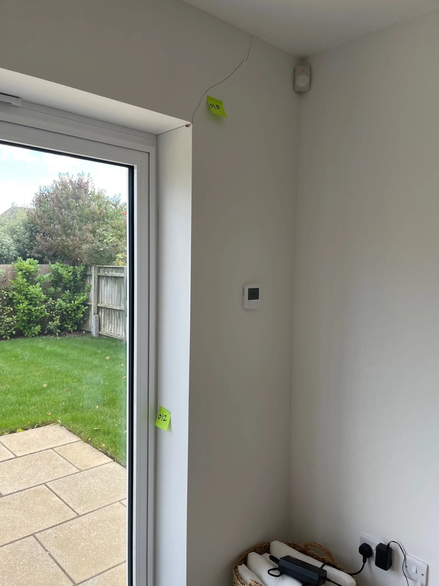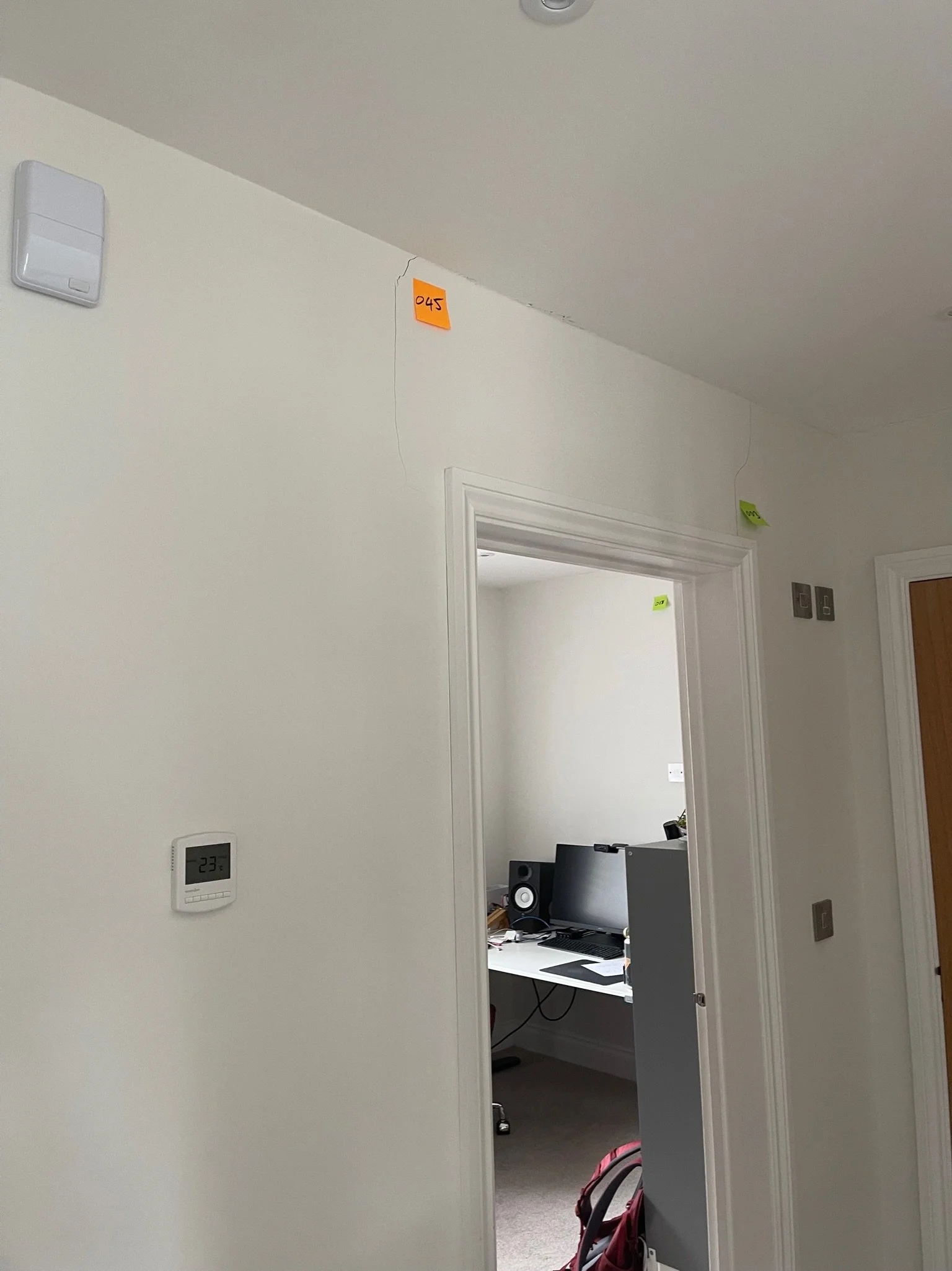 Interior hallway view with a white wall, a small crack marked with numbered stickers, a thermostat, and a room with a desk and computer setup visible through an open door.