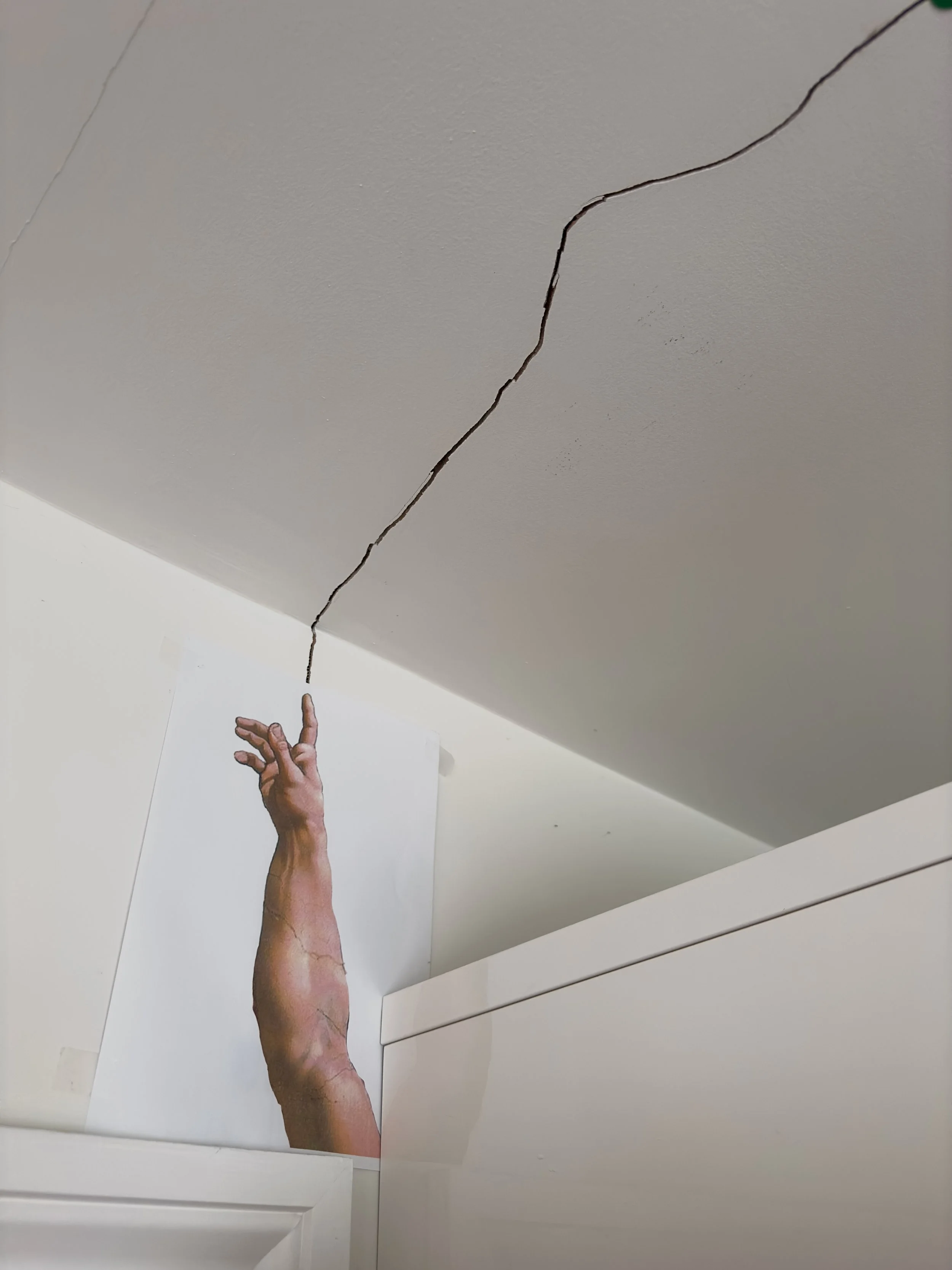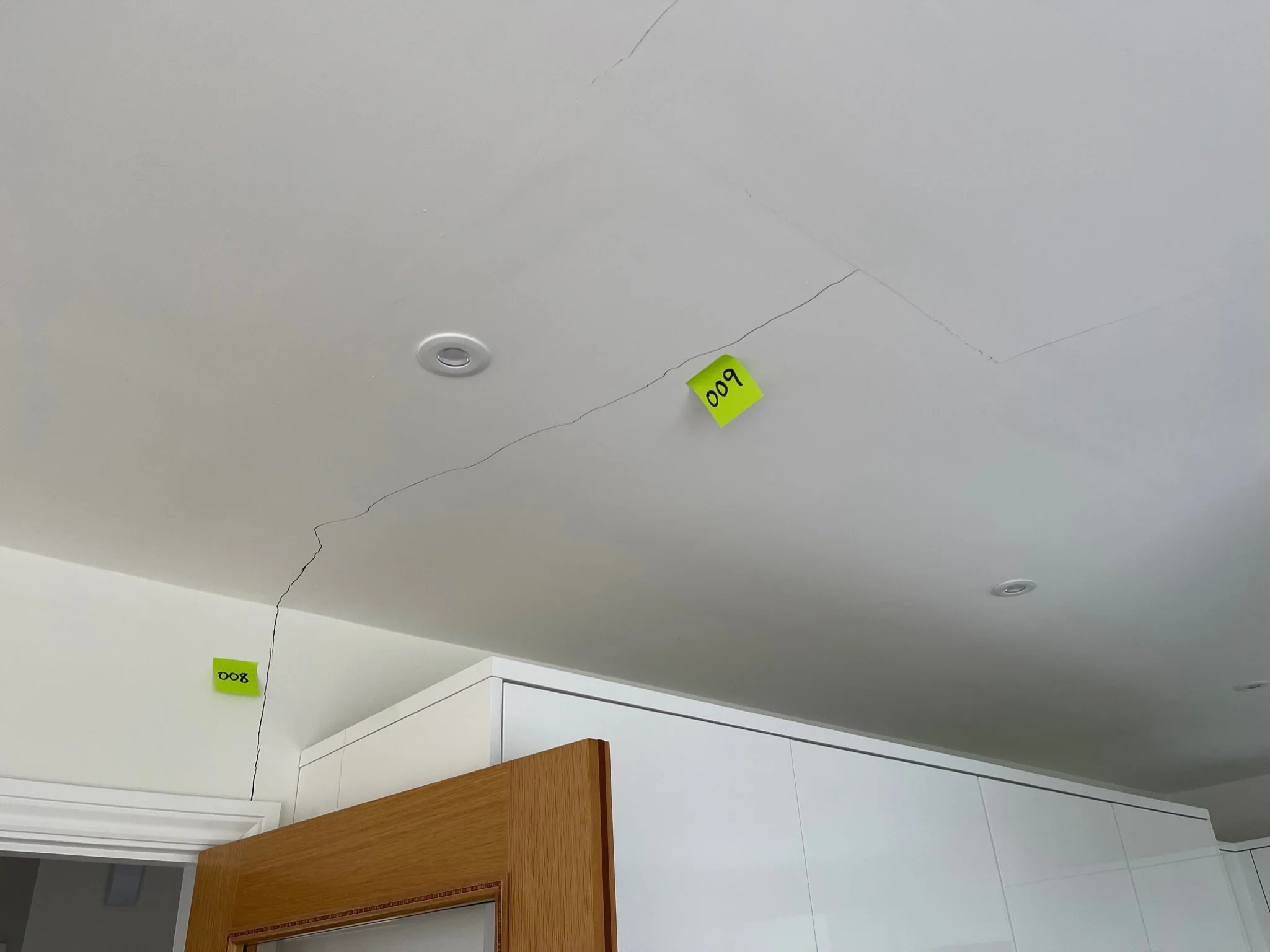 Ceiling crack with yellow sticky note labeled '250'