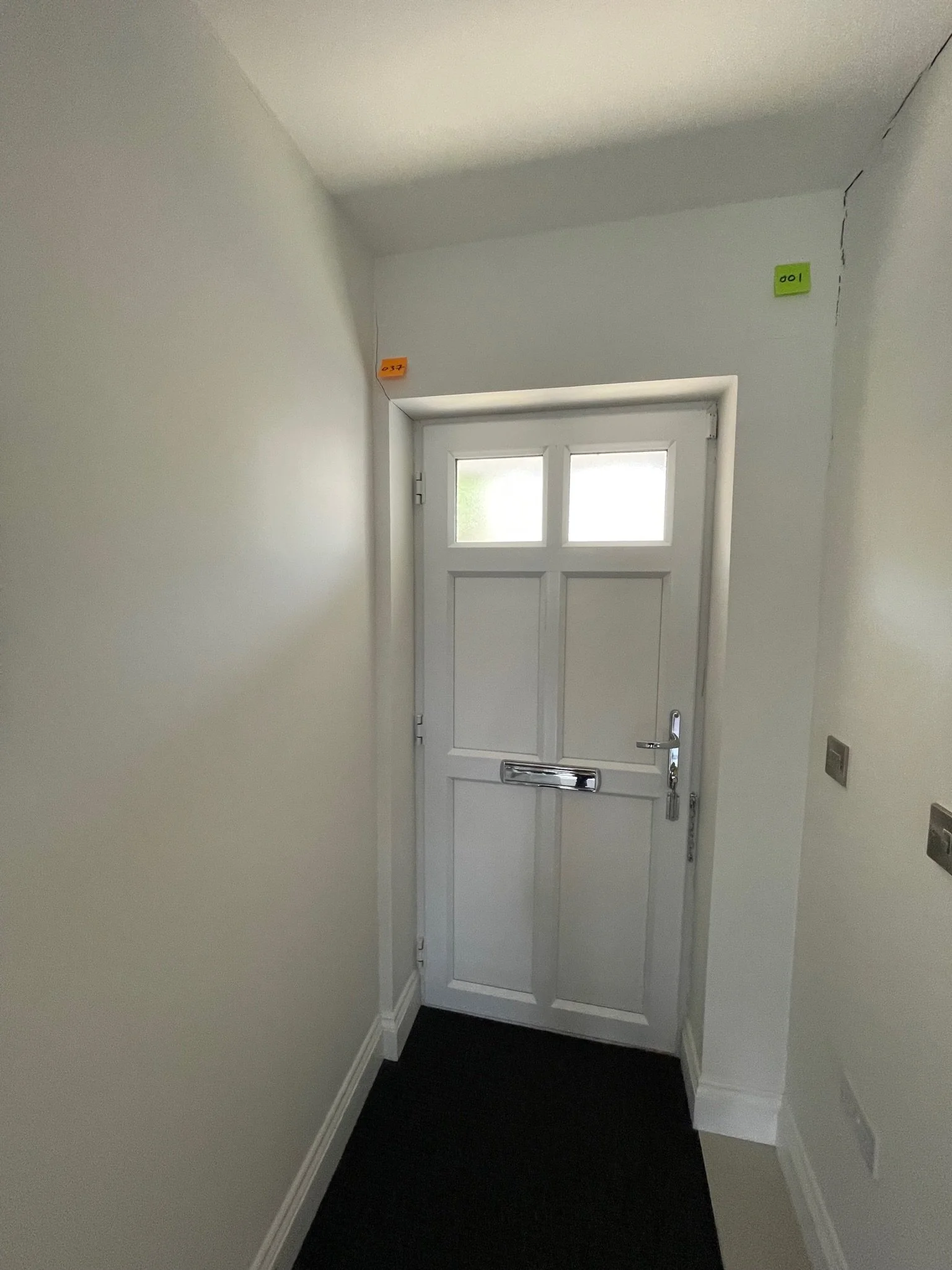 A white interior door with a mail slot, flanked by a narrow hallway with white walls and a dark floor mat. Small colored wall markers are visible above the door.
