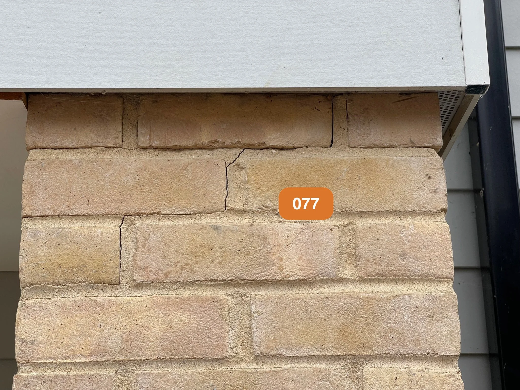 Close-up of a brick wall with visible cracks and an orange label with the number 077.
