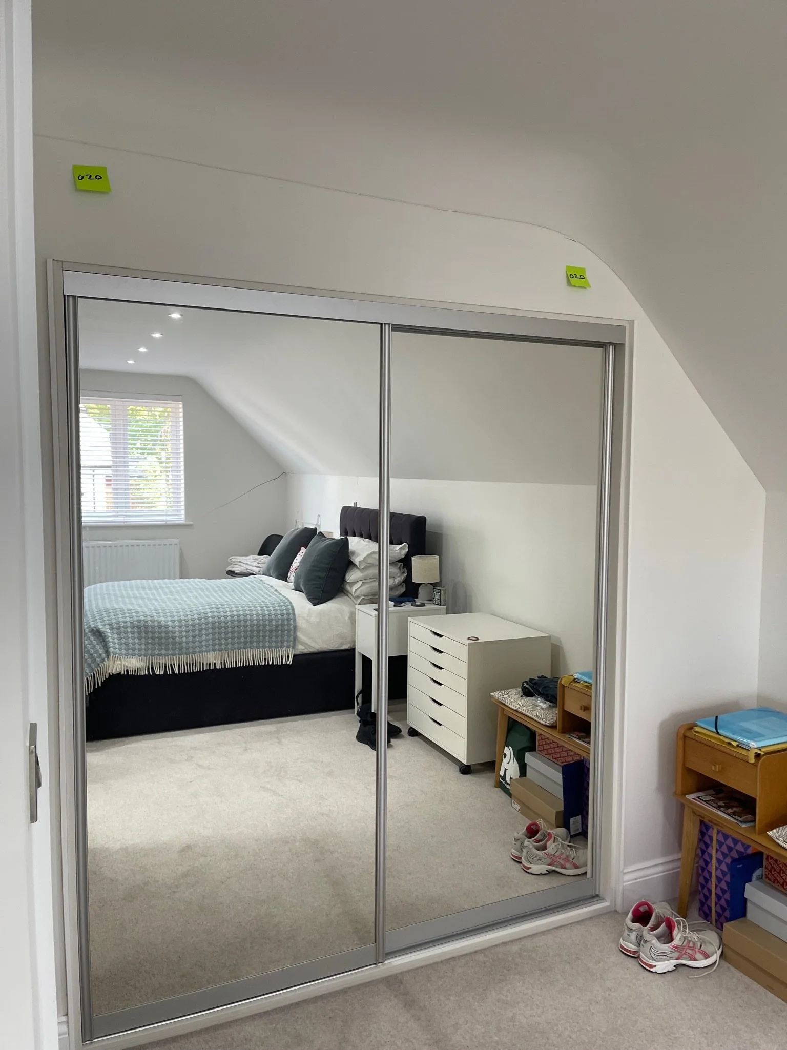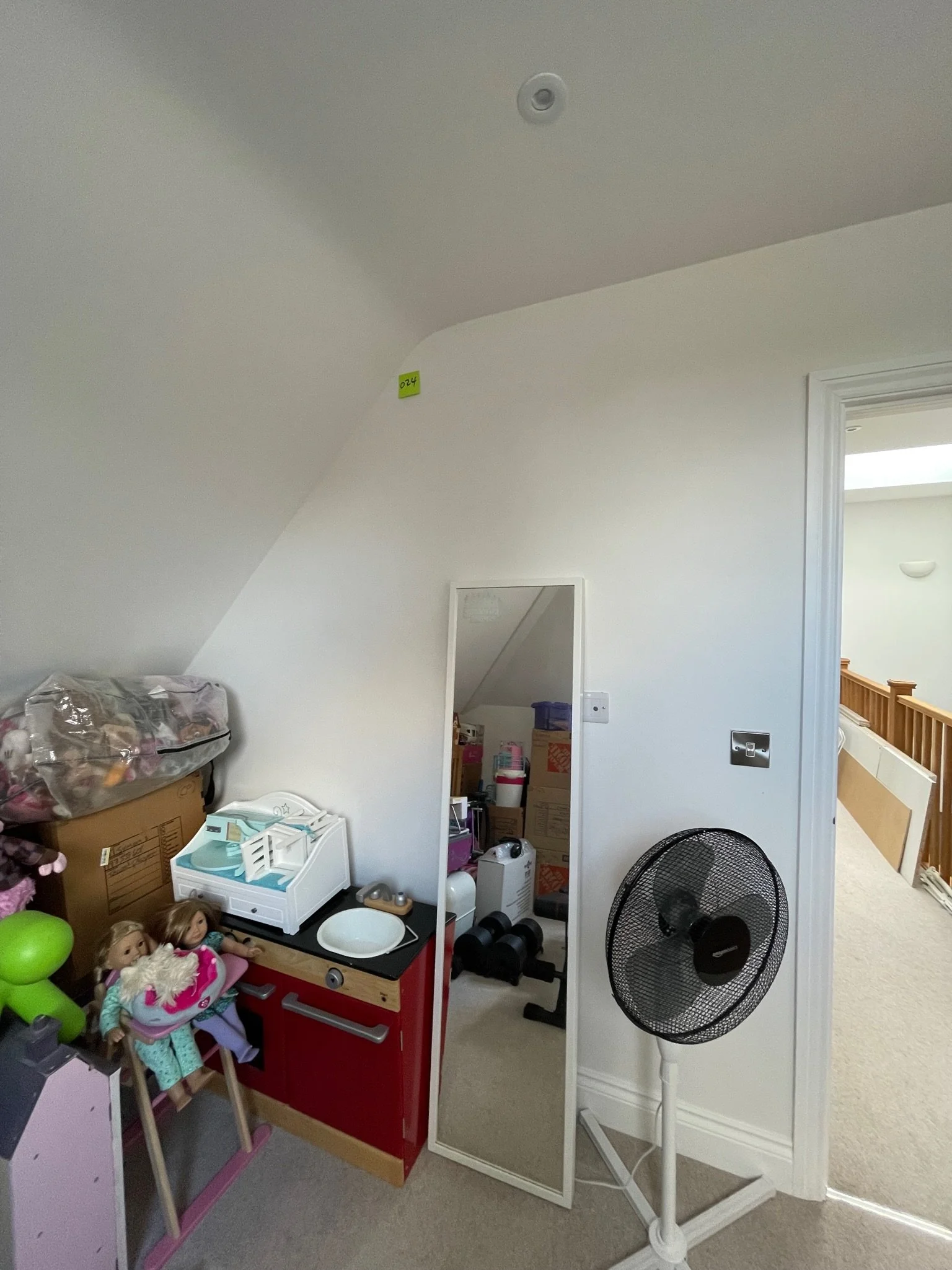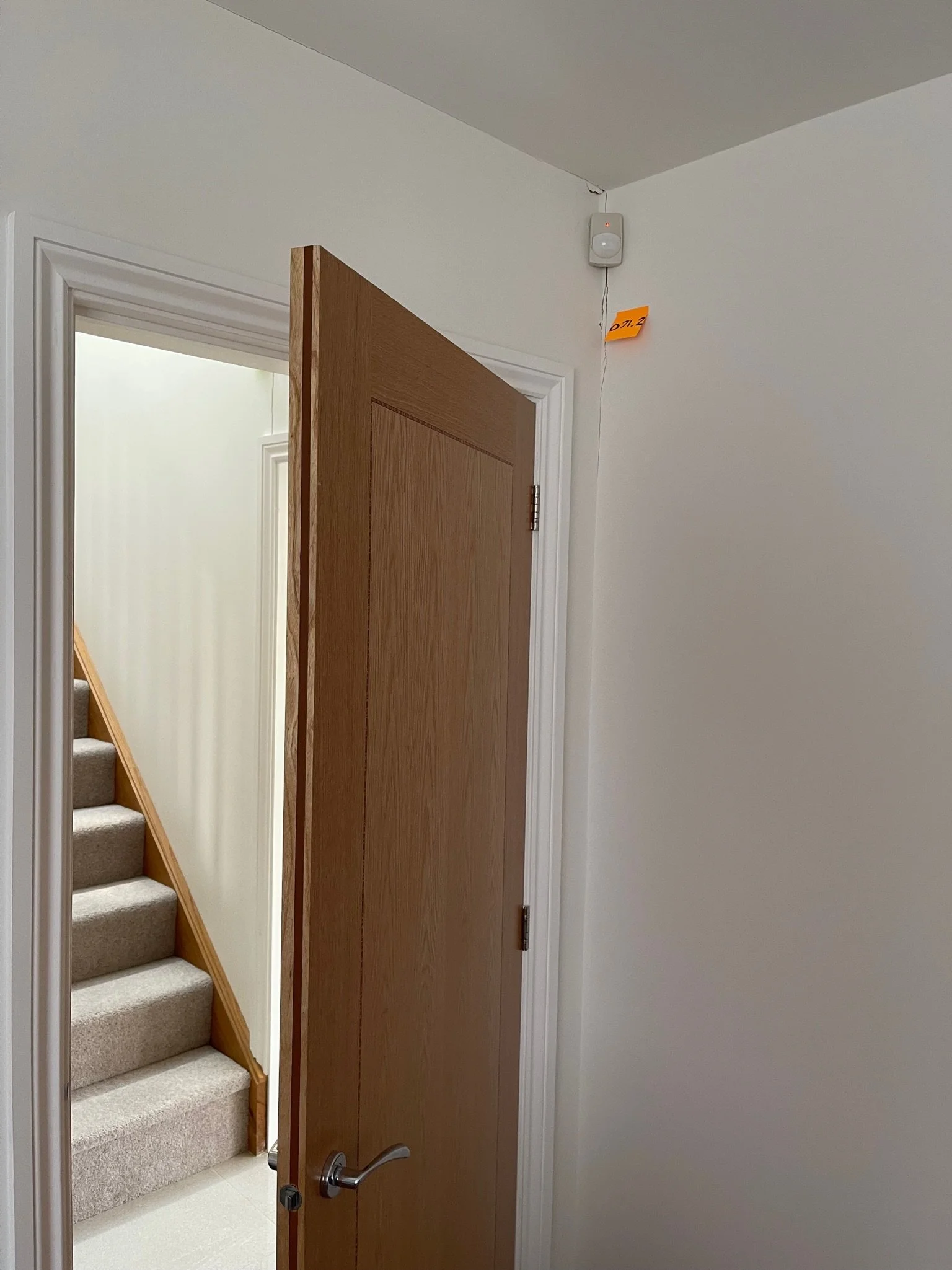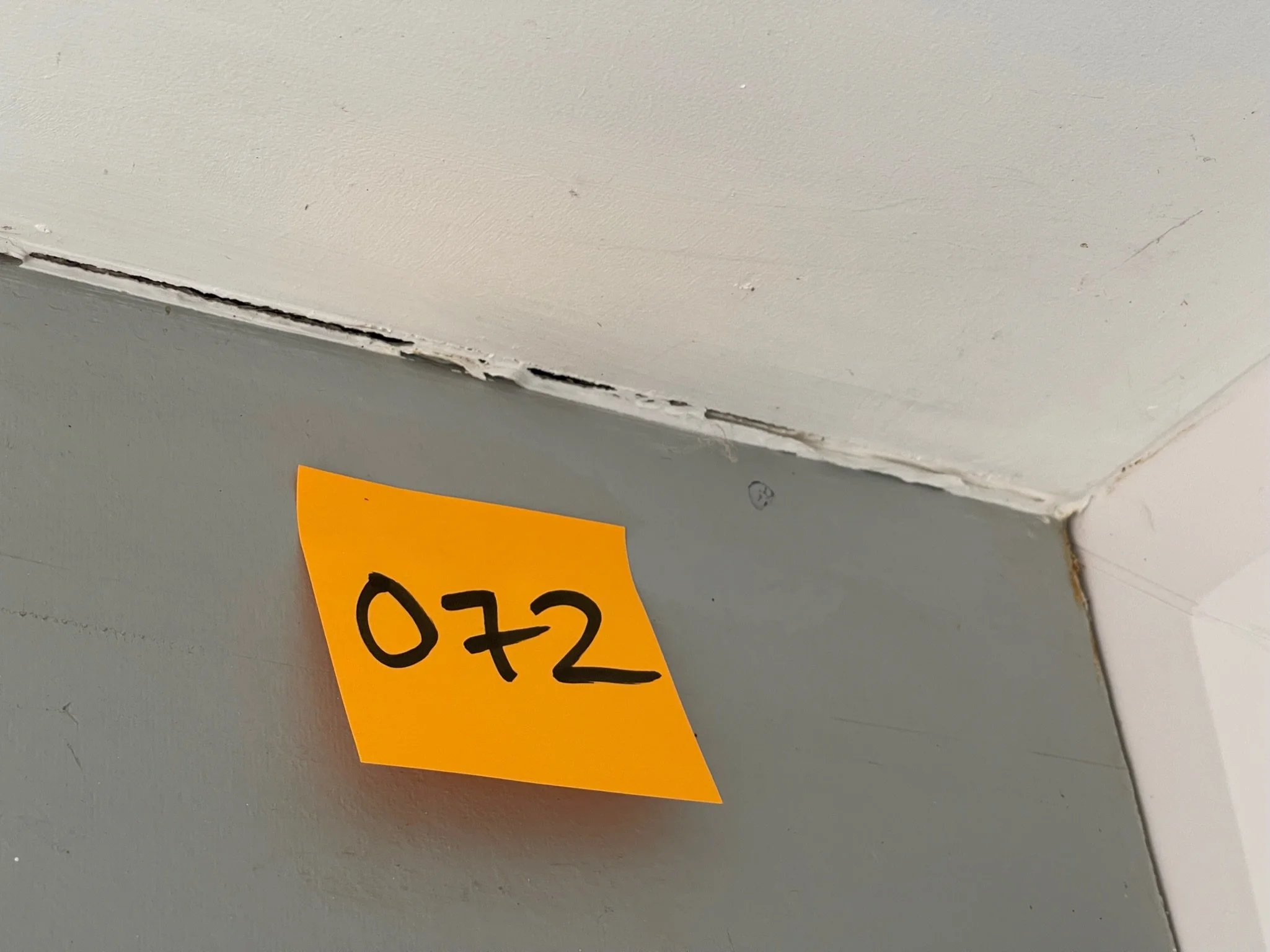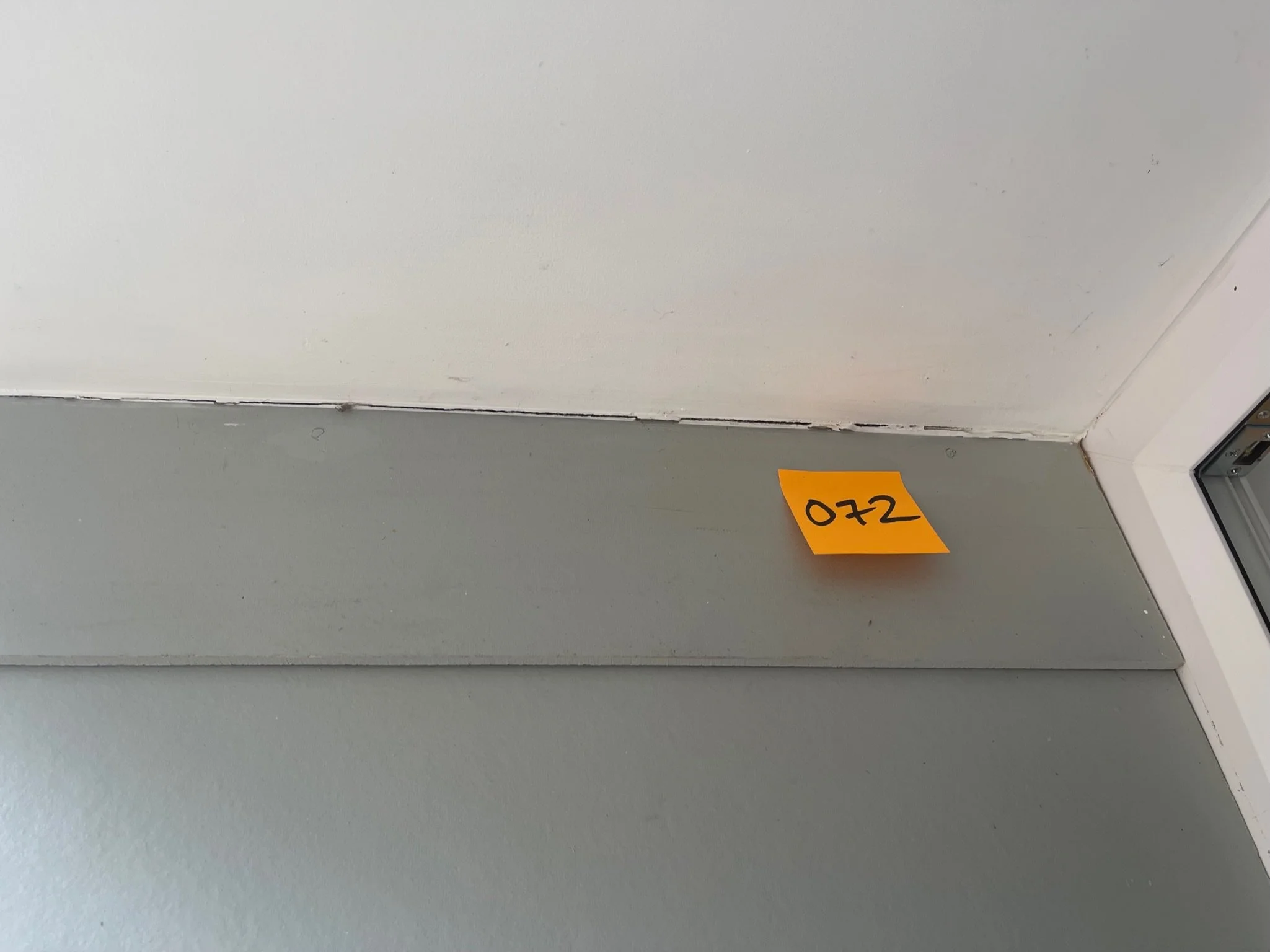Corner of a room with an orange sticky note showing the number 072.