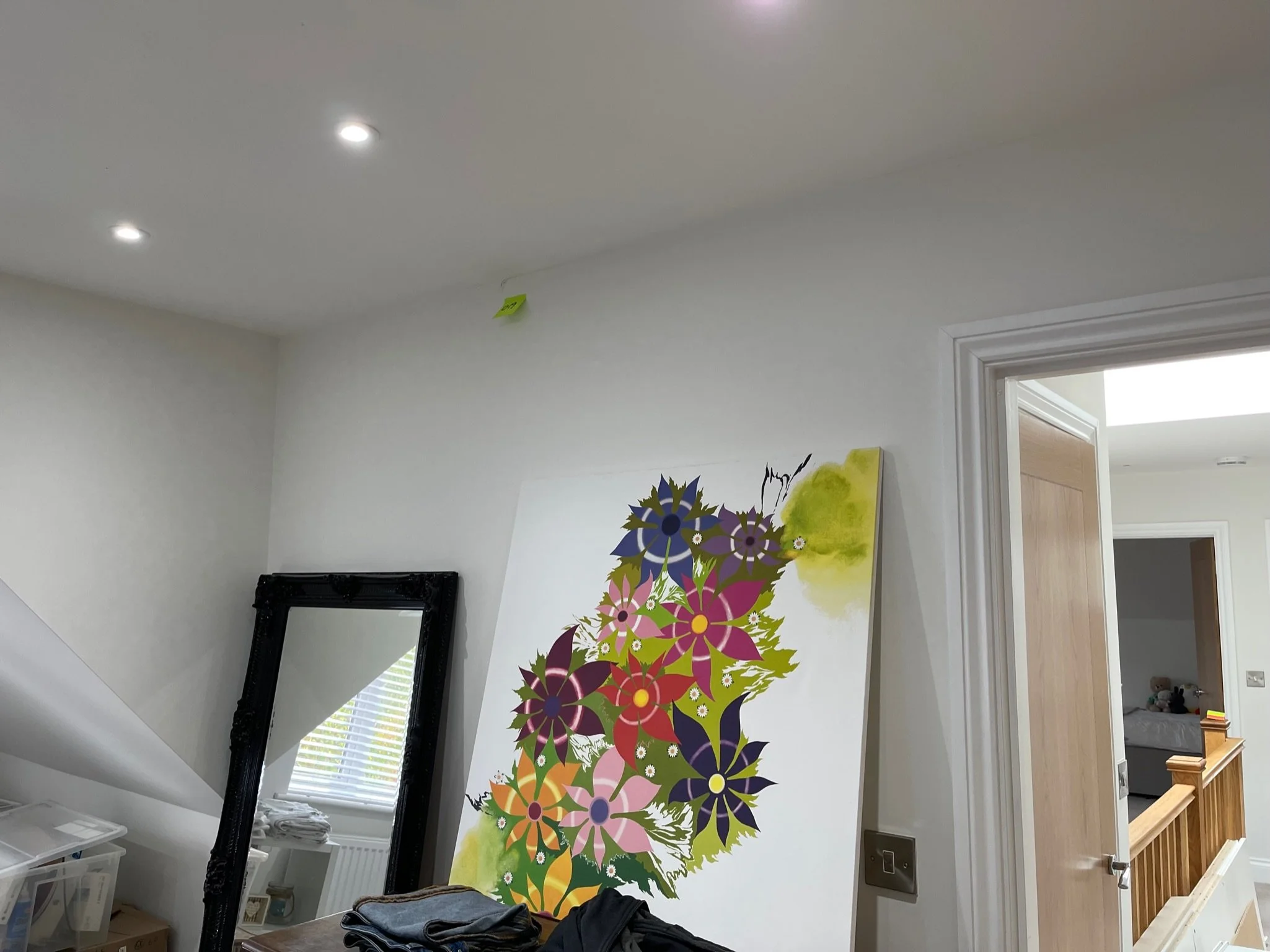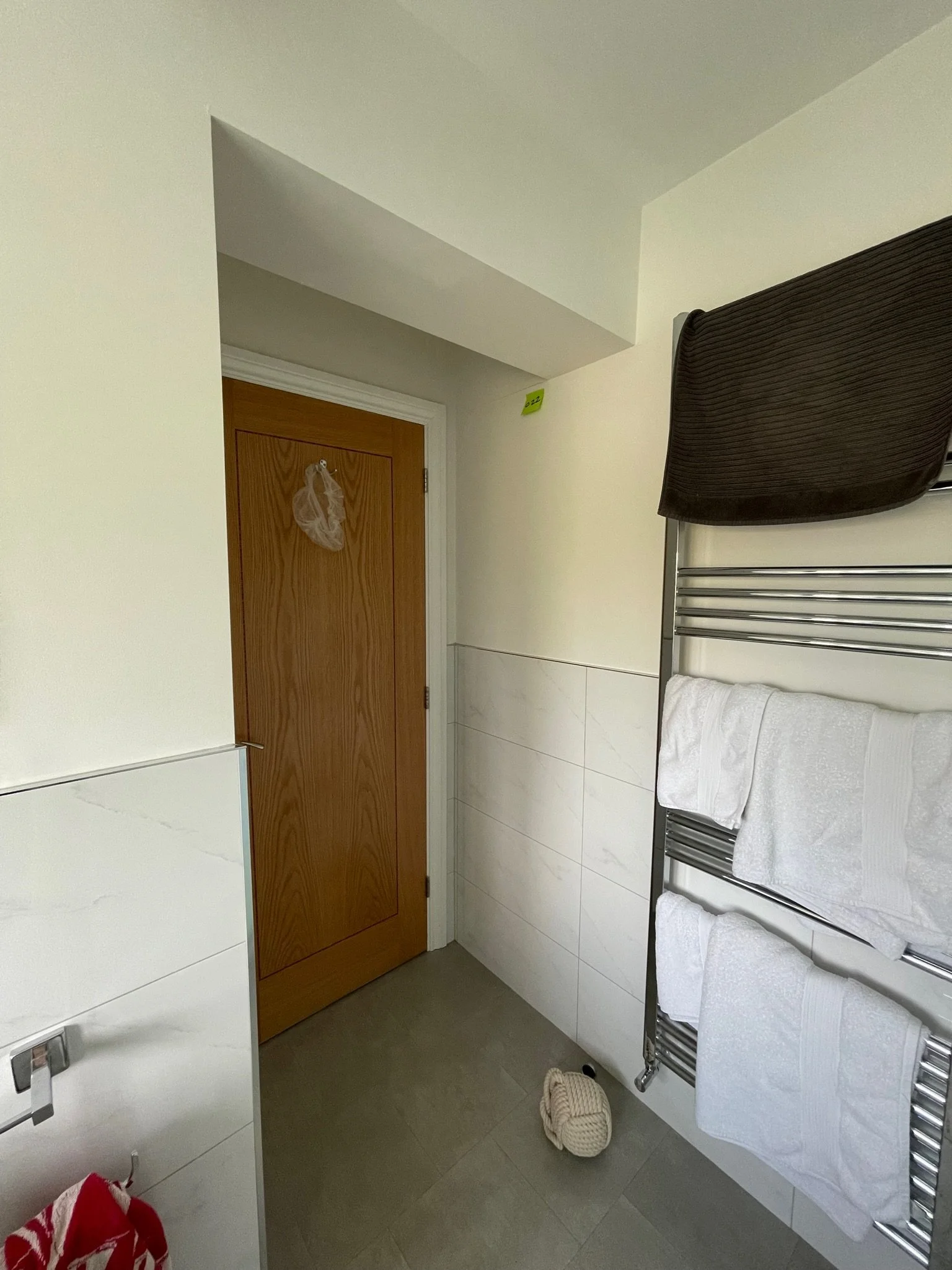 Corner of a room with closed white door and small orange sticky note on the wall.