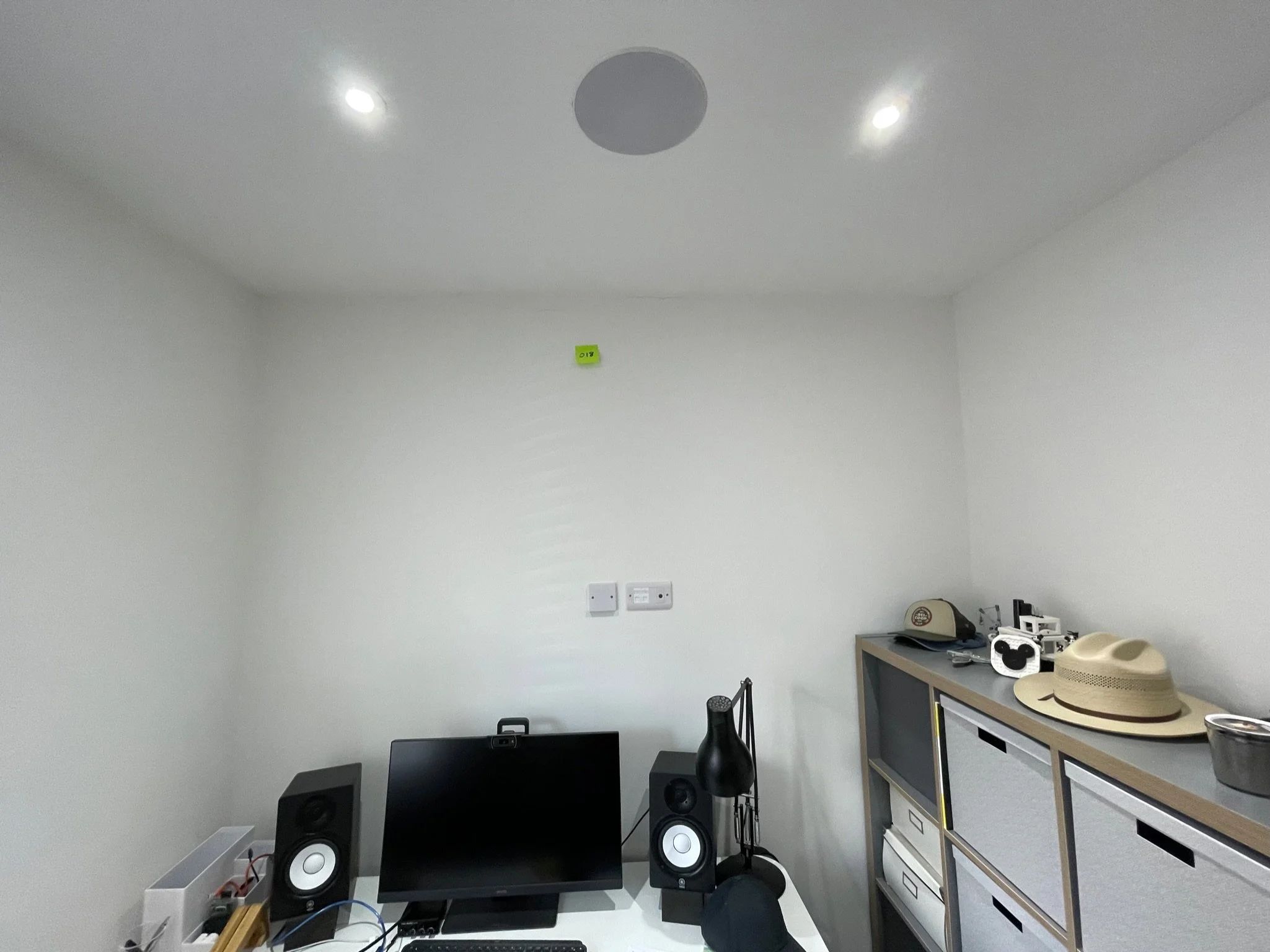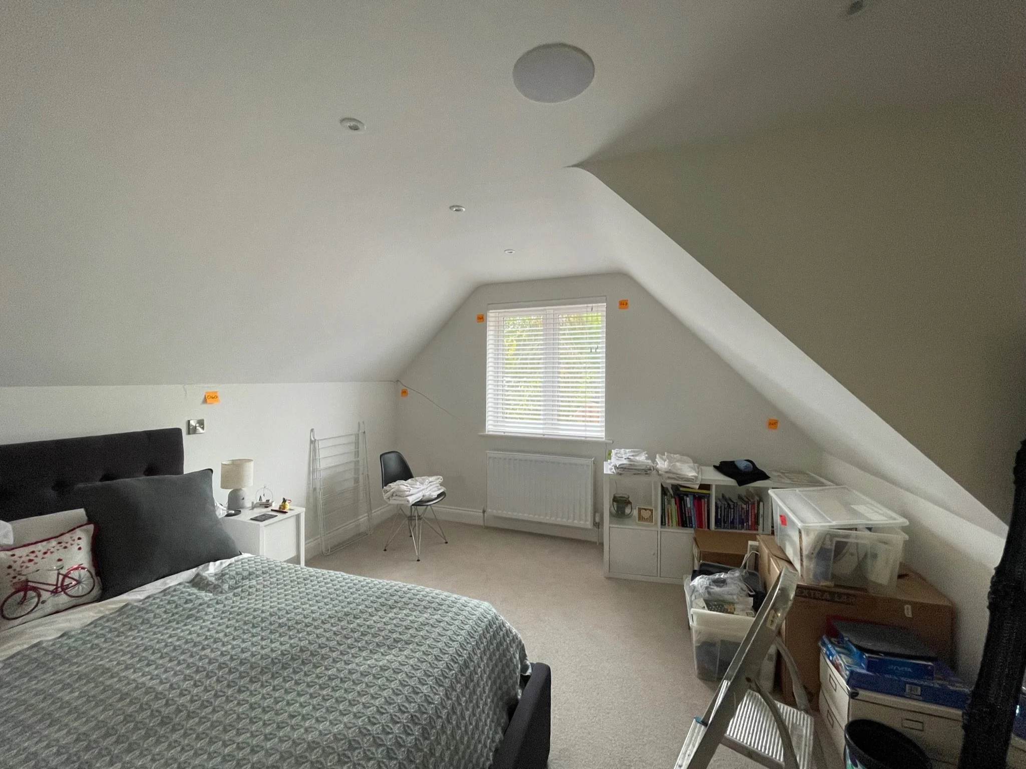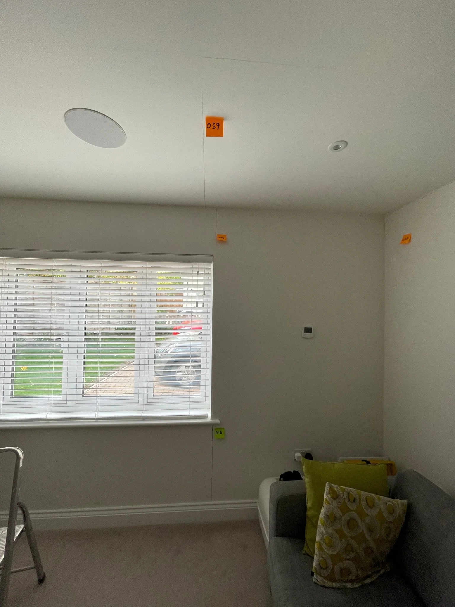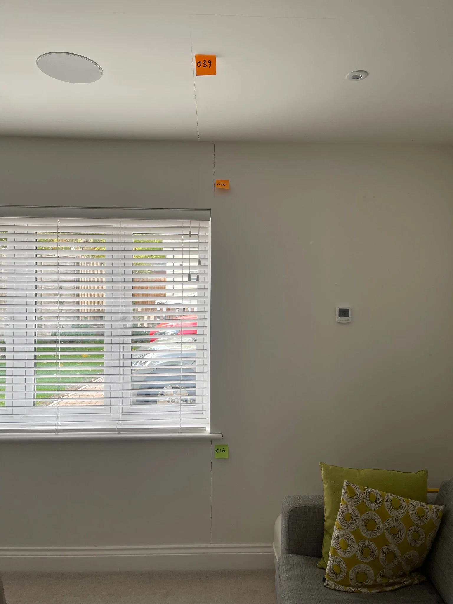 Living room interior with a grey sofa, patterned pillows, a window with white blinds, ceiling speakers, recessed lighting, and numbered sticky notes on walls and ceiling.