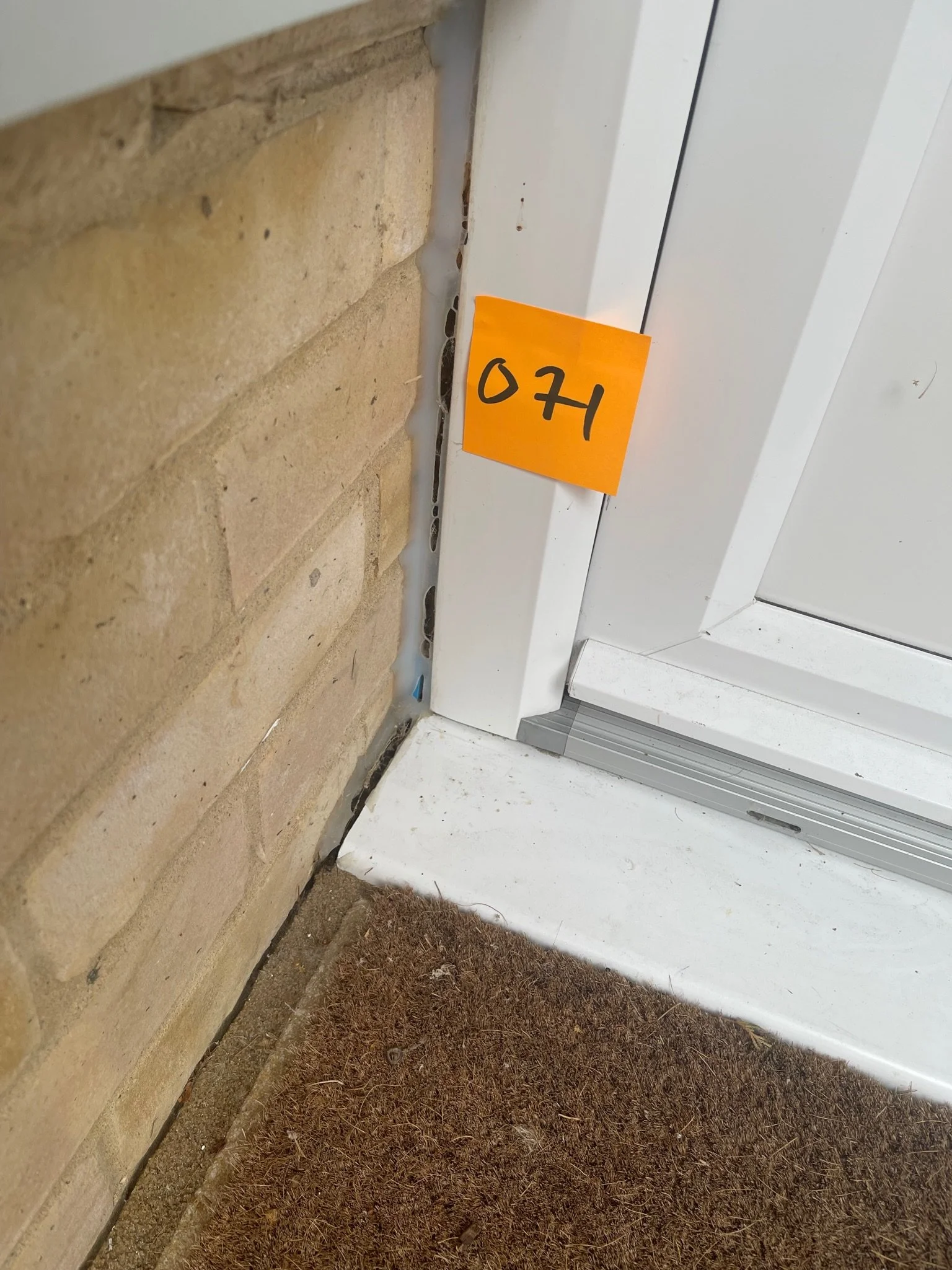 Corner of a brick wall next to a white doorframe with an orange sticky note labeled '071' and a brown doormat at the bottom.