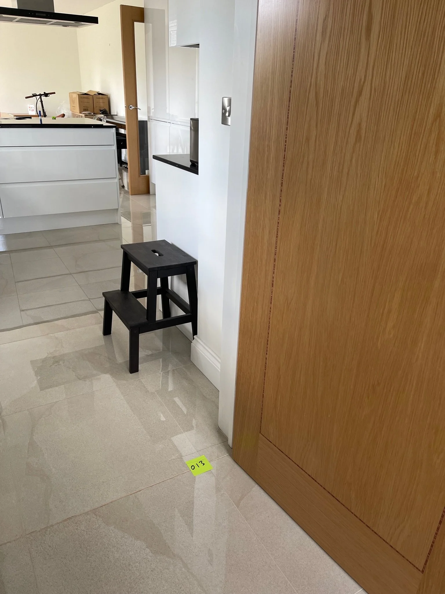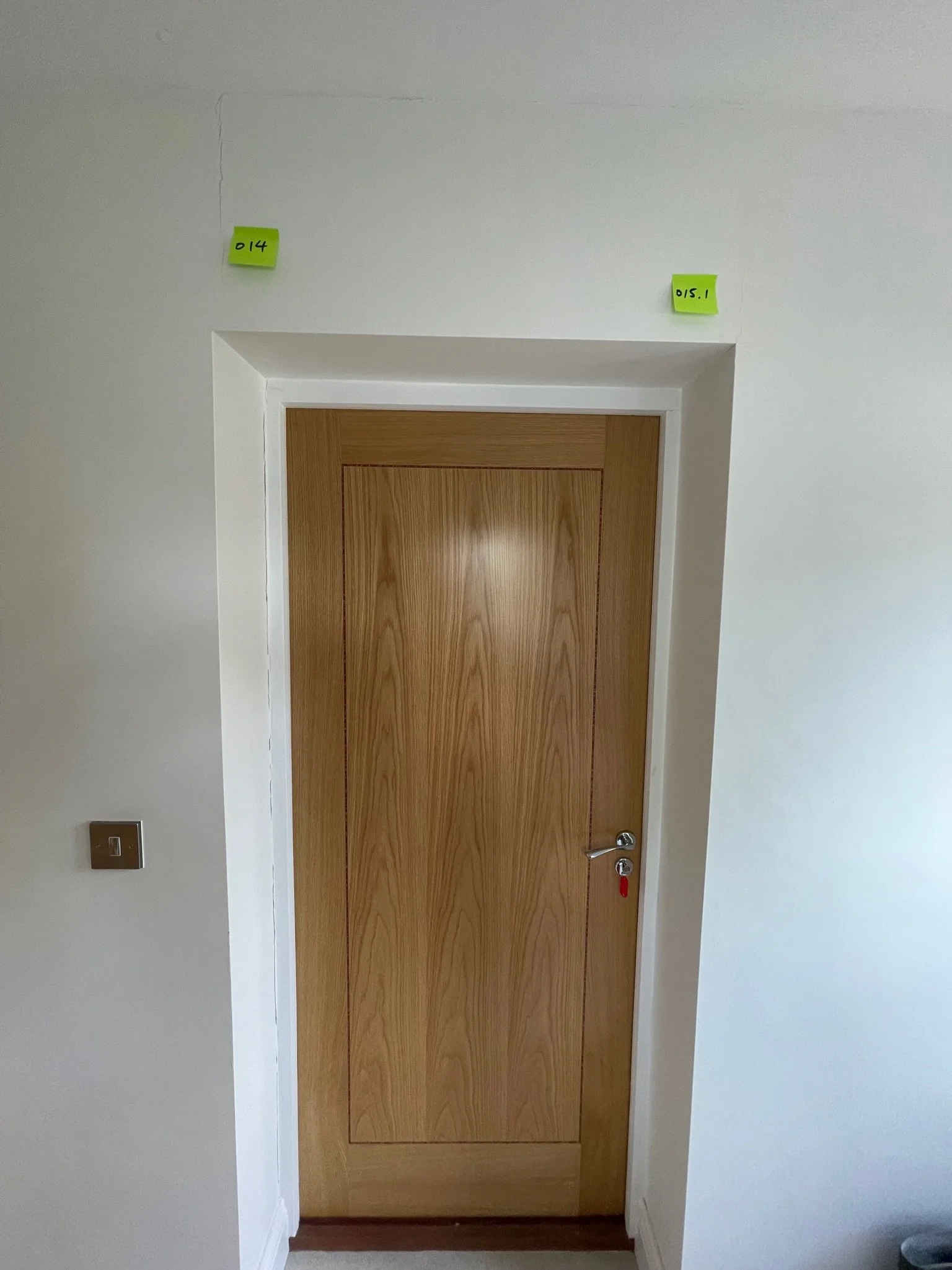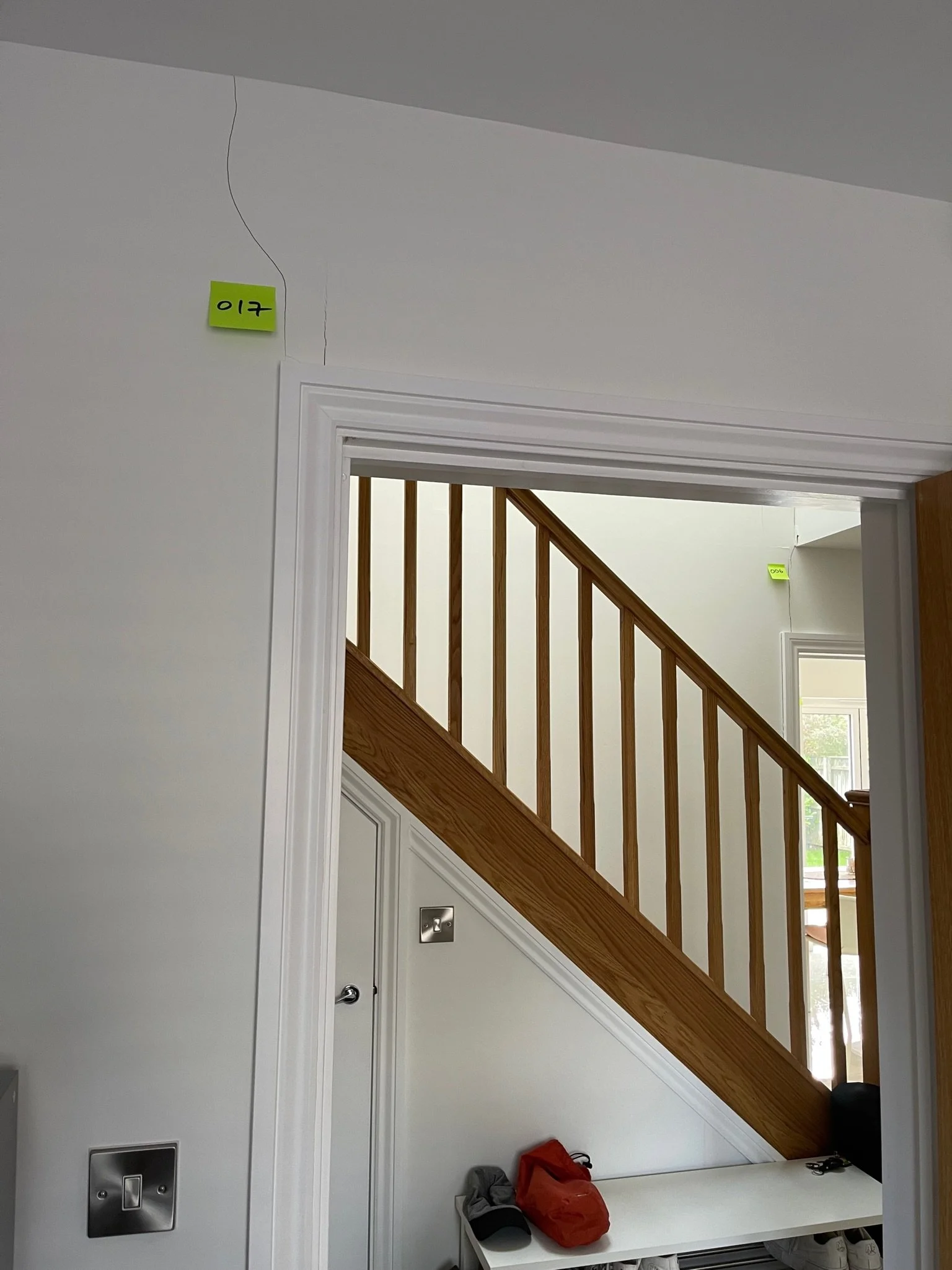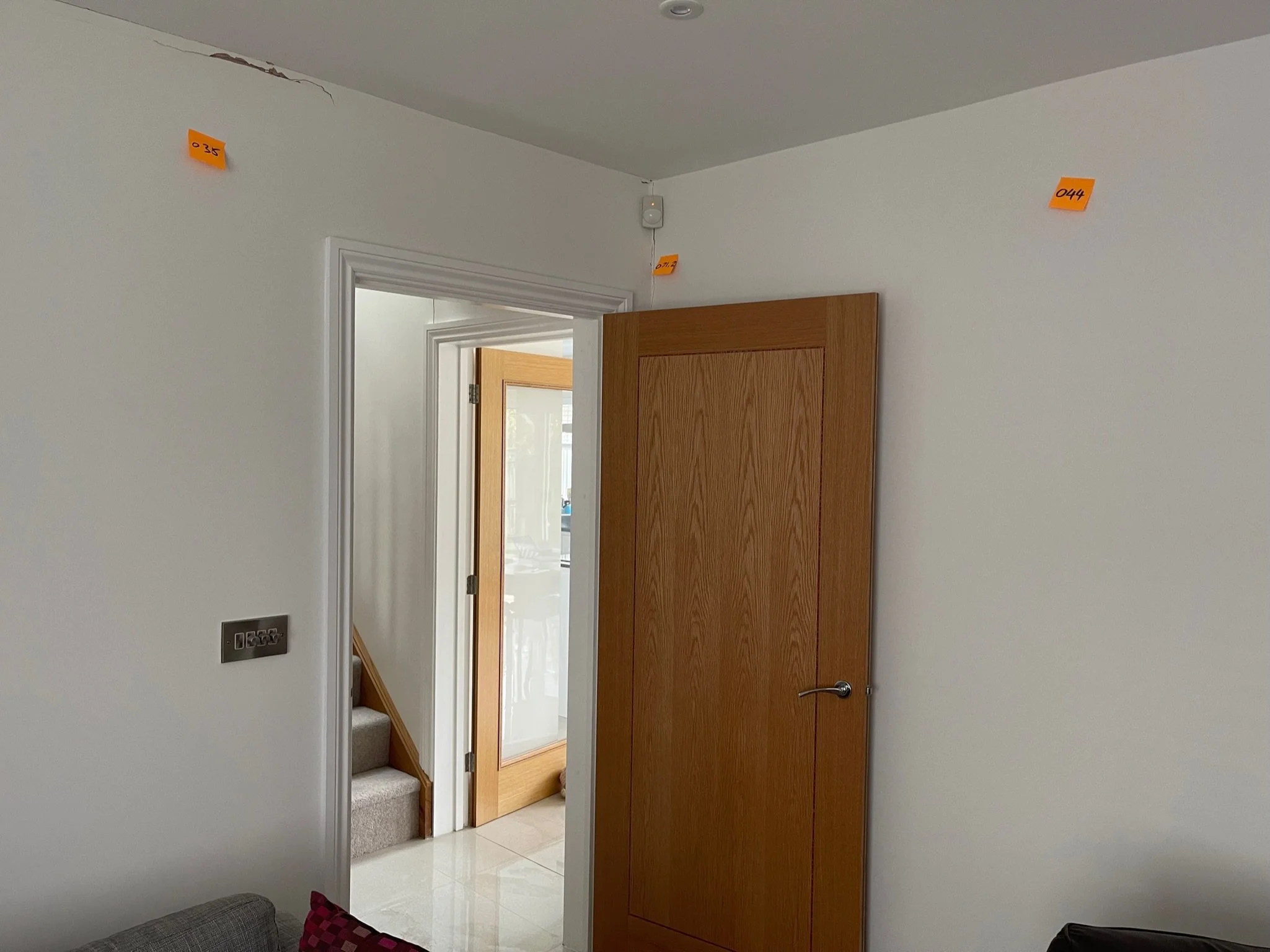 Interior room with wooden door, staircase visible, orange sticky notes on walls, and light switch.