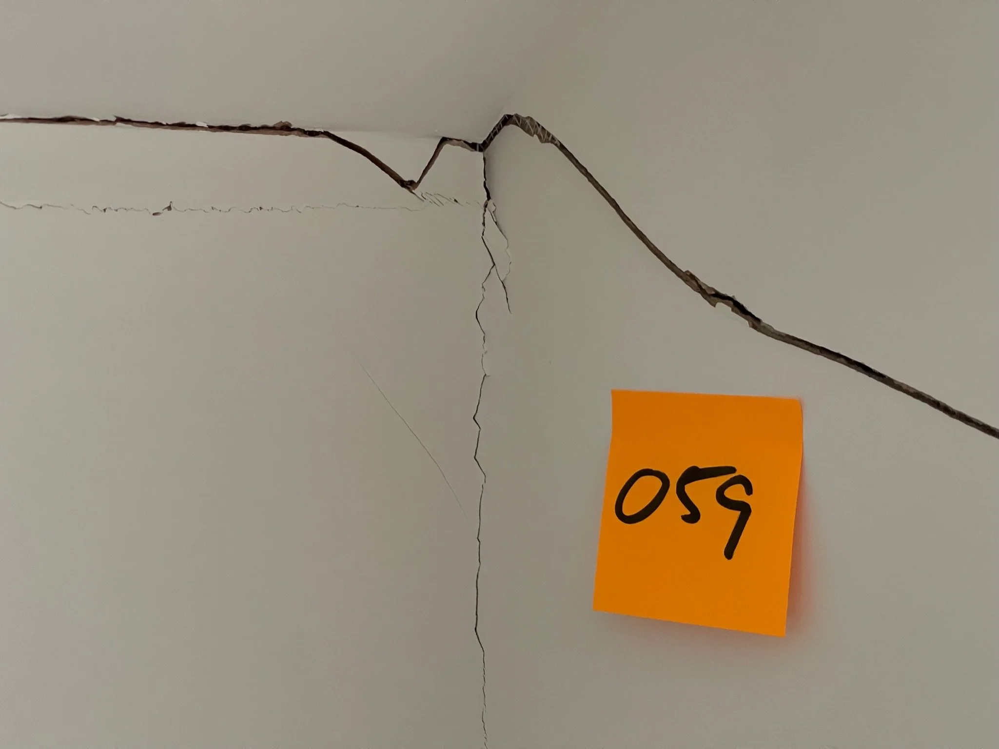Cracked wall corner with orange sticky note labeled "059."