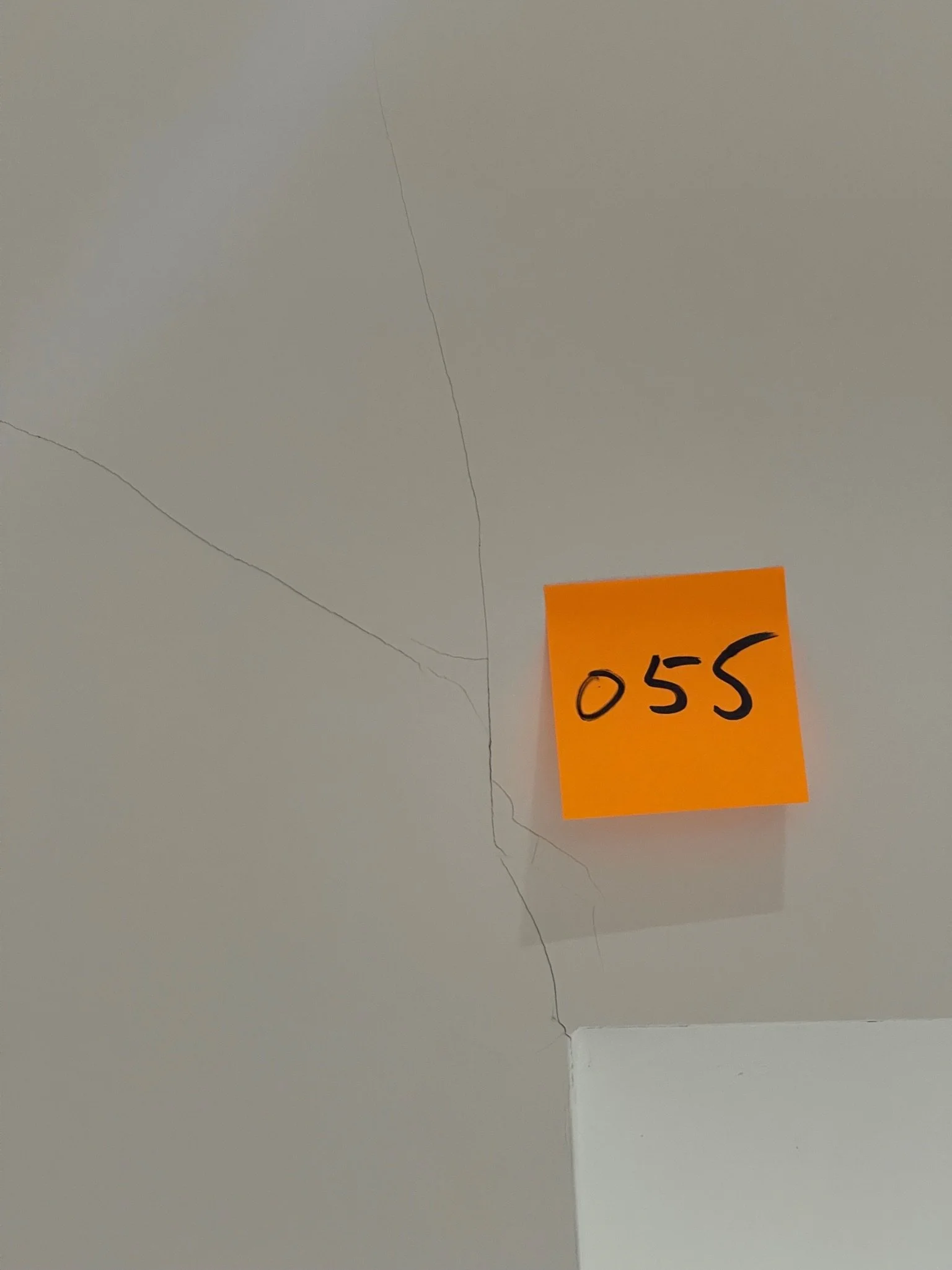 Wall with a crack and orange sticky note labeled '055'