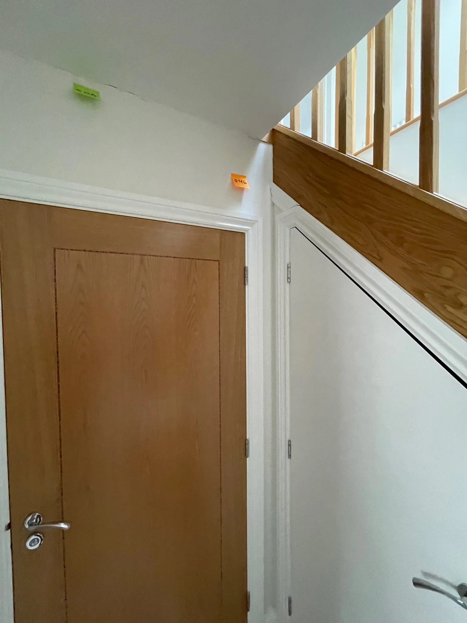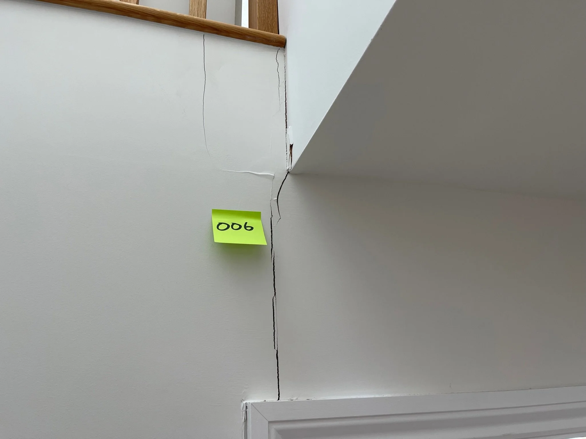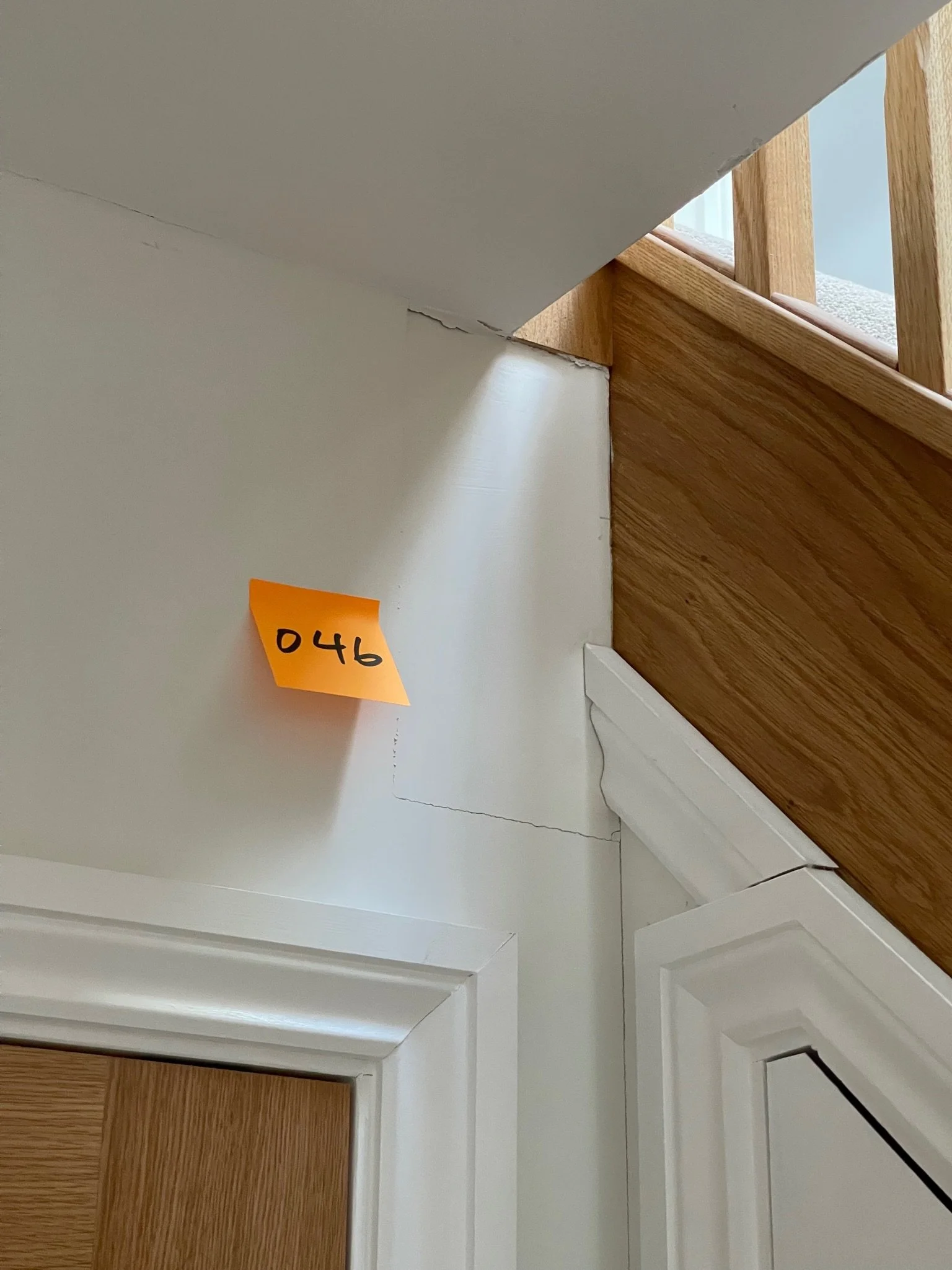 Interior photo showing the corner of a staircase with wooden paneling and a visible wall crack. A yellow sticky note labeled "046" is attached to the wall.