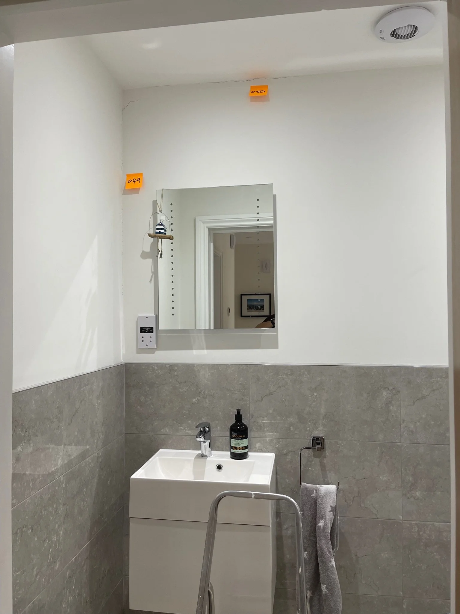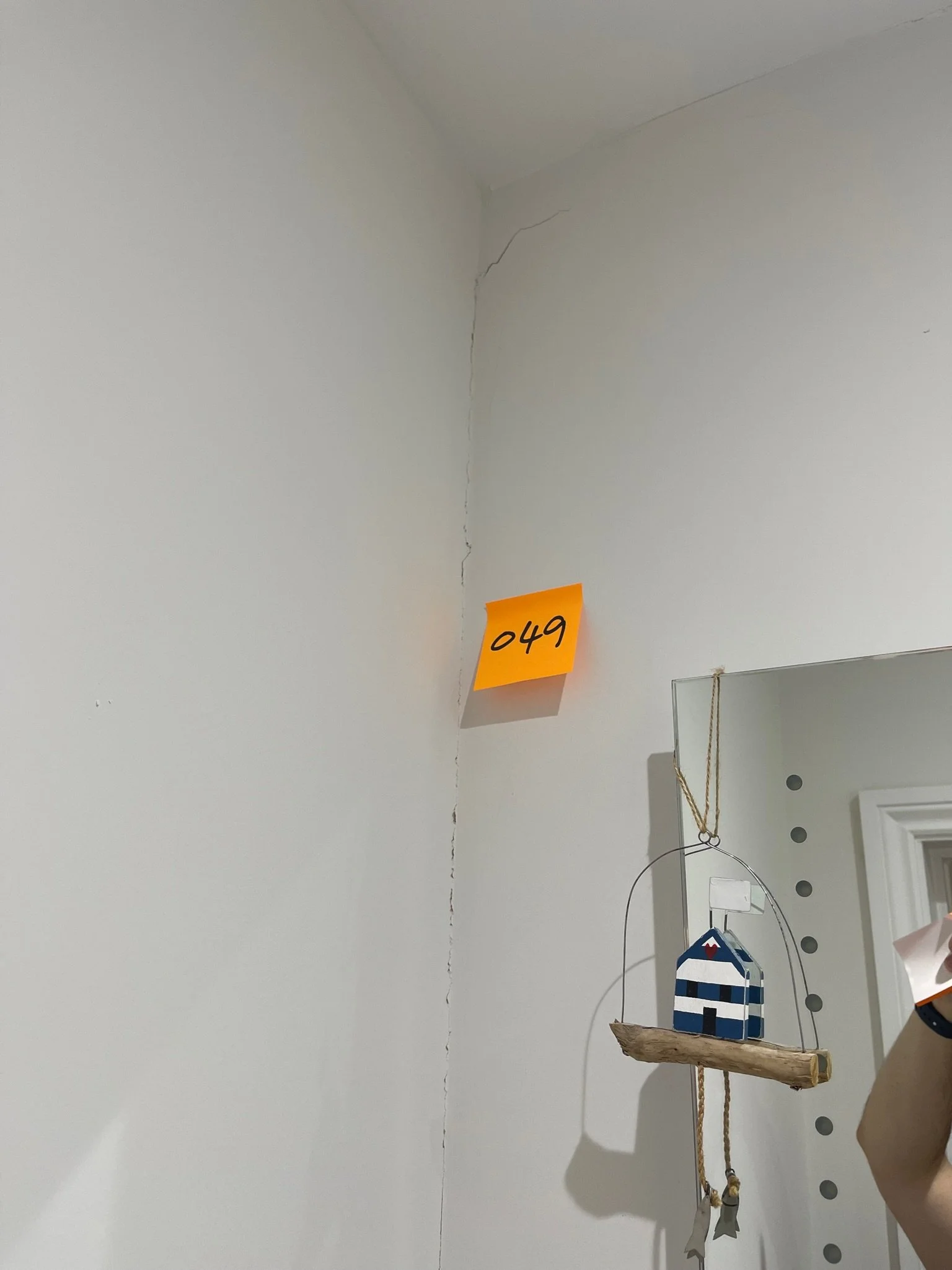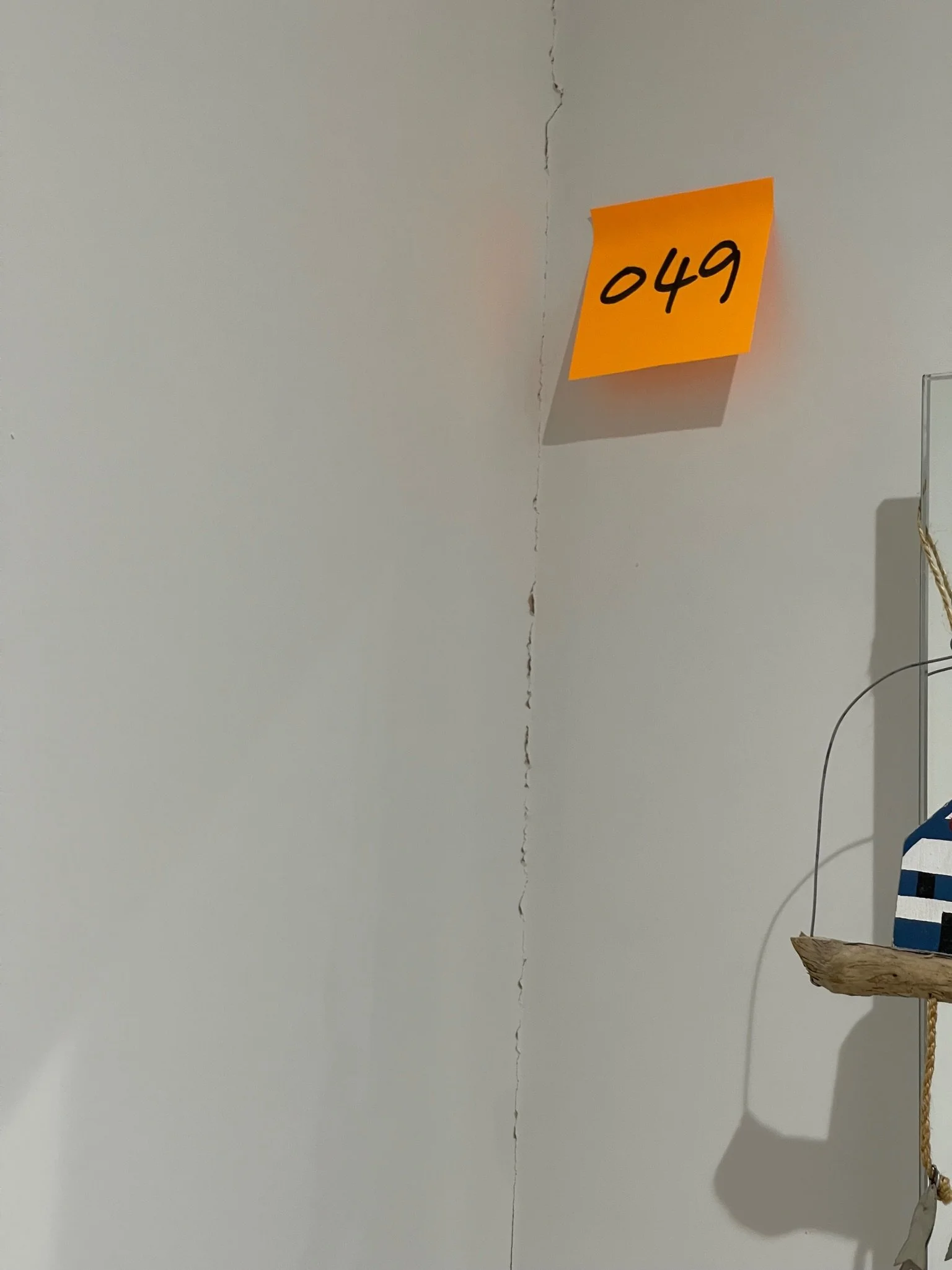 Room corner with crack, sticky note with "049", decorative hanging boat