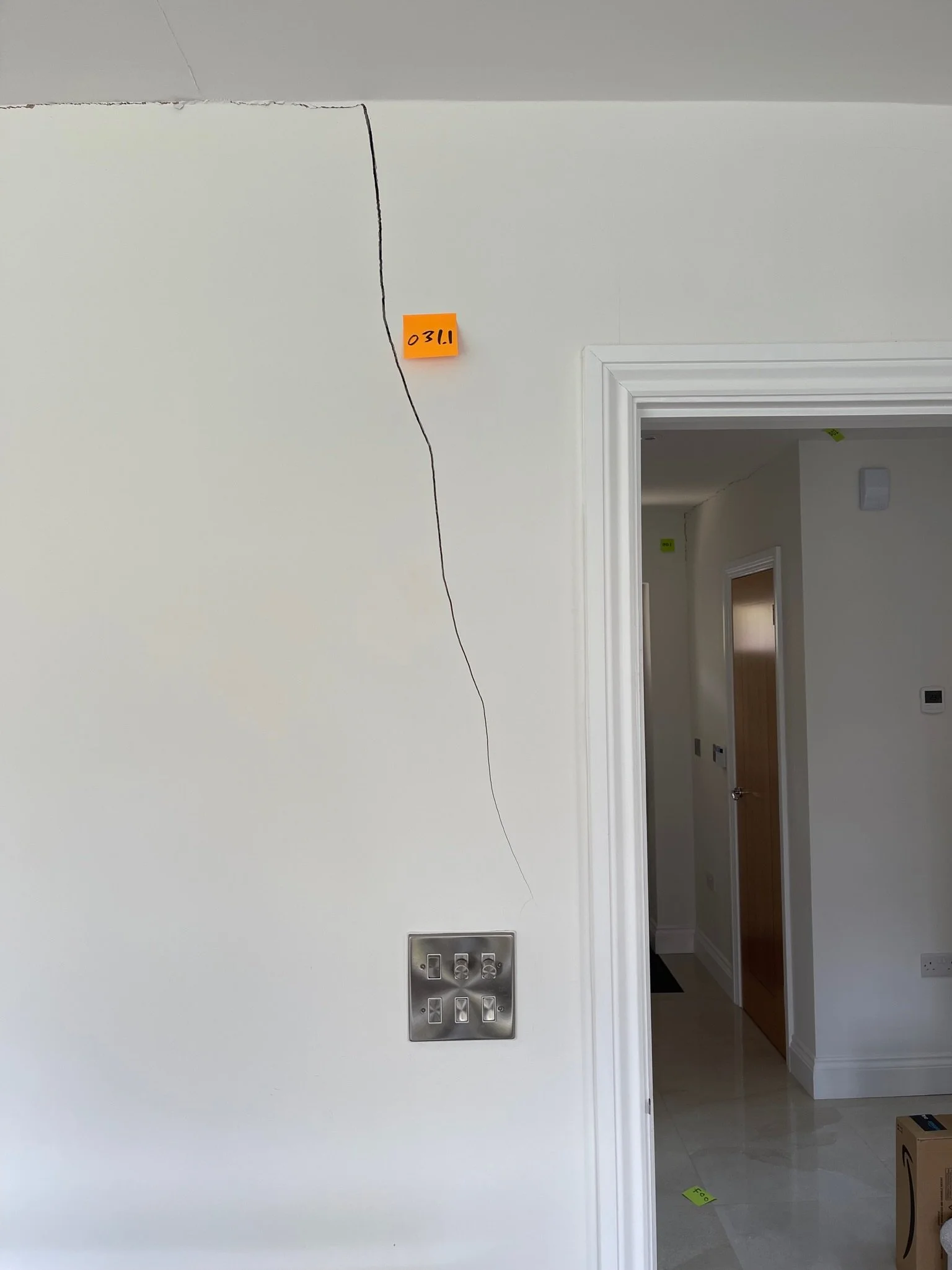 Interior wall with a crack marked in black, orange sticky note labeled '0311', and a light switch panel nearby. Partial view of a doorway leading to a hallway.