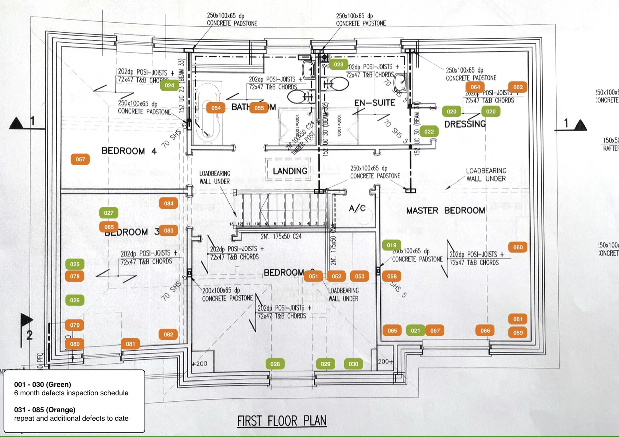 Floor plan of a first floor layout with labeled rooms including Bedroom 4, Bedroom 3, Bedroom 2, Master Bedroom, Bathroom, En-suite, Dressing area, and Landing. The plan includes structural details like joists, load-bearing walls, and padstone dimens