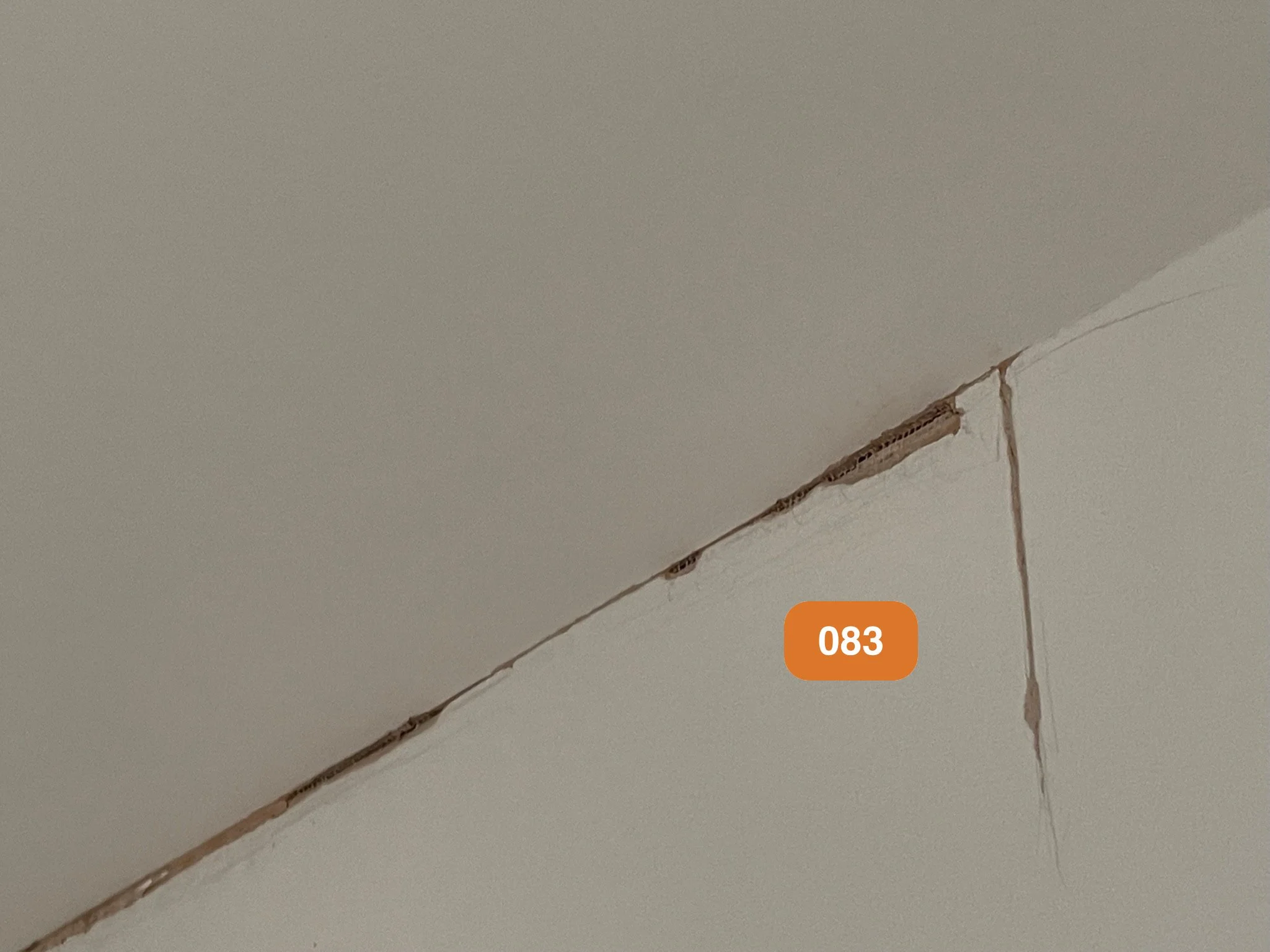 Close-up of cracked drywall ceiling with a label "083"