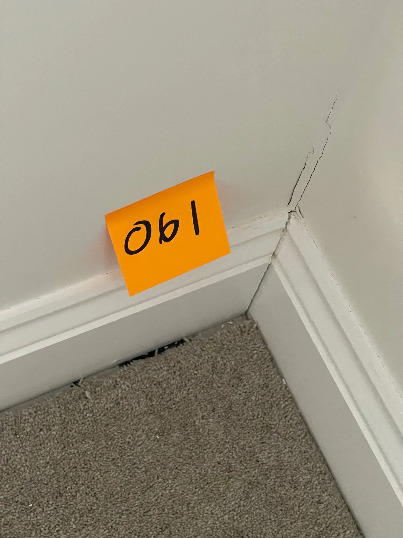 Orange sticky note with number 061 on a wall corner above carpet, showing visible cracks.