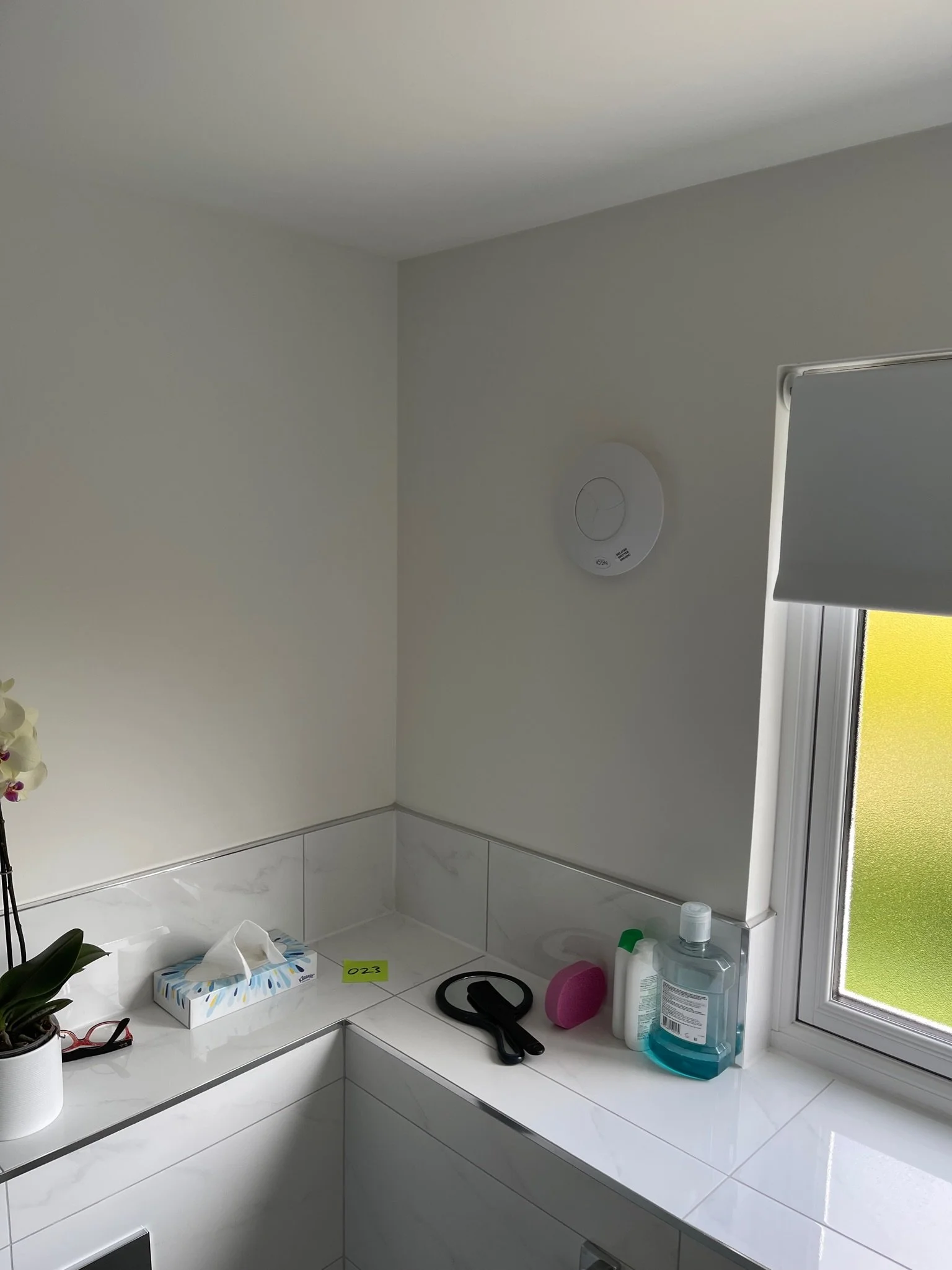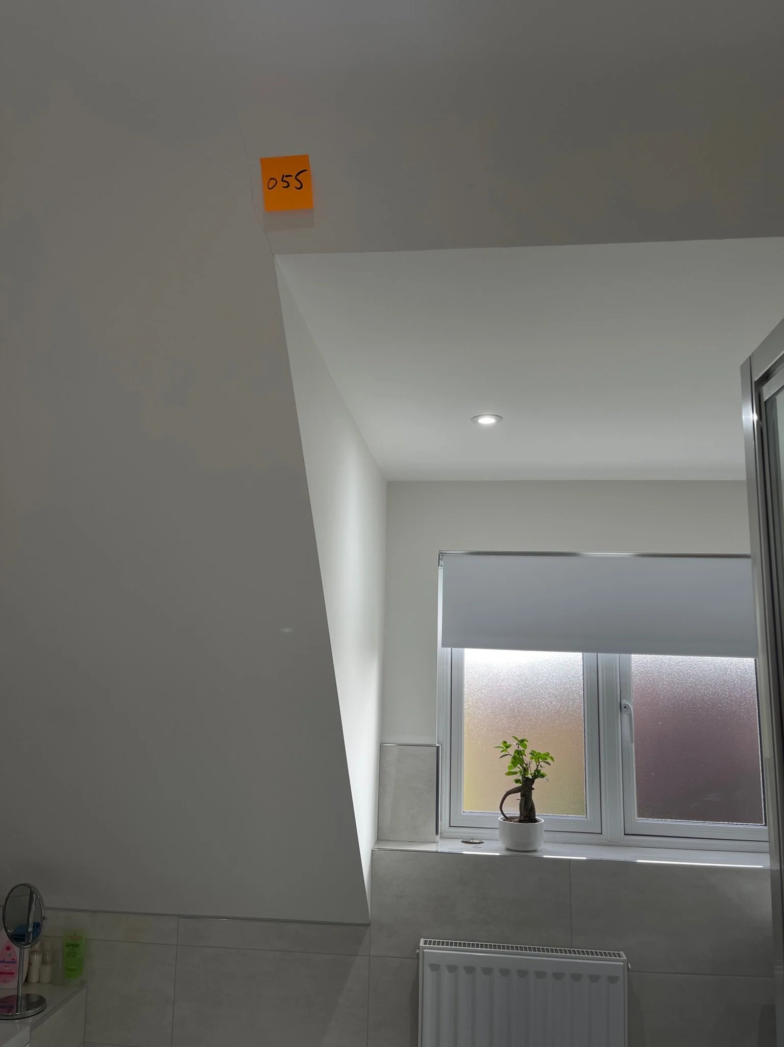 Bathroom corner with window, small potted plant, post-it note on ceiling, radiator, and toiletries on a shelf.
