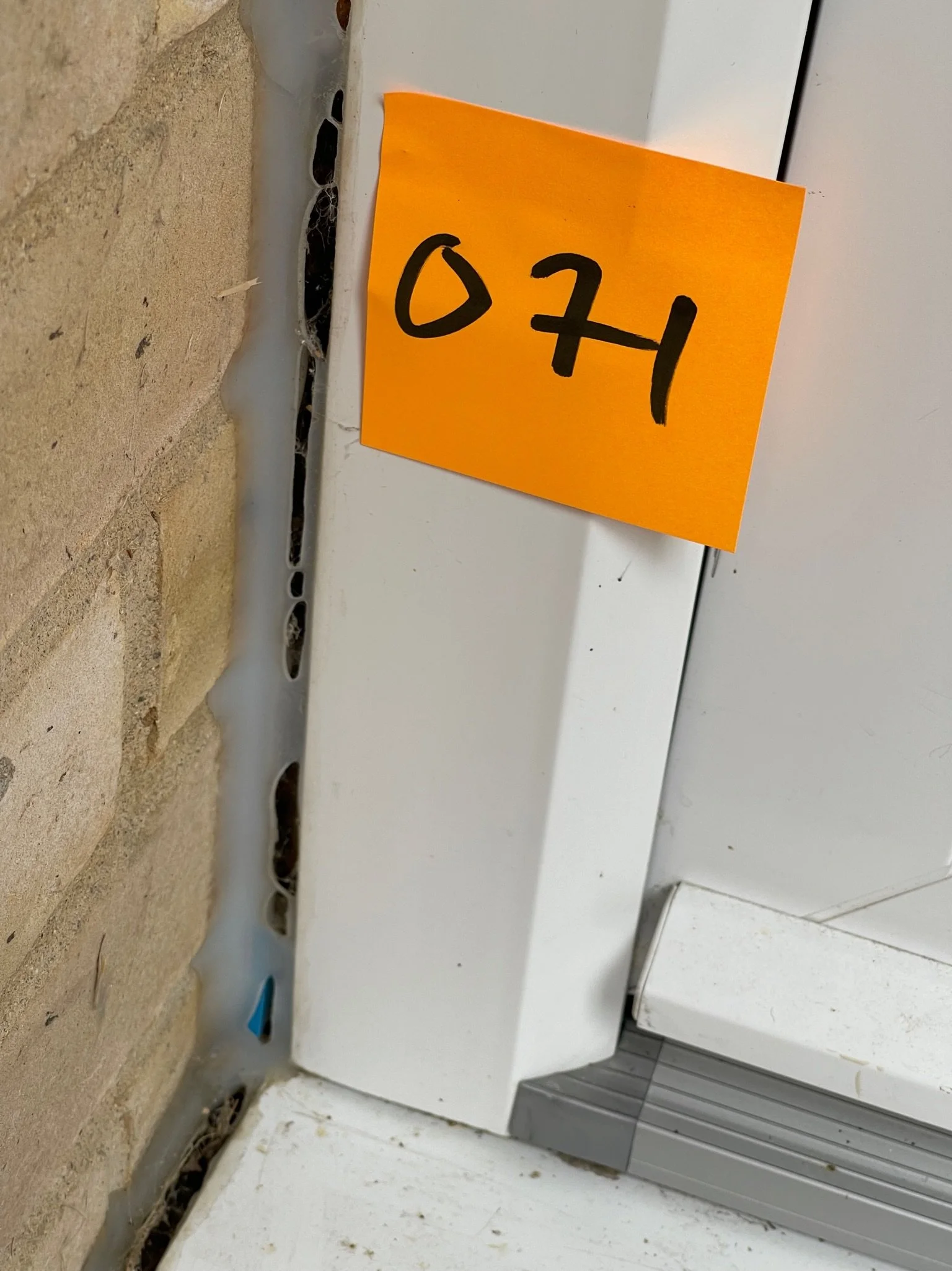 Corner of a brick wall meeting a white door frame with an orange sticky note labeled '071' attached to the door frame.