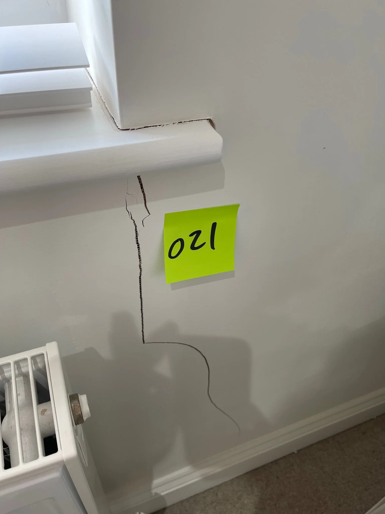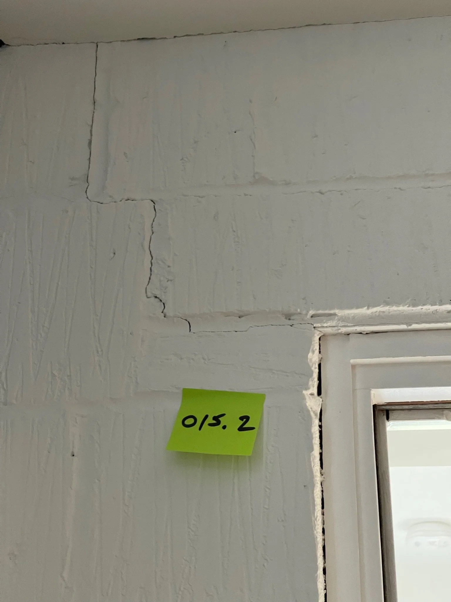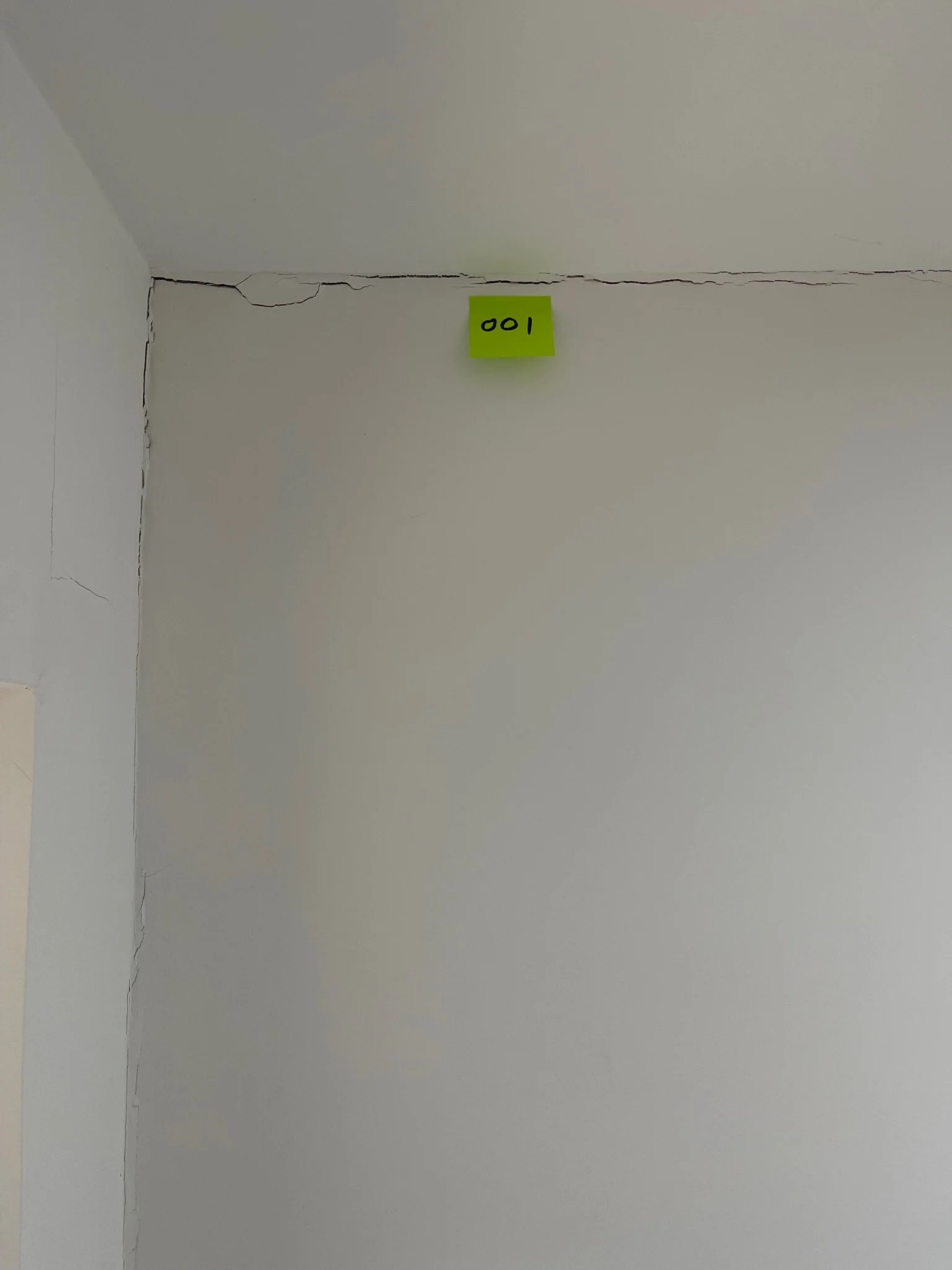 Cracks on a white wall corner with a yellow sticky note featuring a handwritten number.