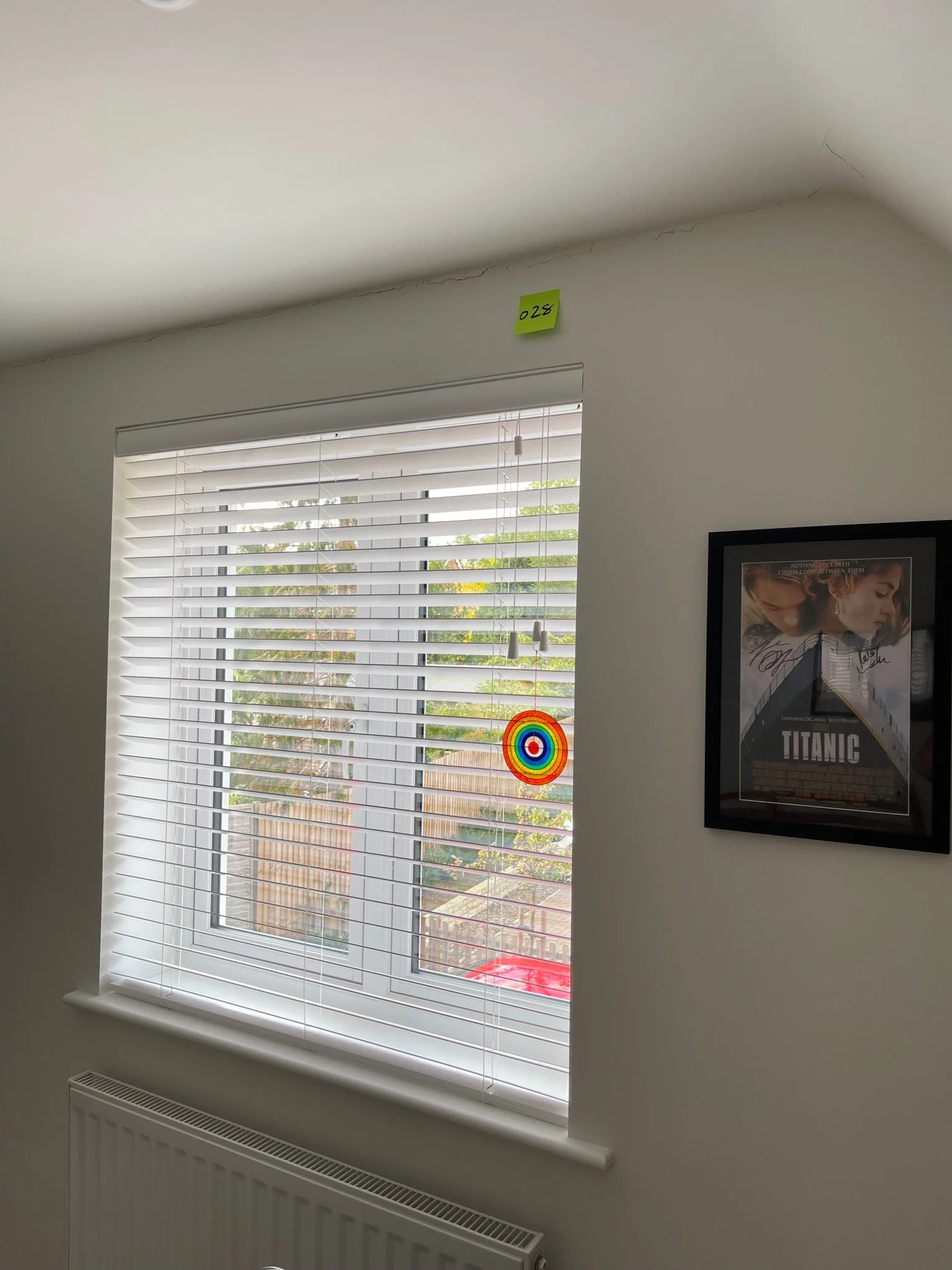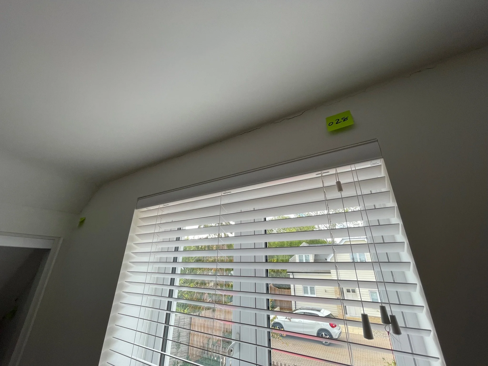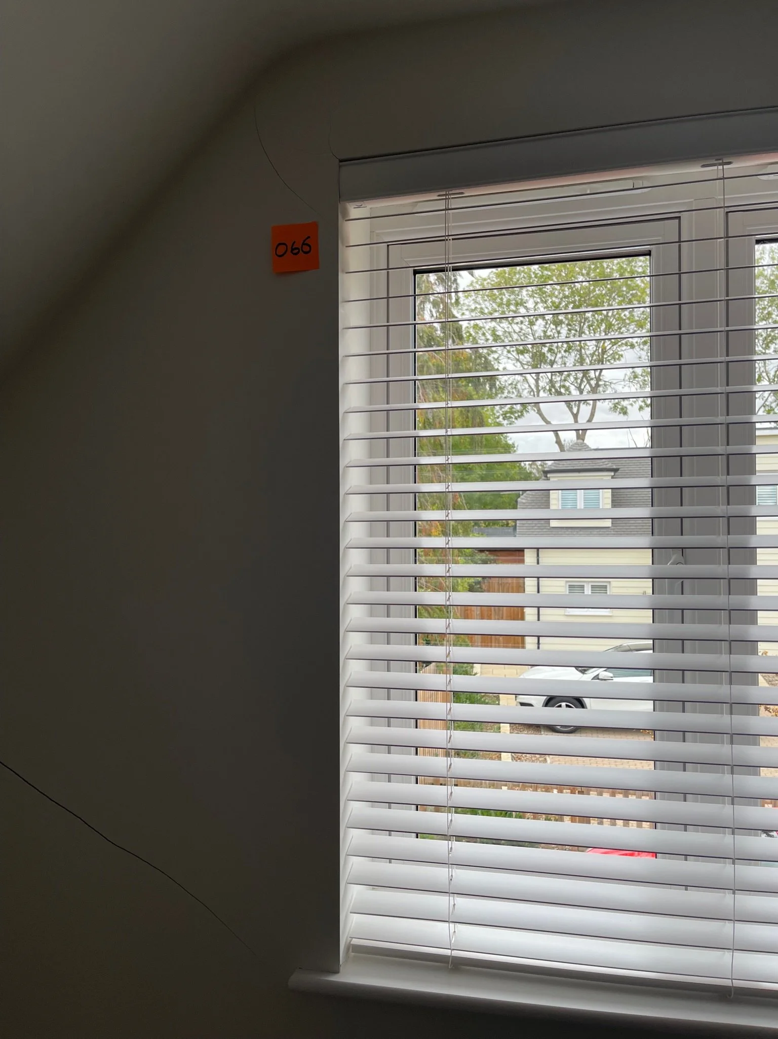 Window with white horizontal blinds partially open, view of outdoors showing trees and a car. Orange label with "066" on the wall.